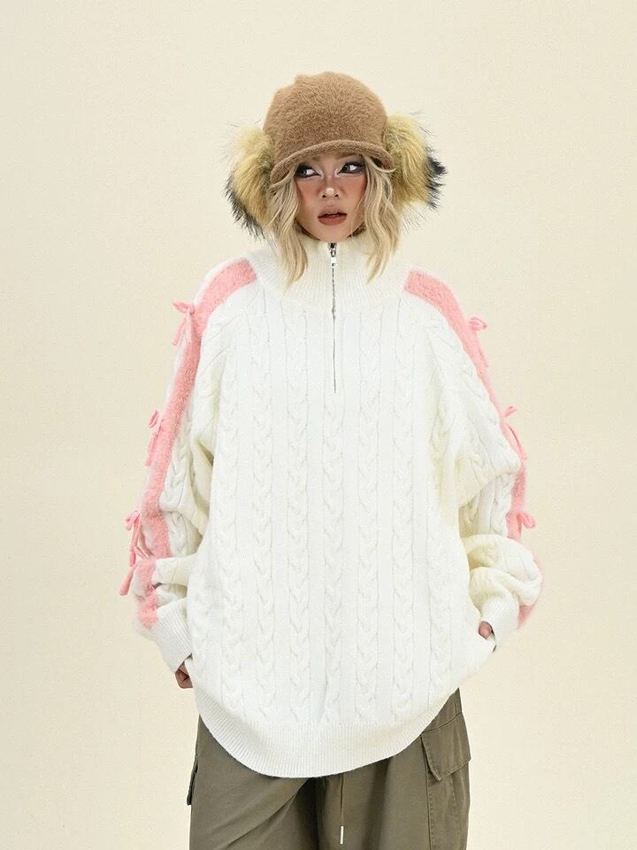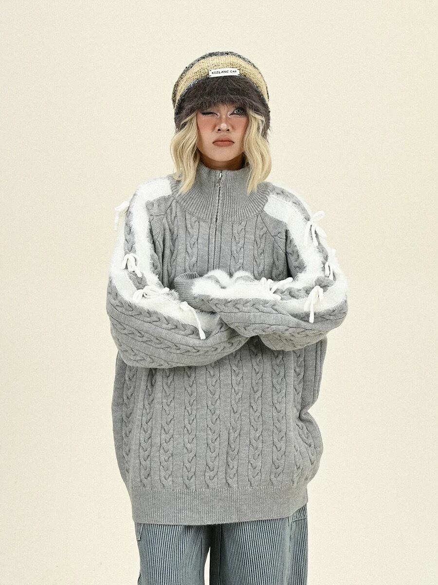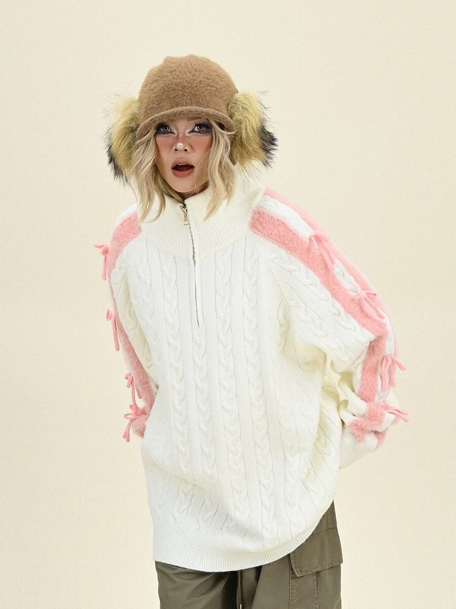 白 グレー ピンク リボン カーディガン セーター