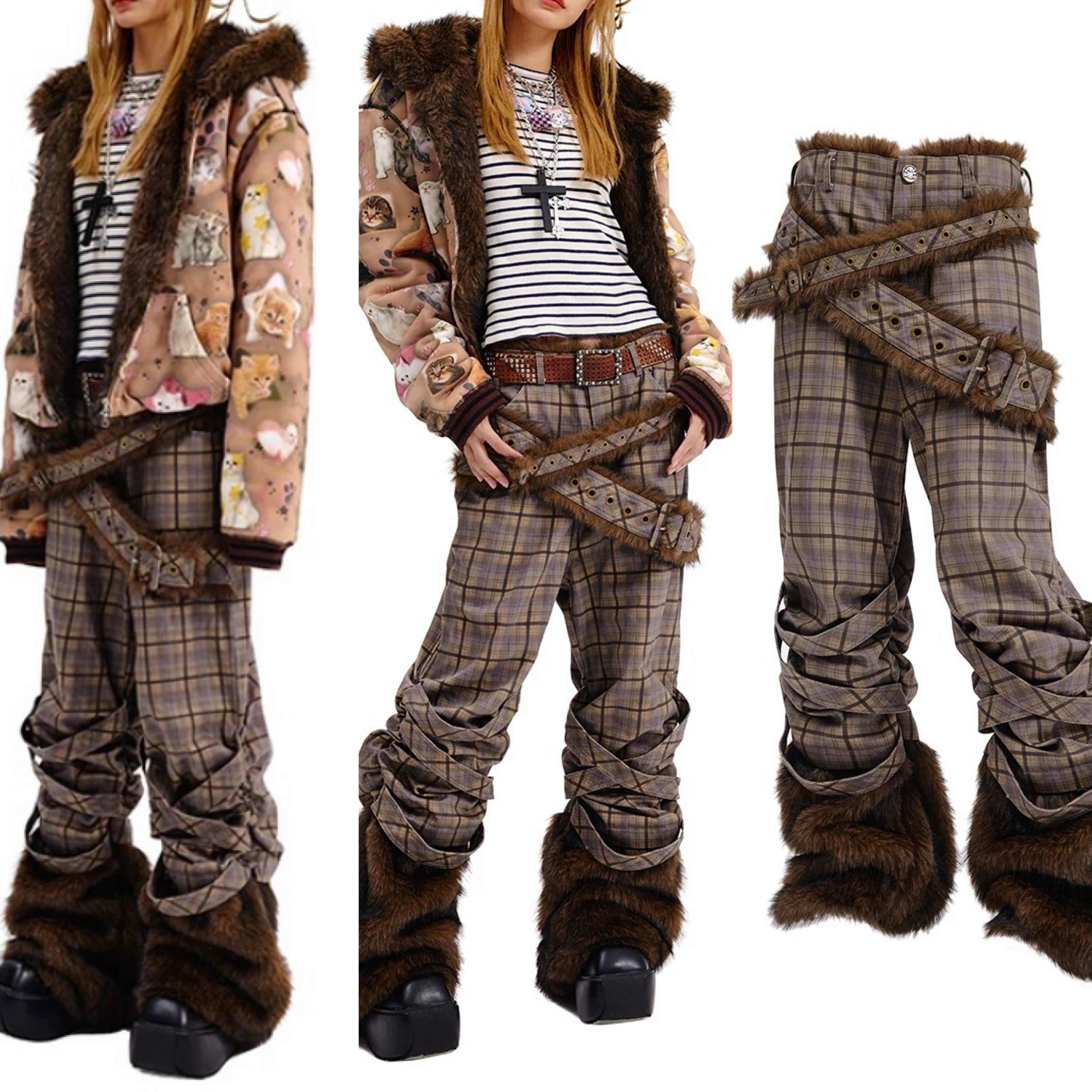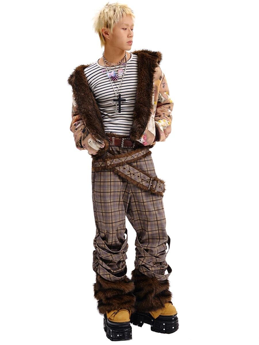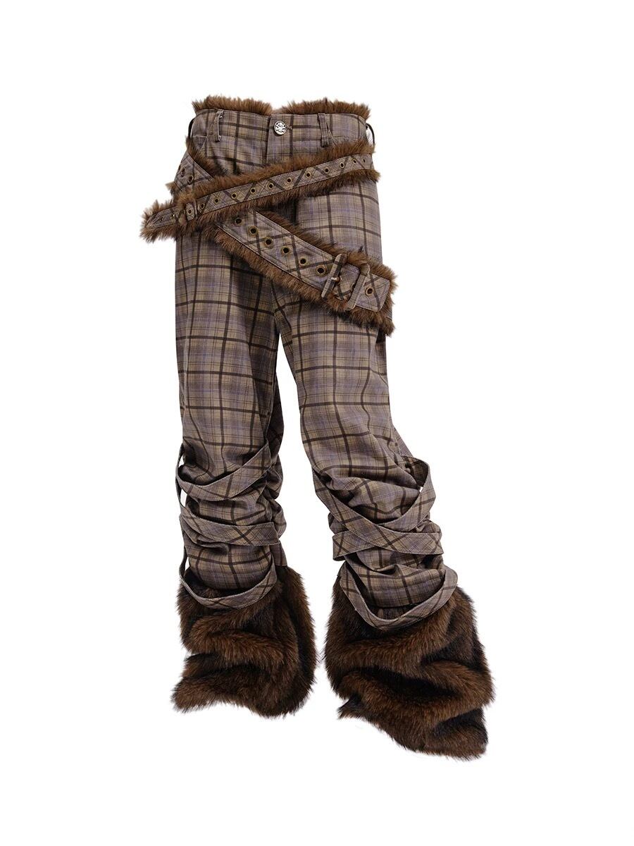 【ユニセックス】茶色 チェック ファー パンツ べるとベルト ボトムス ファー