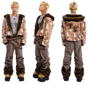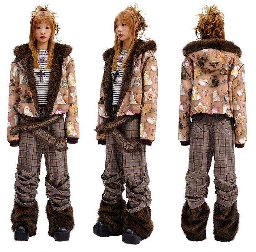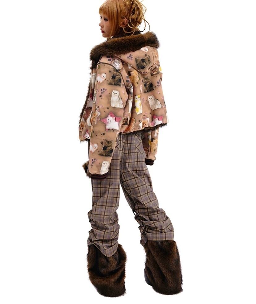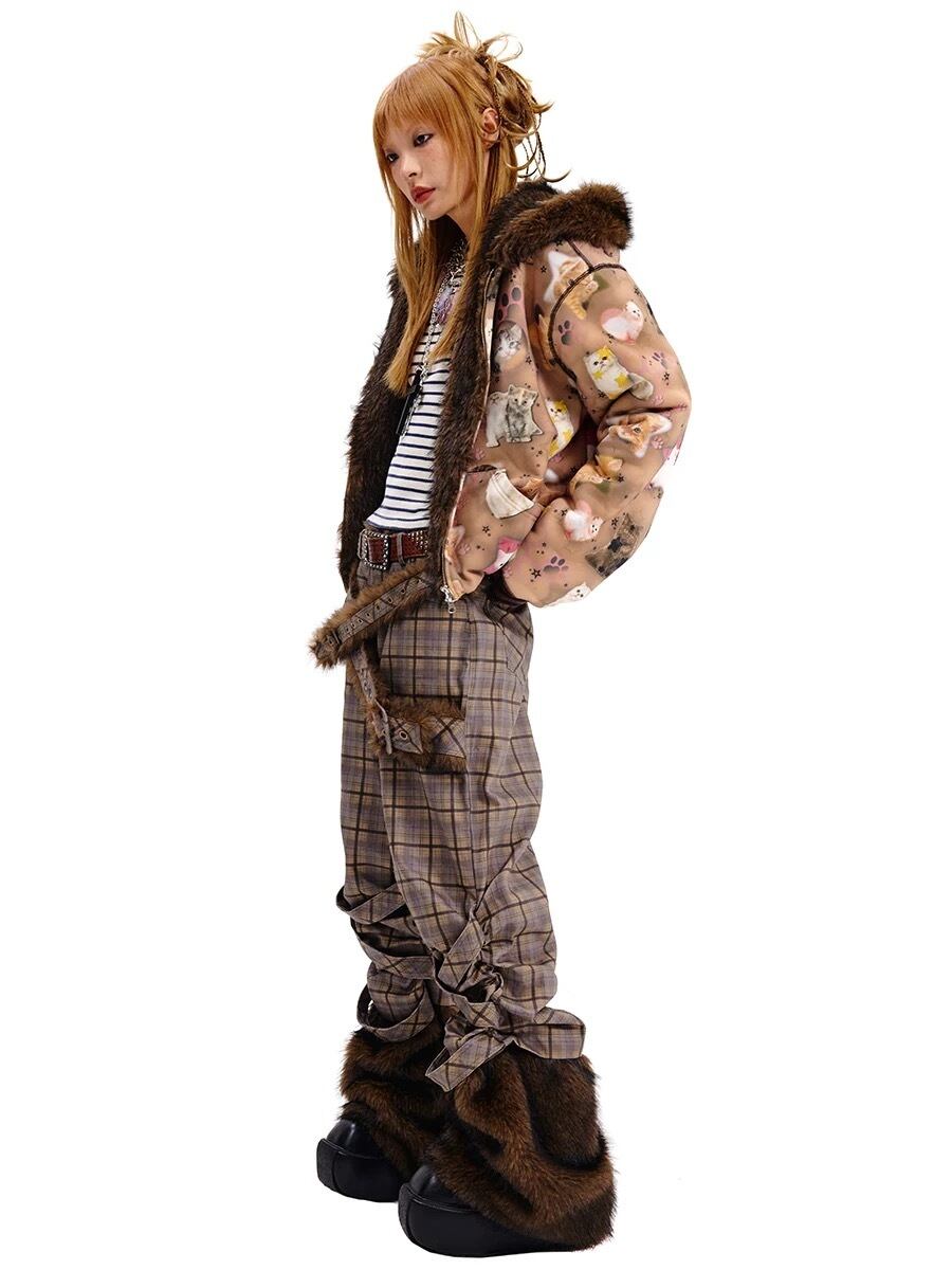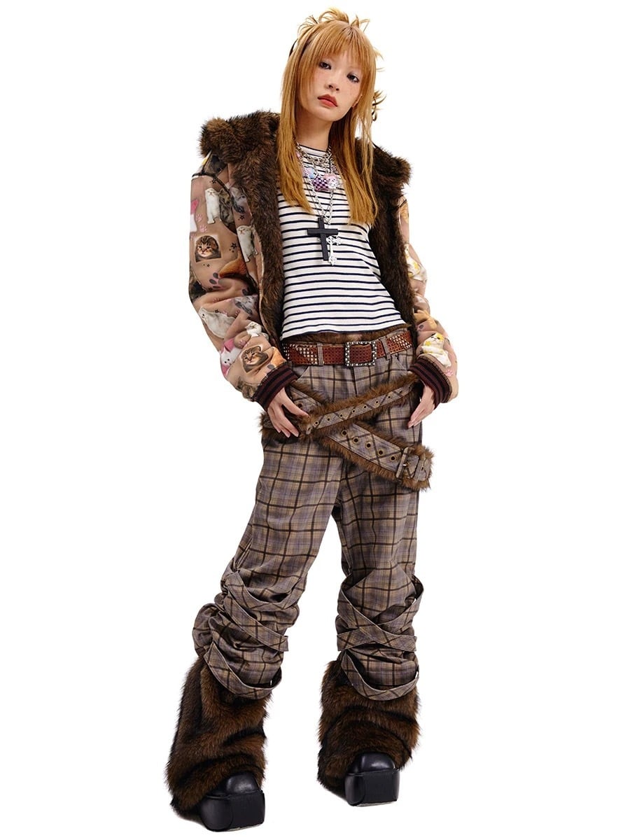 【ユニセックス】茶色 チェック ファー パンツ べるとベルト ボトムス ファー