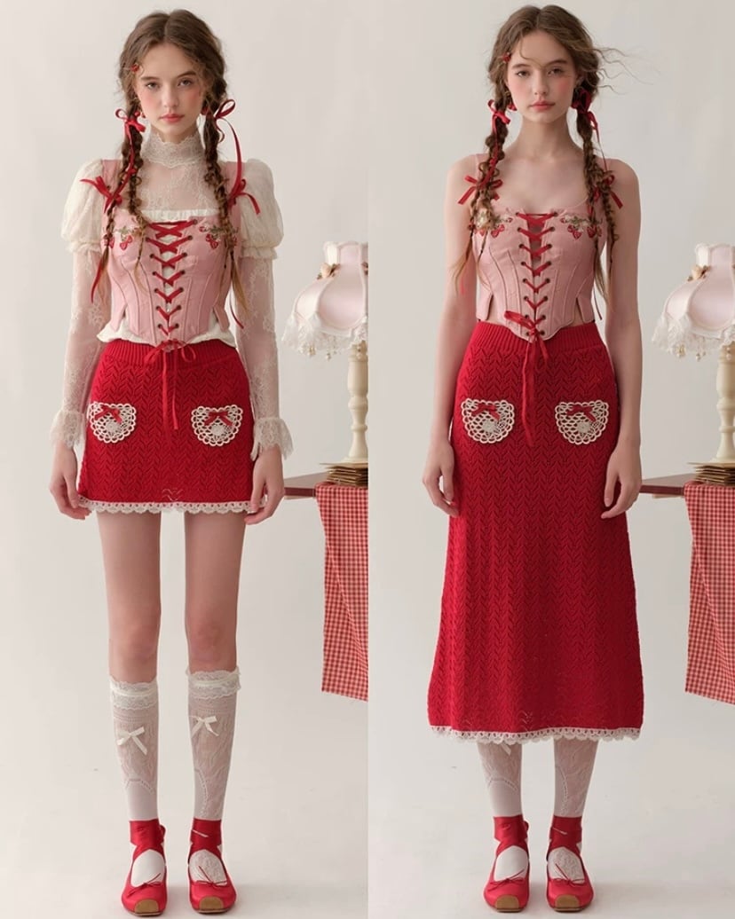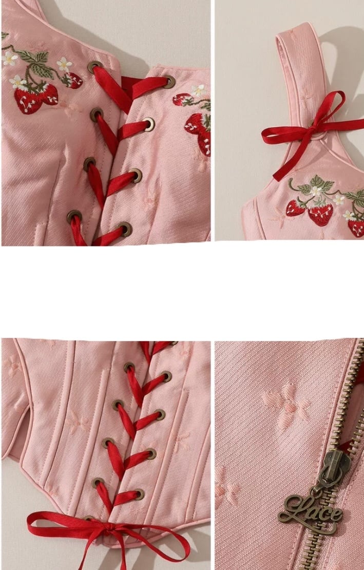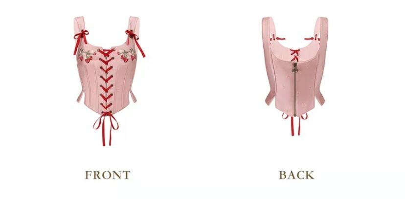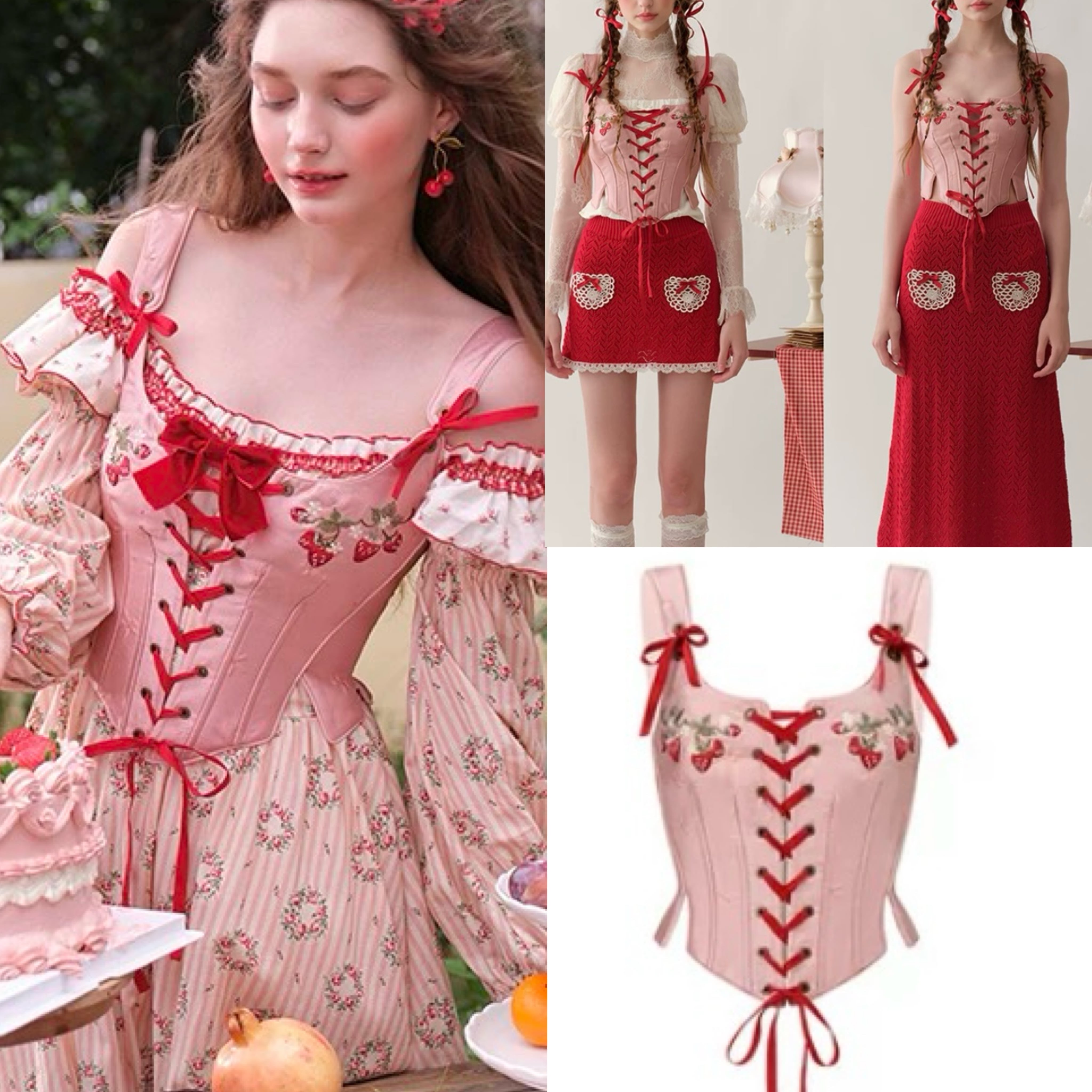 【コルセット】ピンク 編み上げ キャミソール 赤 リボン XL