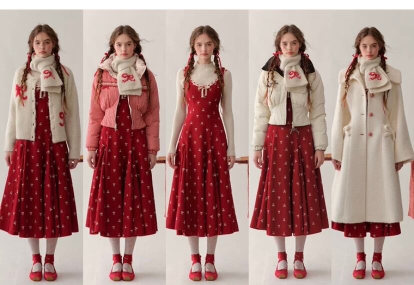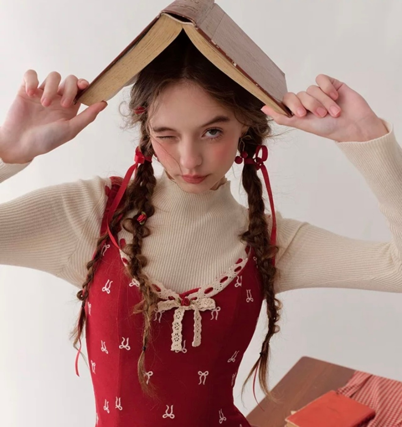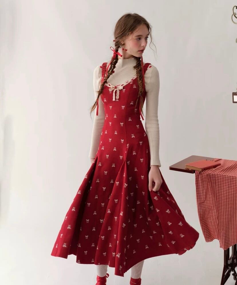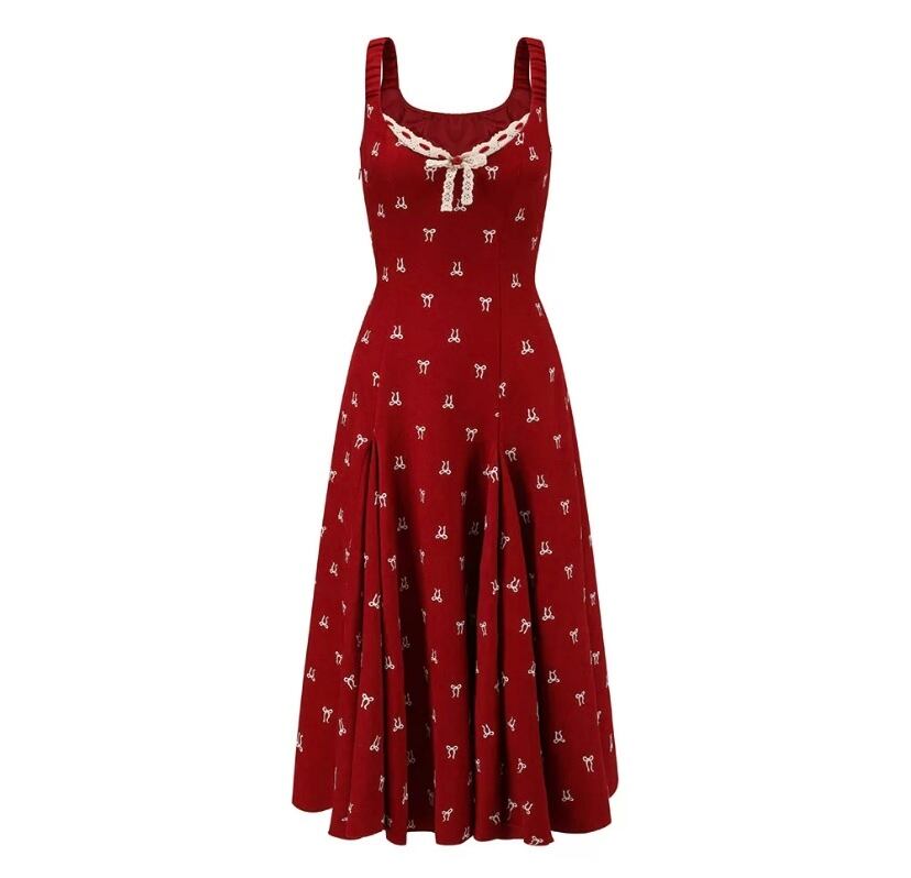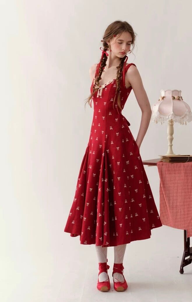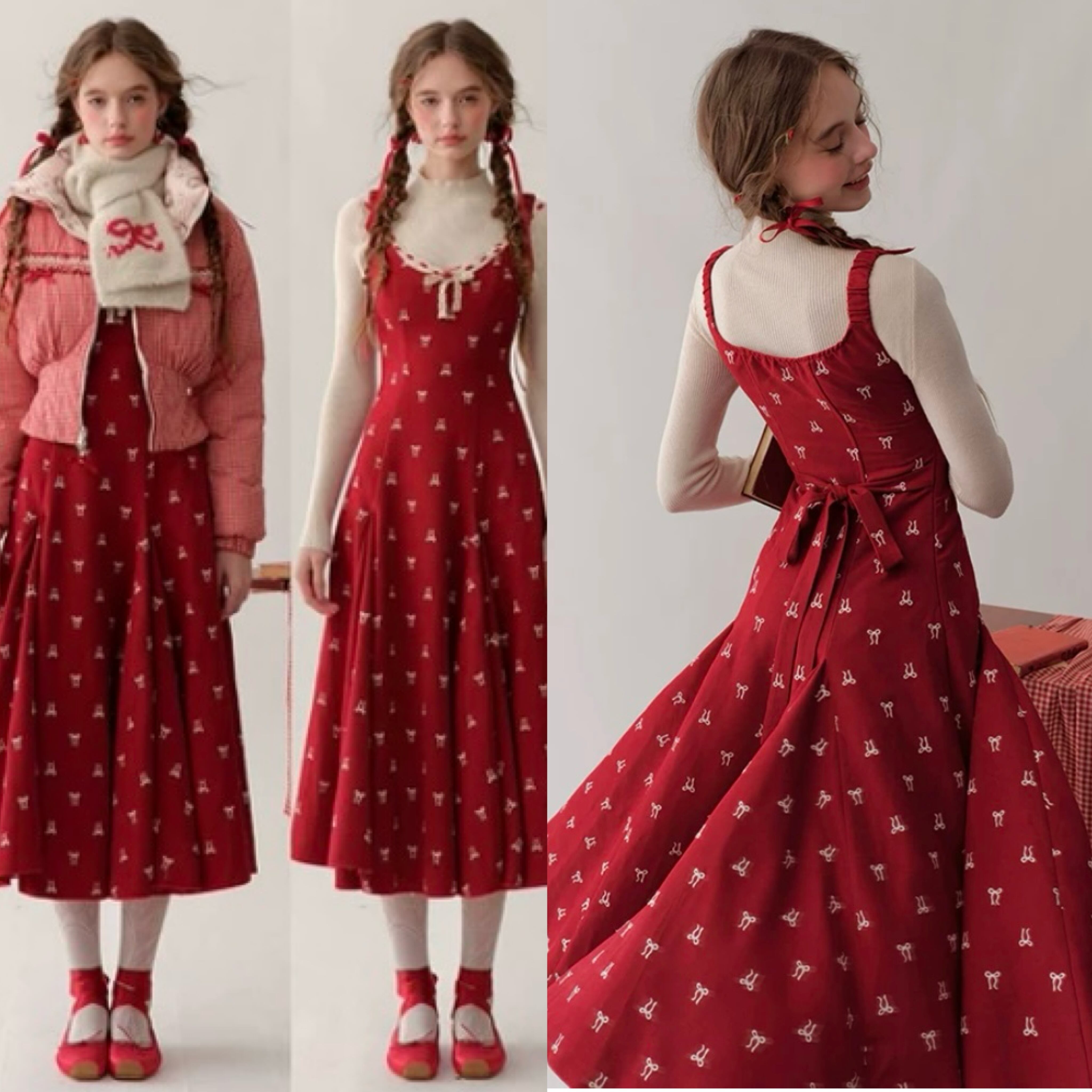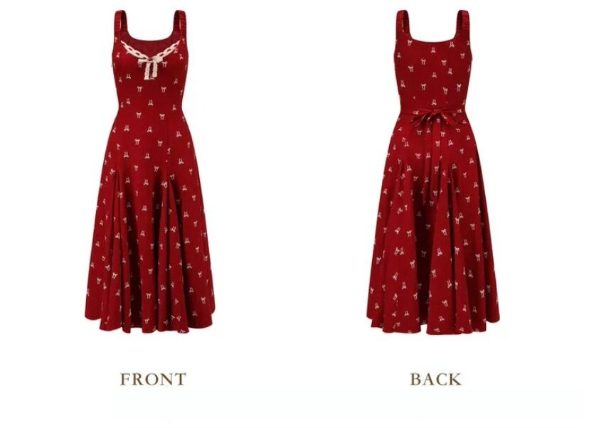 赤 茶色 リボン フレア ワンピース 可愛い XL