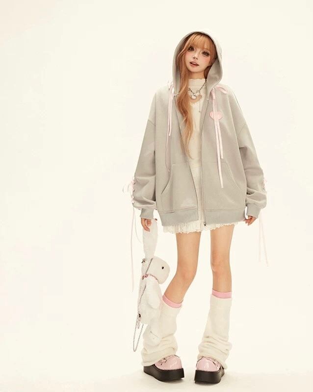 グレー パーカー リボン スウェット トレーナー ピンク ハート
