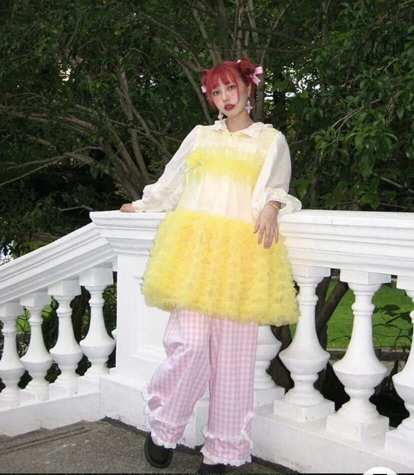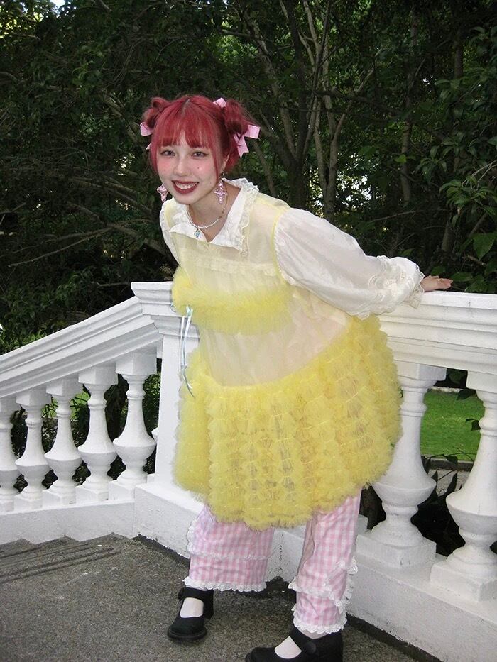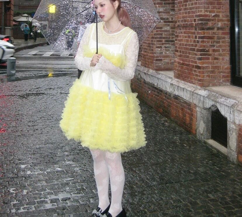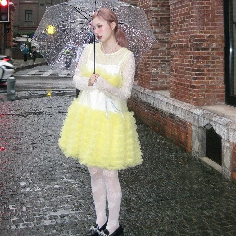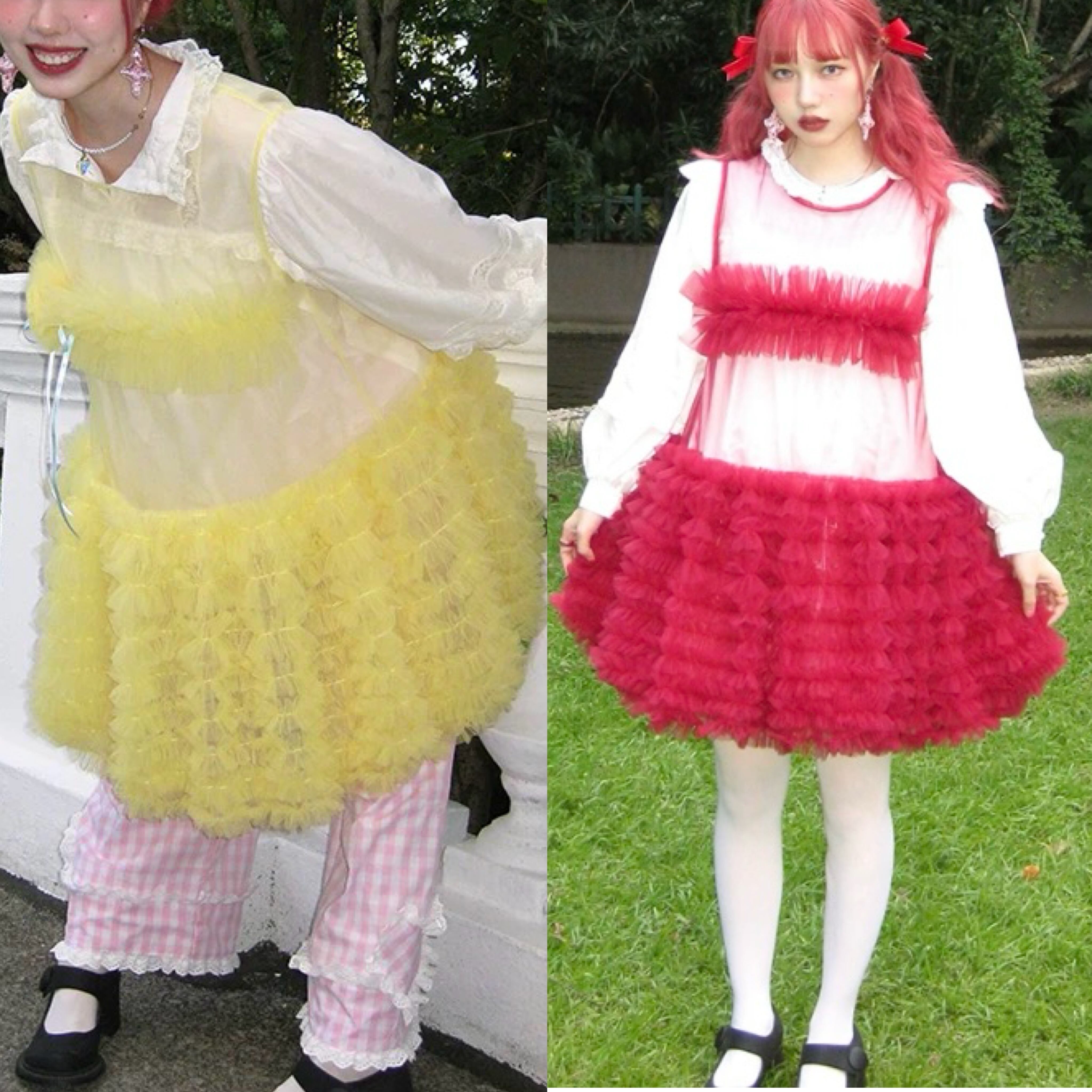 黄色 赤 シースルー 重ね着 可愛い ワンピース ドレス