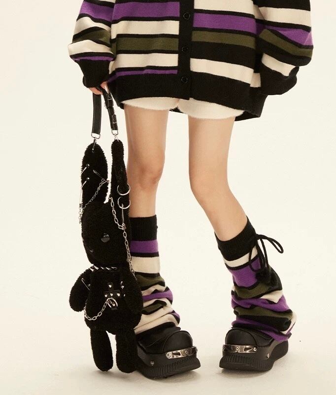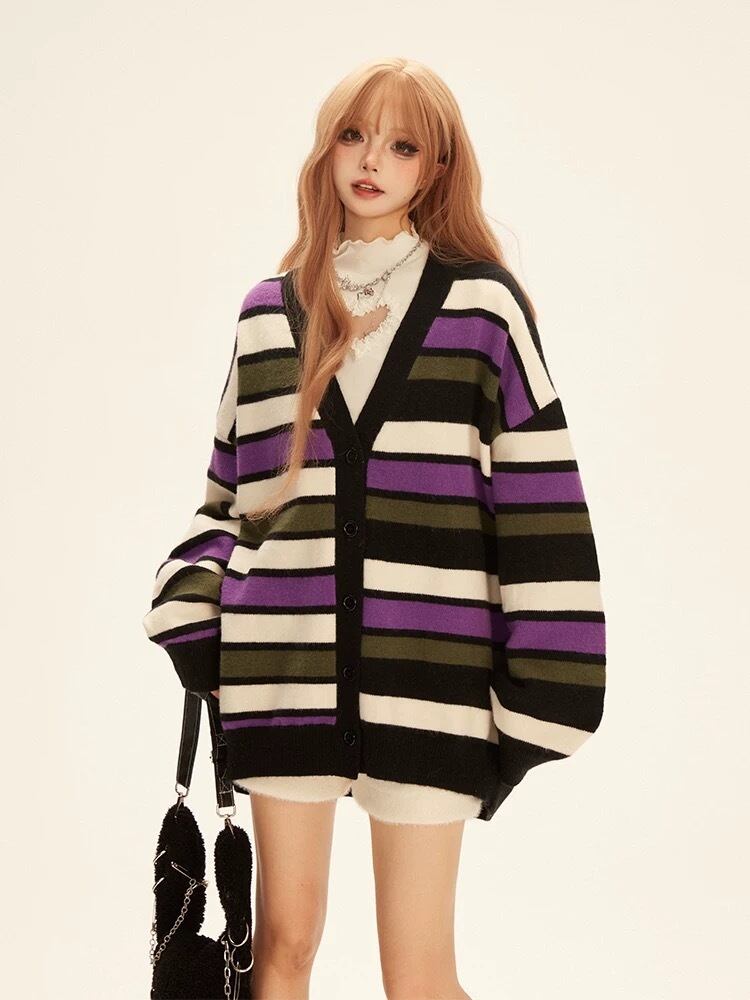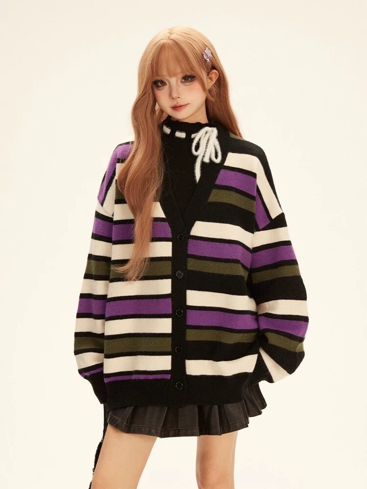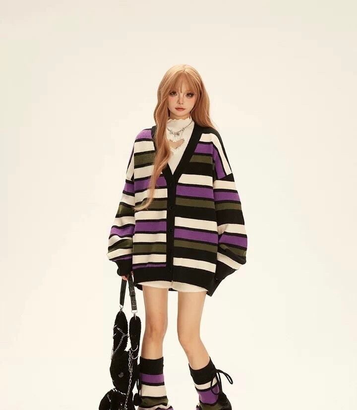紫 チェック ボーダー カーディガン セーター