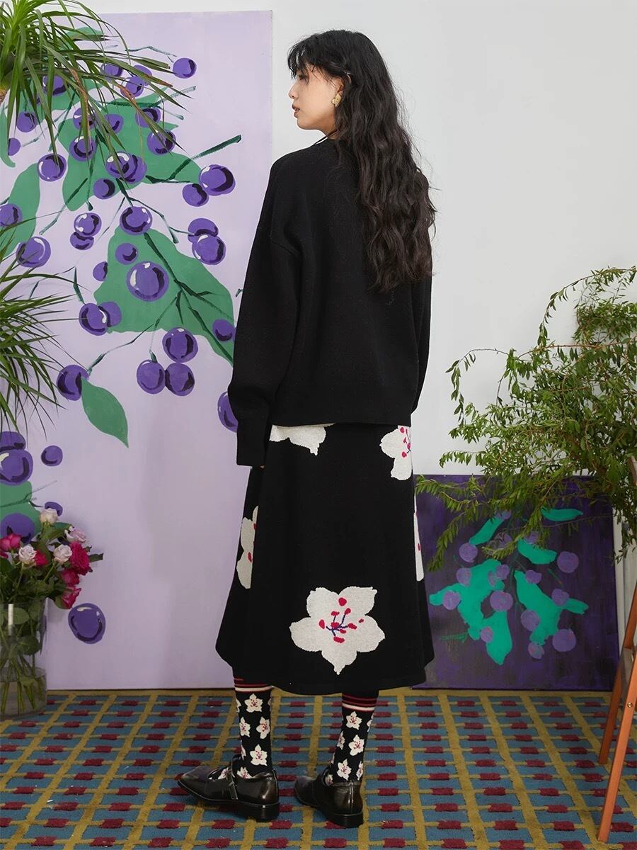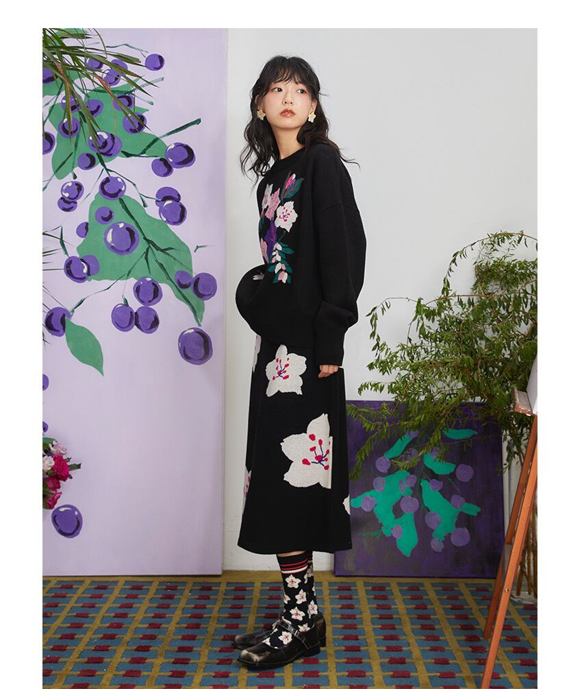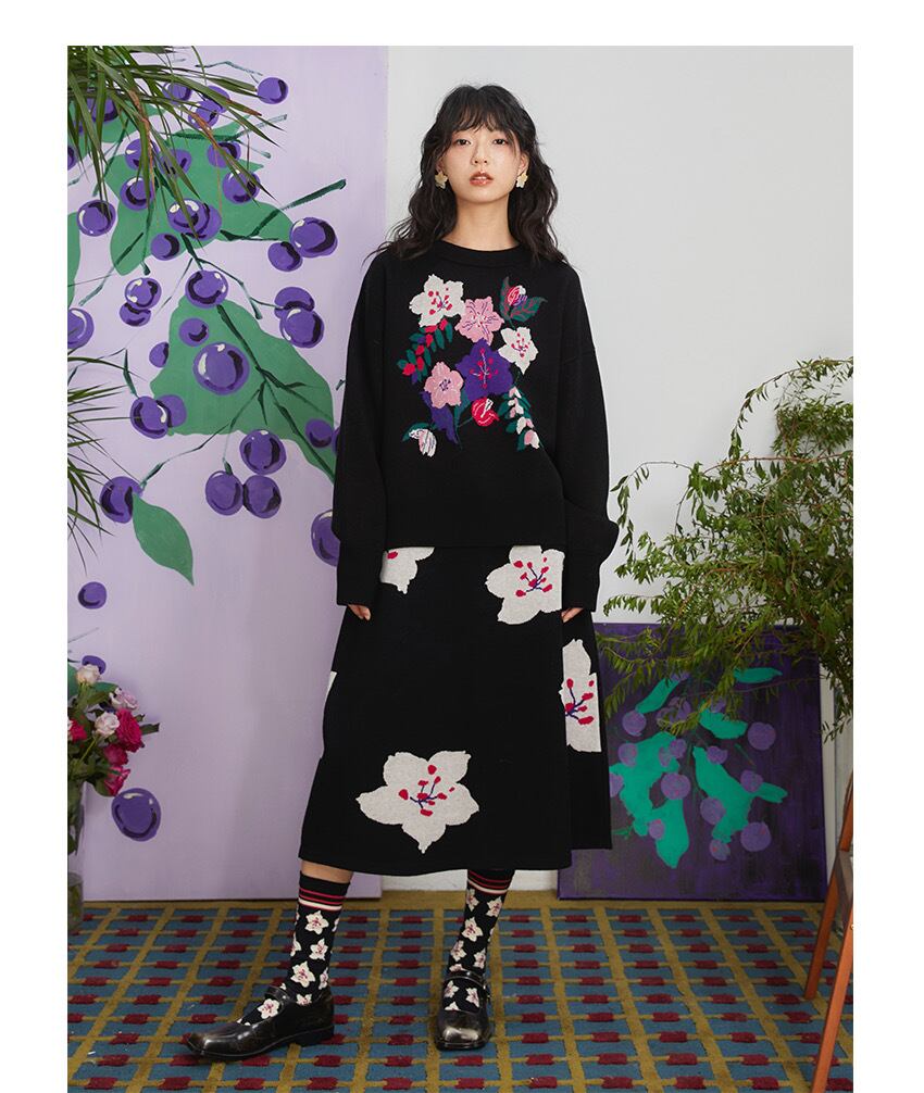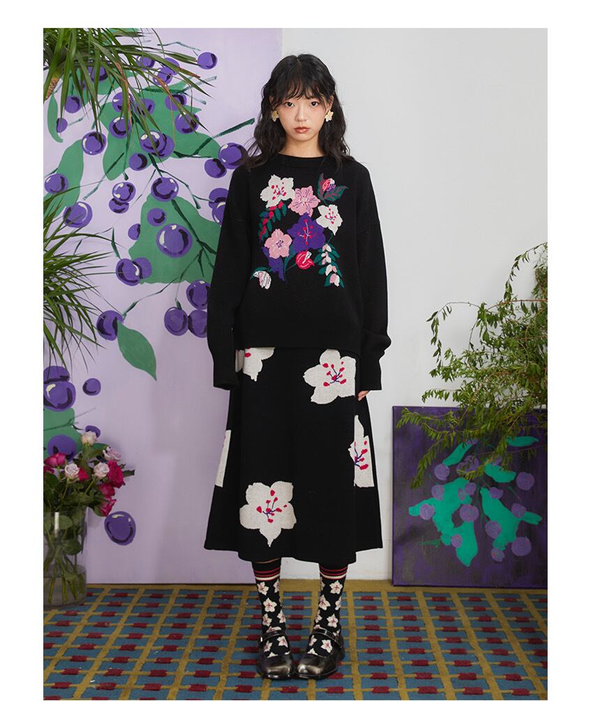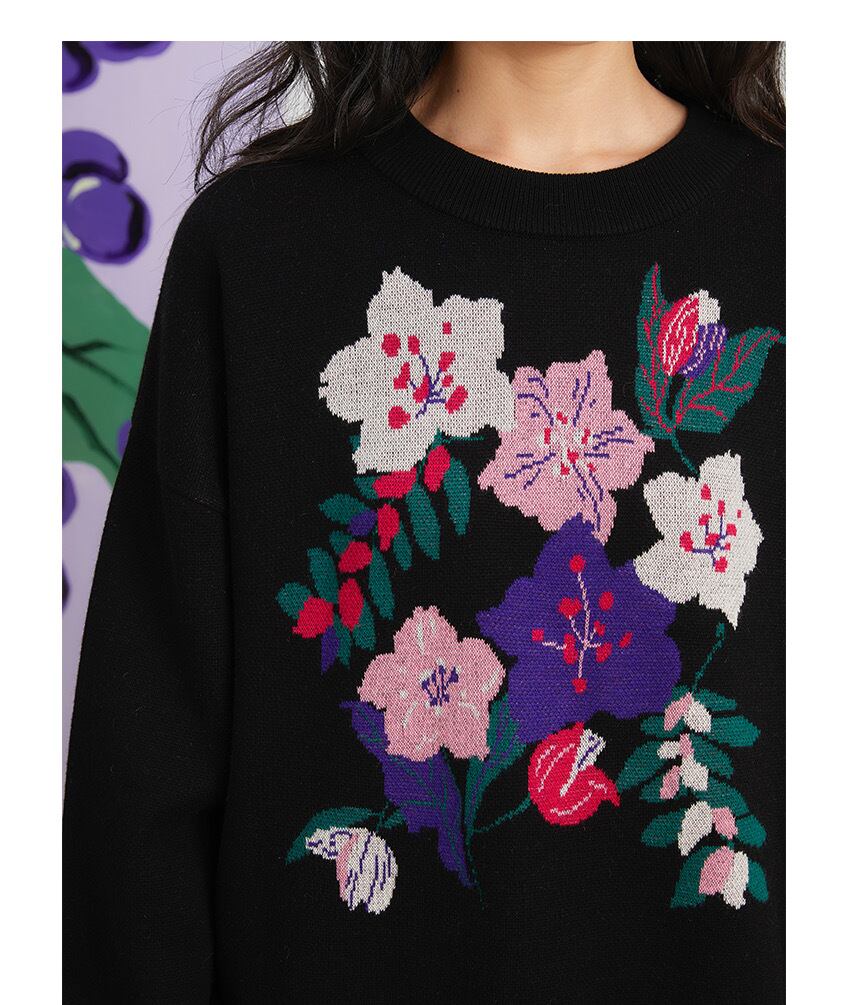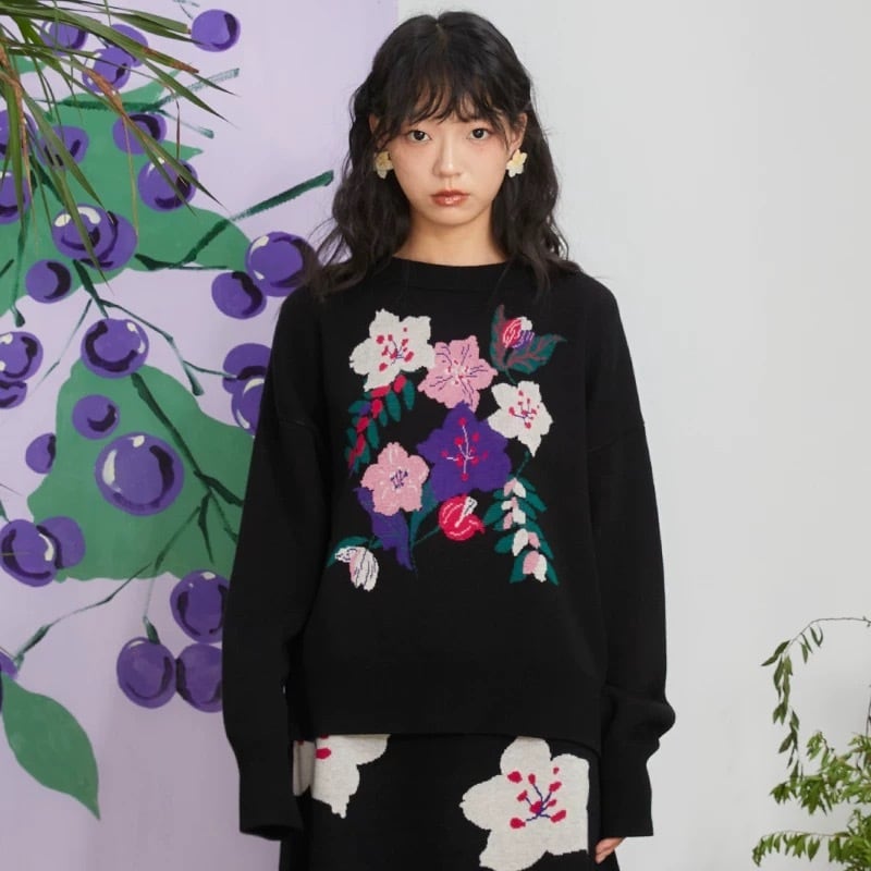 【トップス】花柄 黒 セーター ニット フラワー