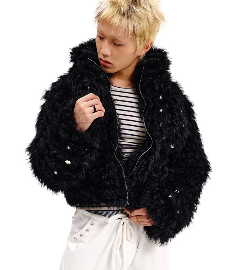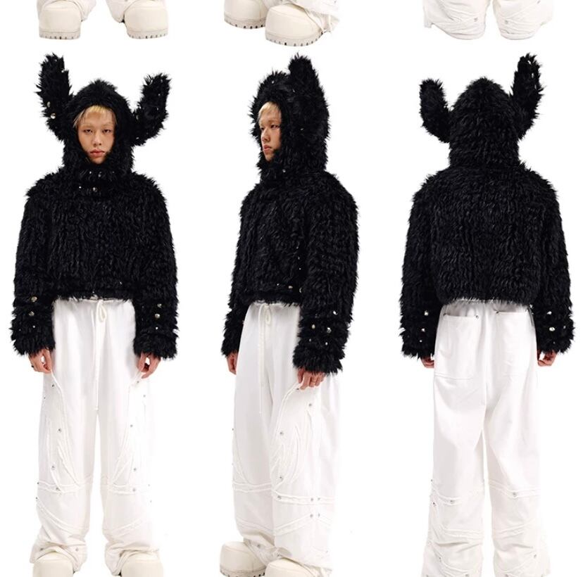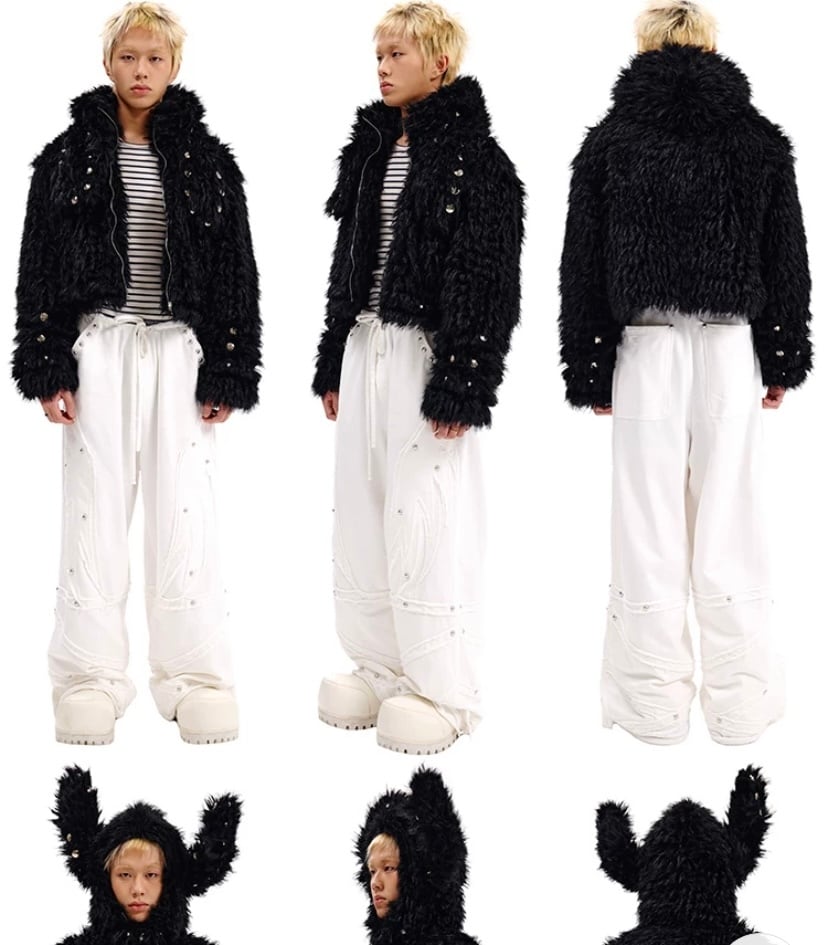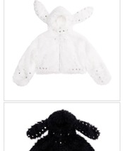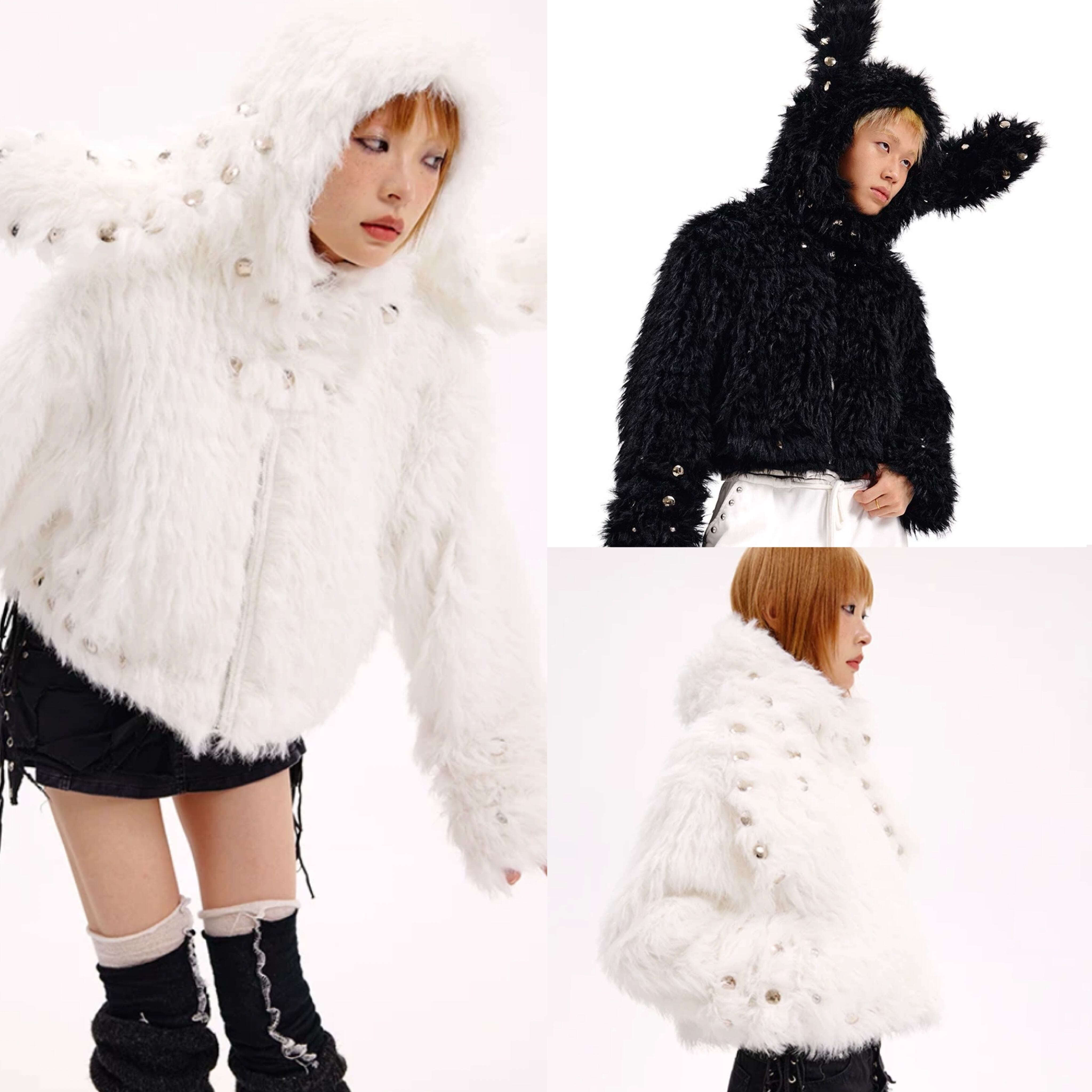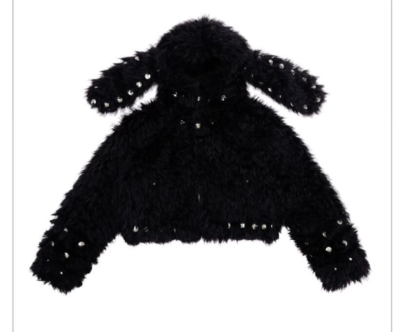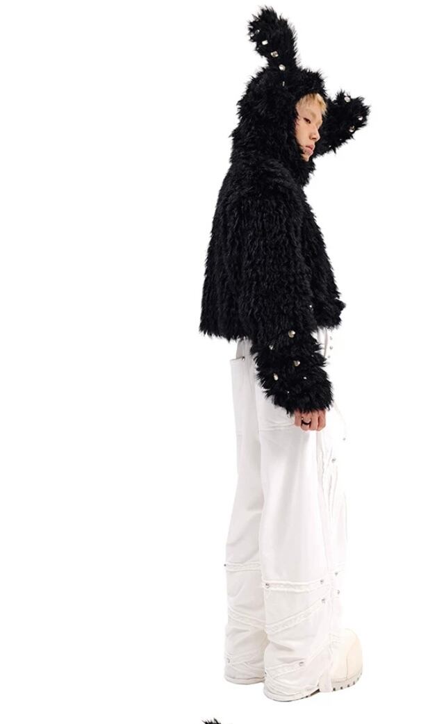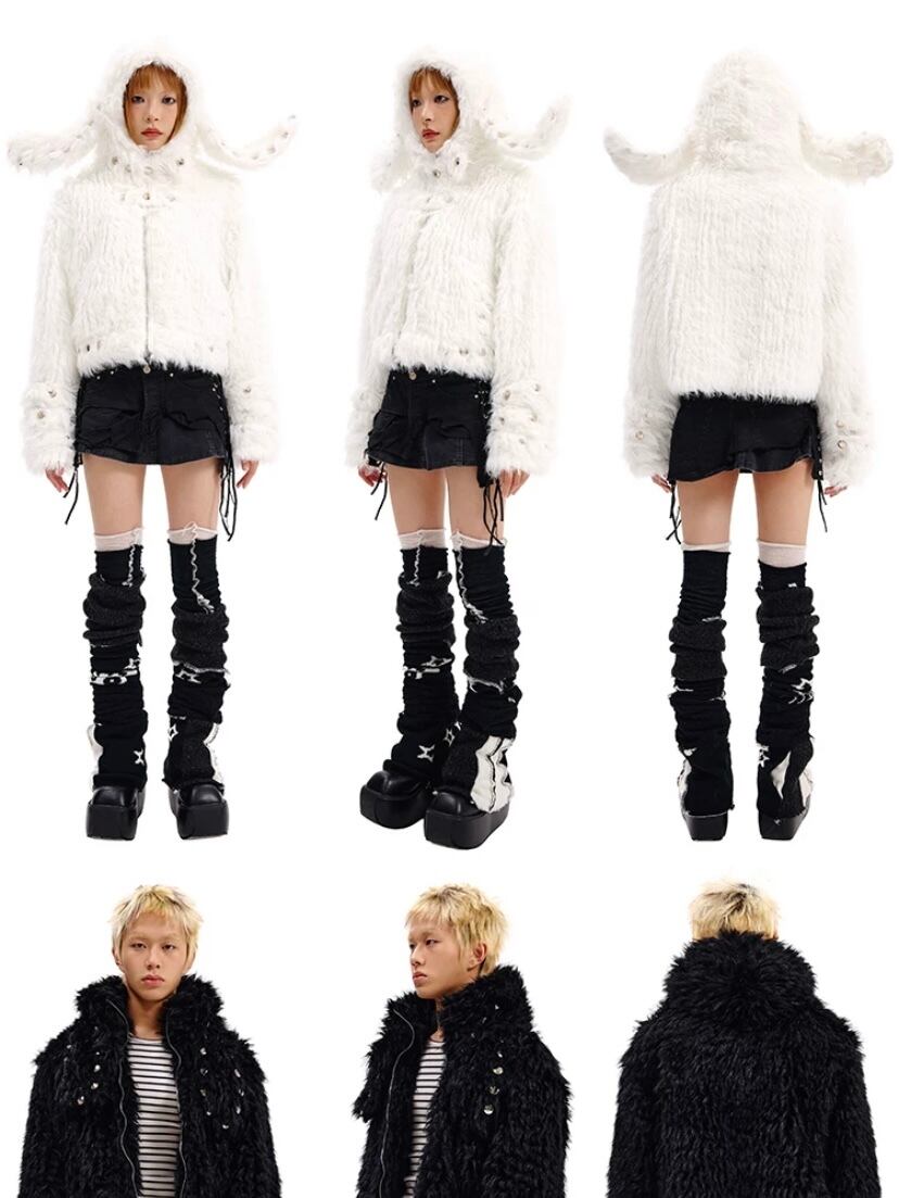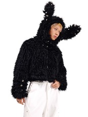 【ユニセックス】ファー 黒 白 うさぎ コート アウター ジャケット