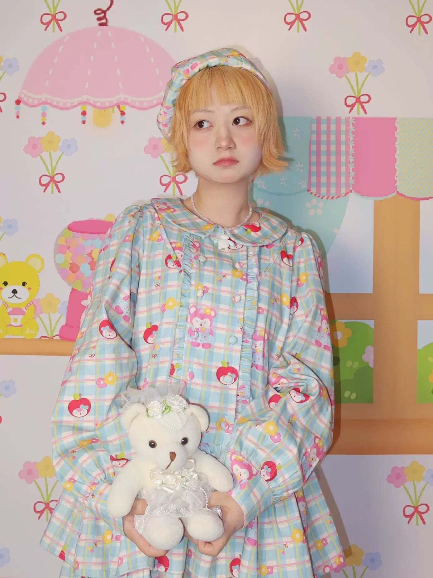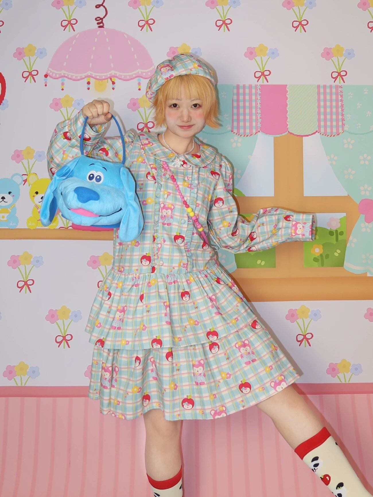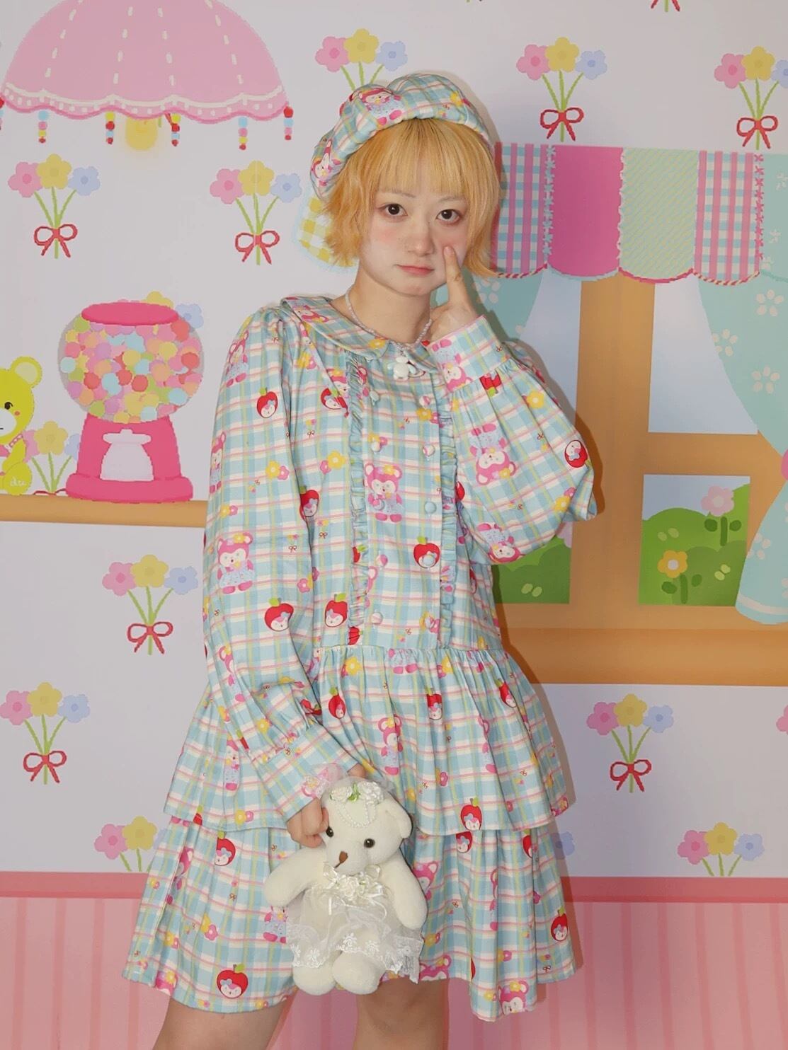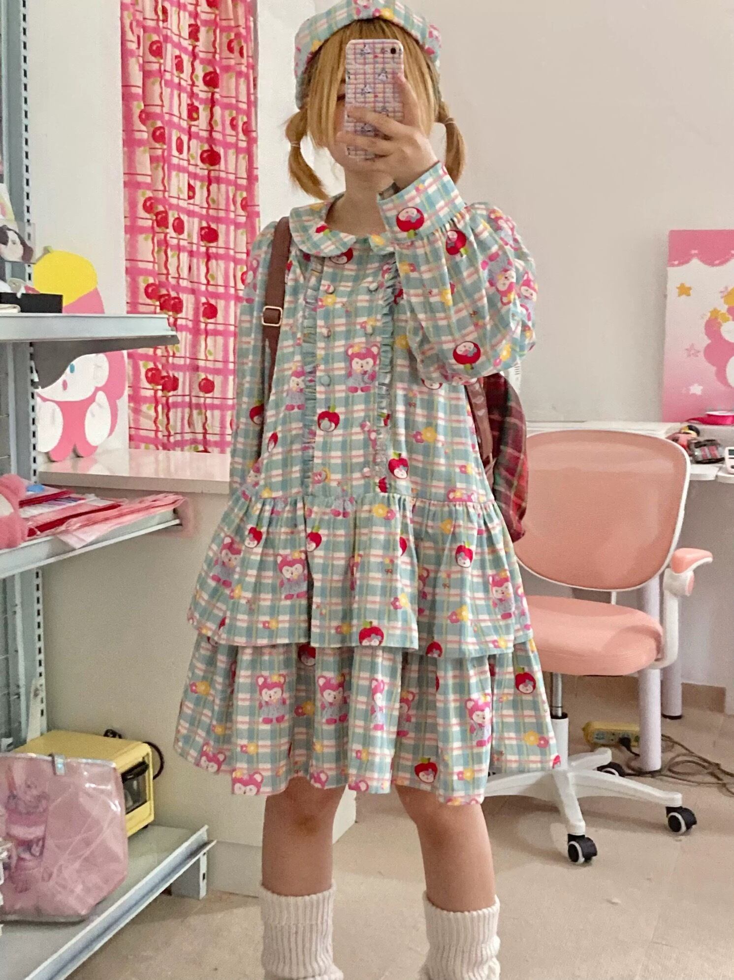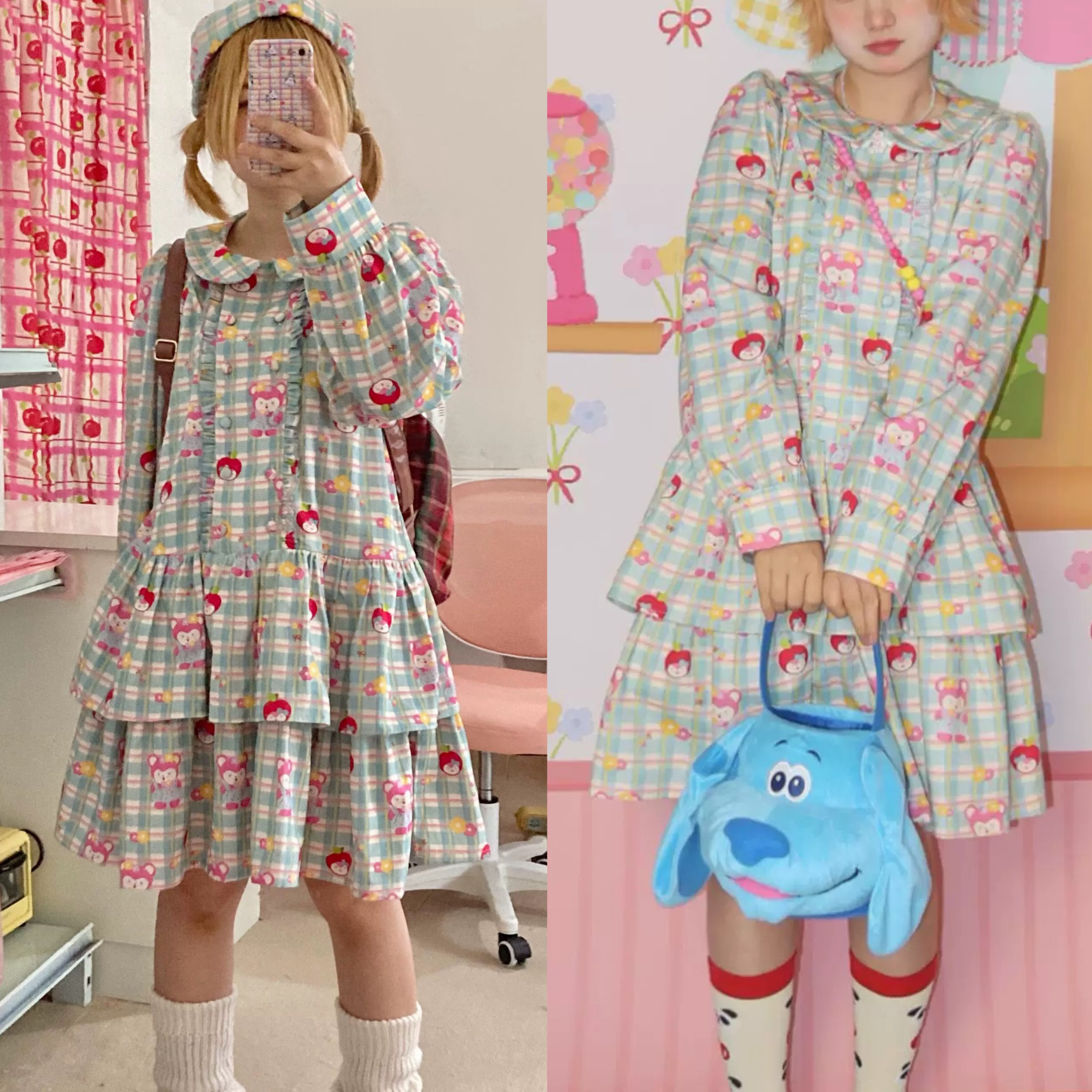 緑 丸襟 ガーリー チェック ワンピース 原宿
