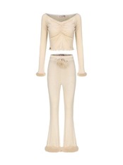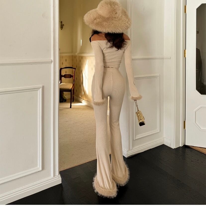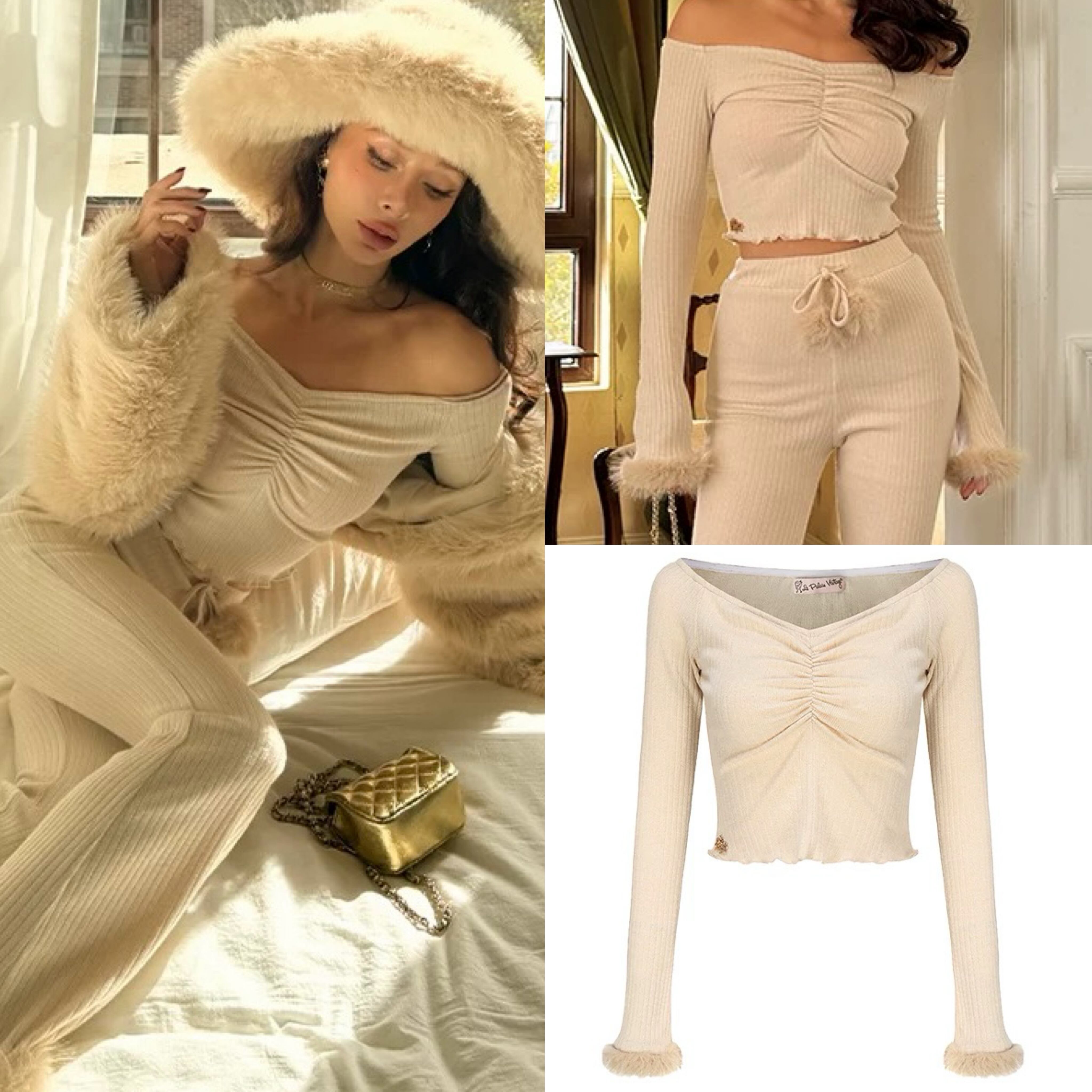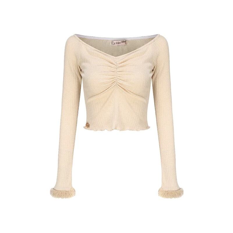 【トップス】ベージュ ファー オフショルダー ブラウス