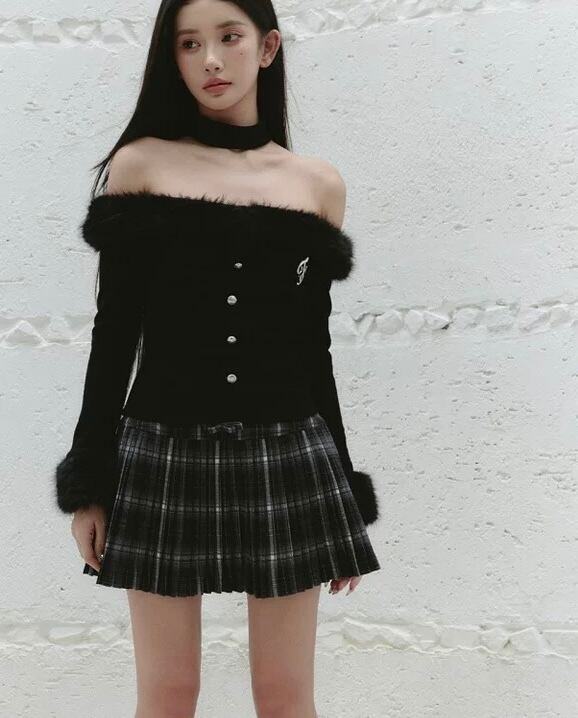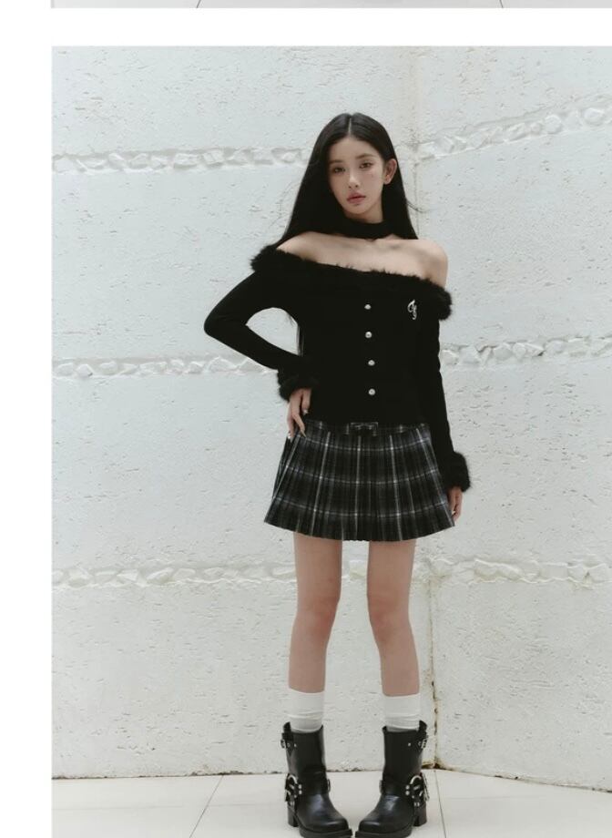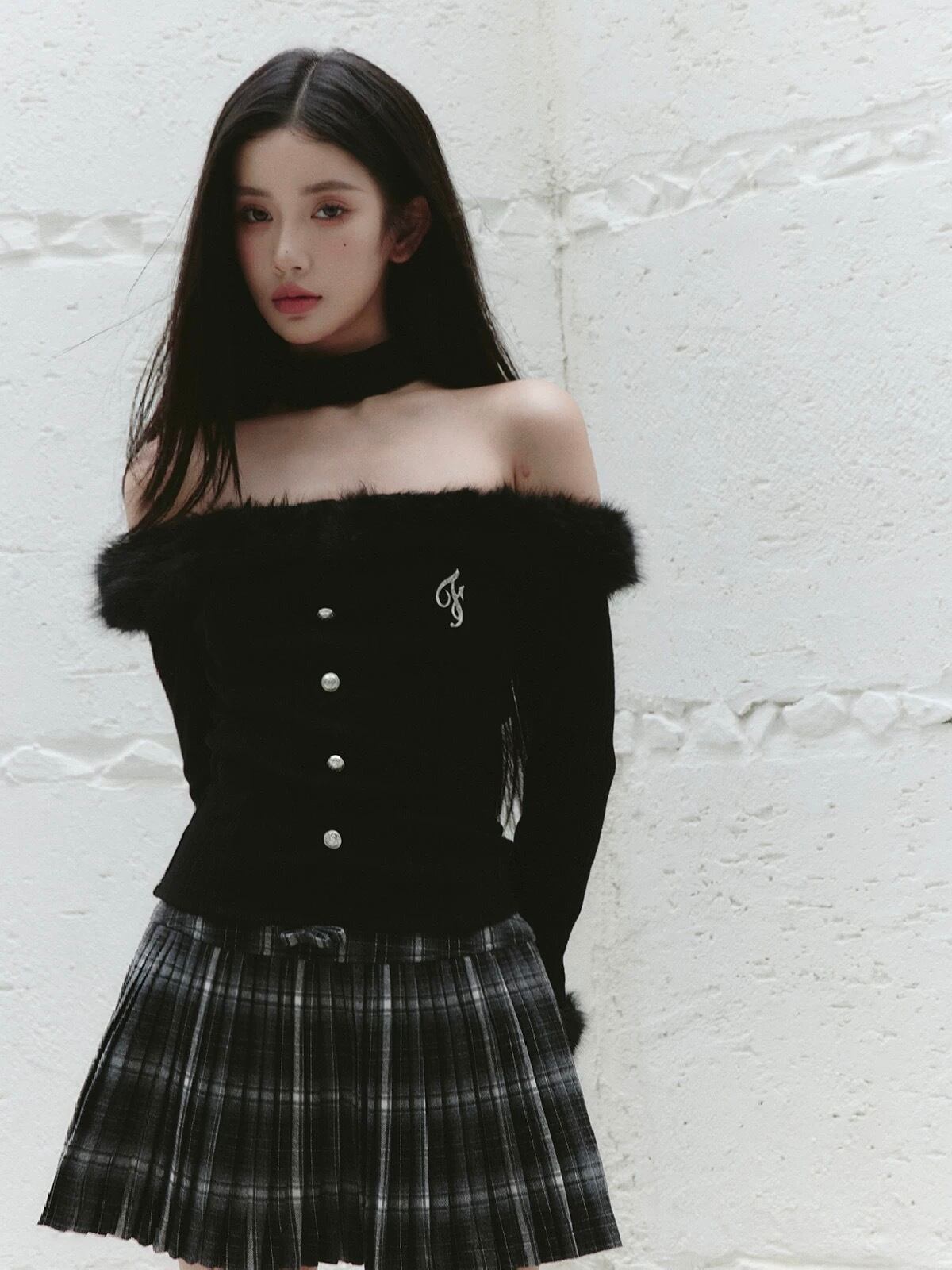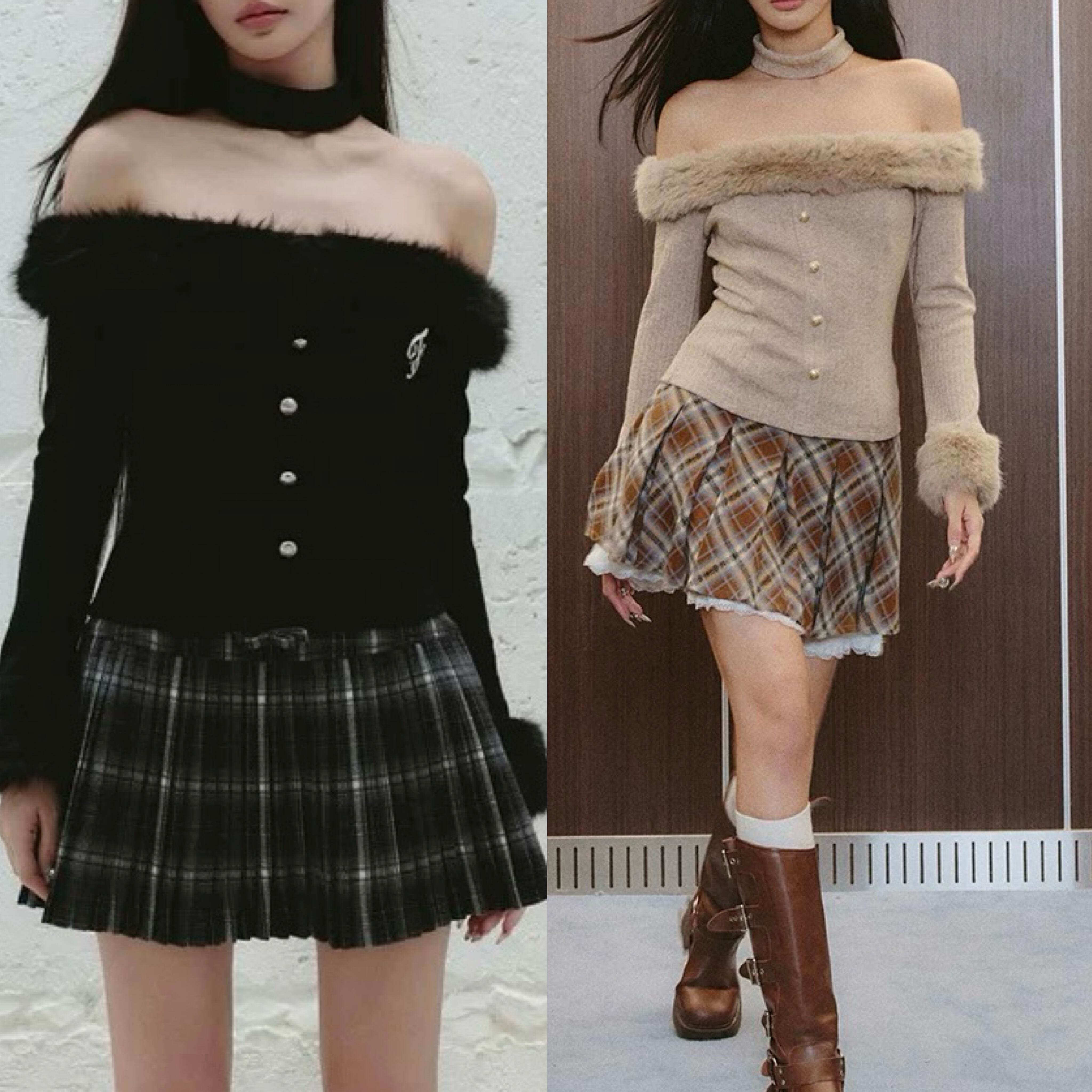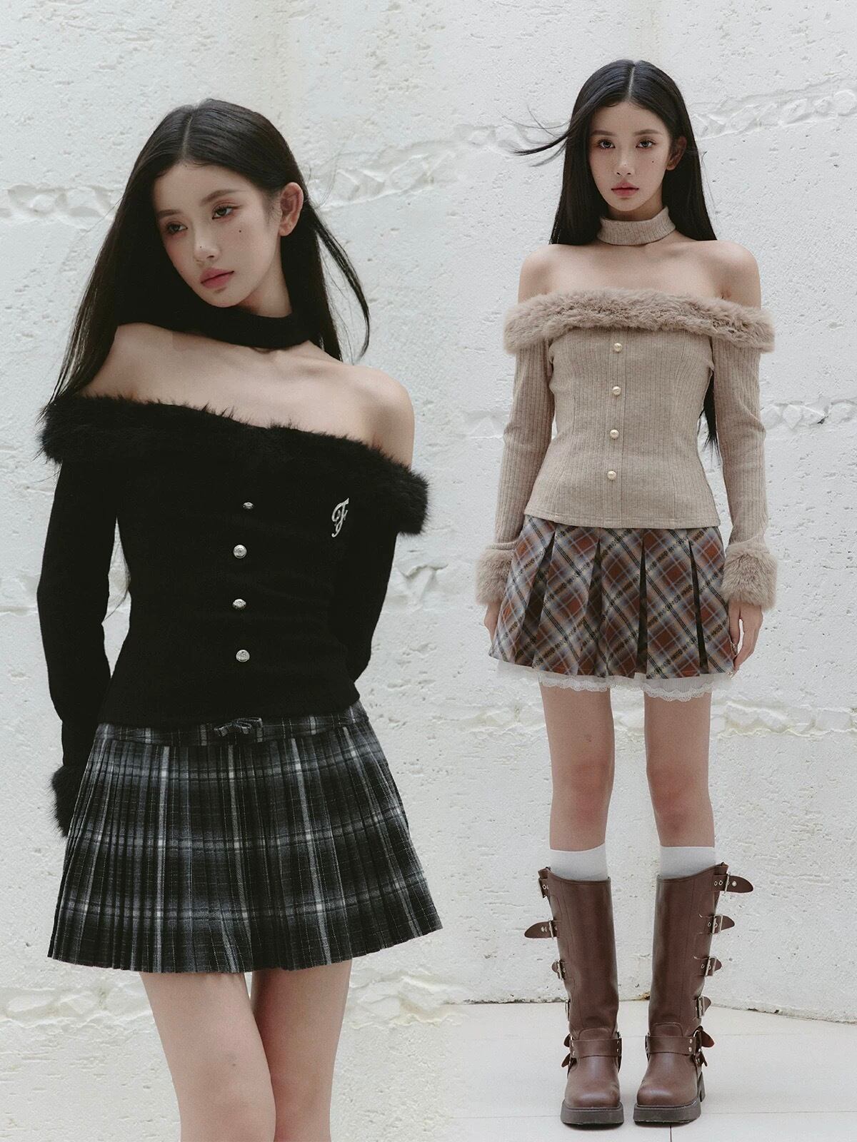 【トップス】黒 ベージュ ブラウス オフショルダー ファー