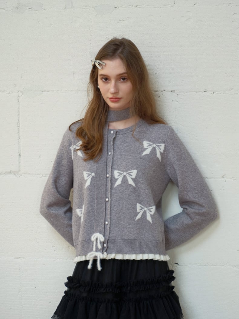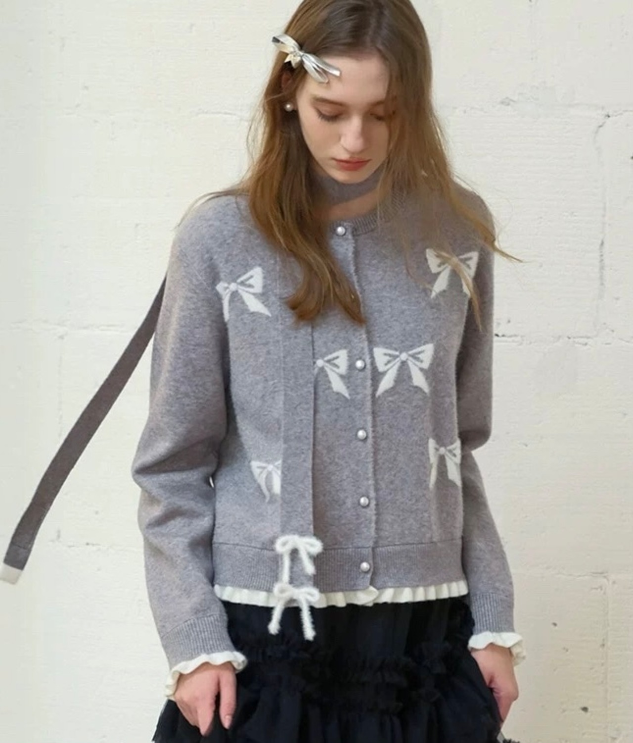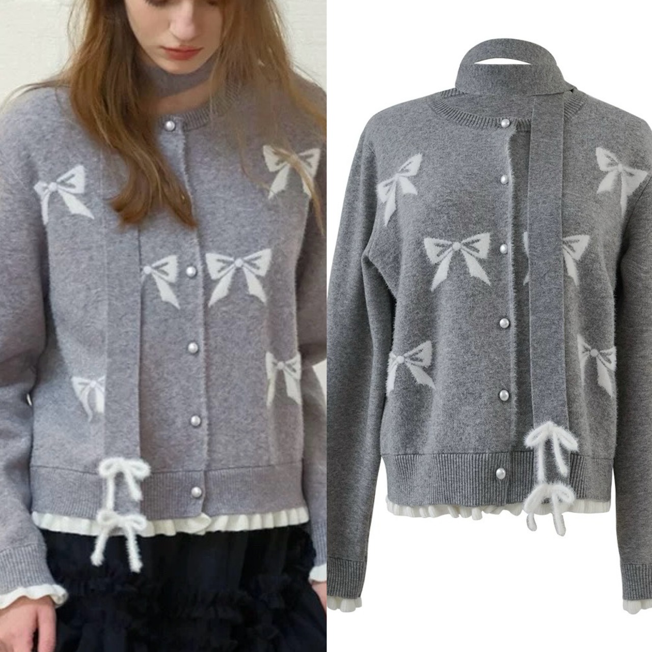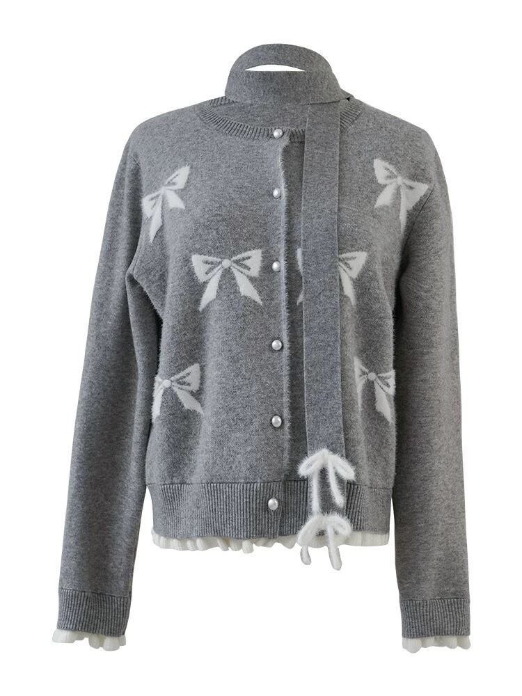 マフラーつき】グレー 可愛い ガーリー カーディガン リボン 白 グレー