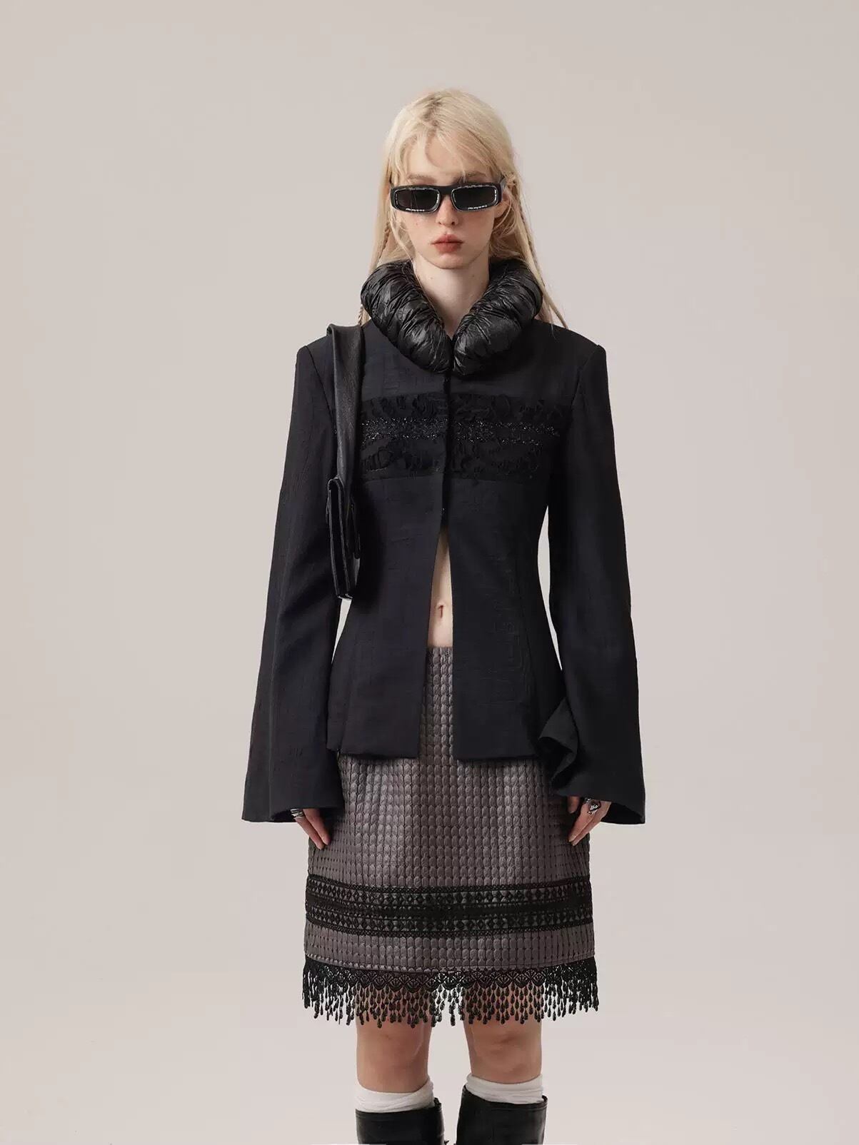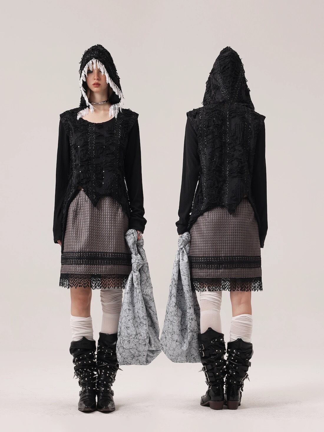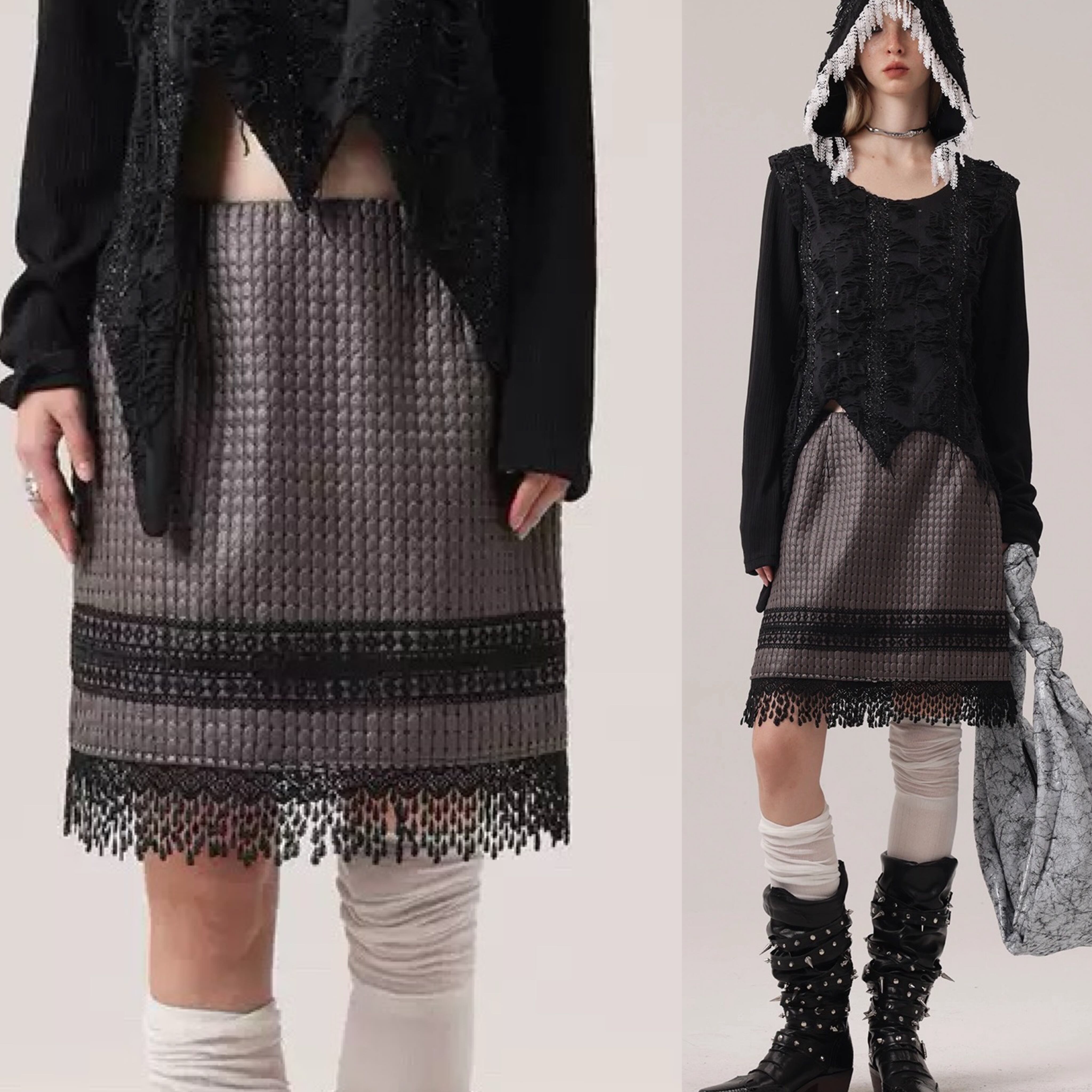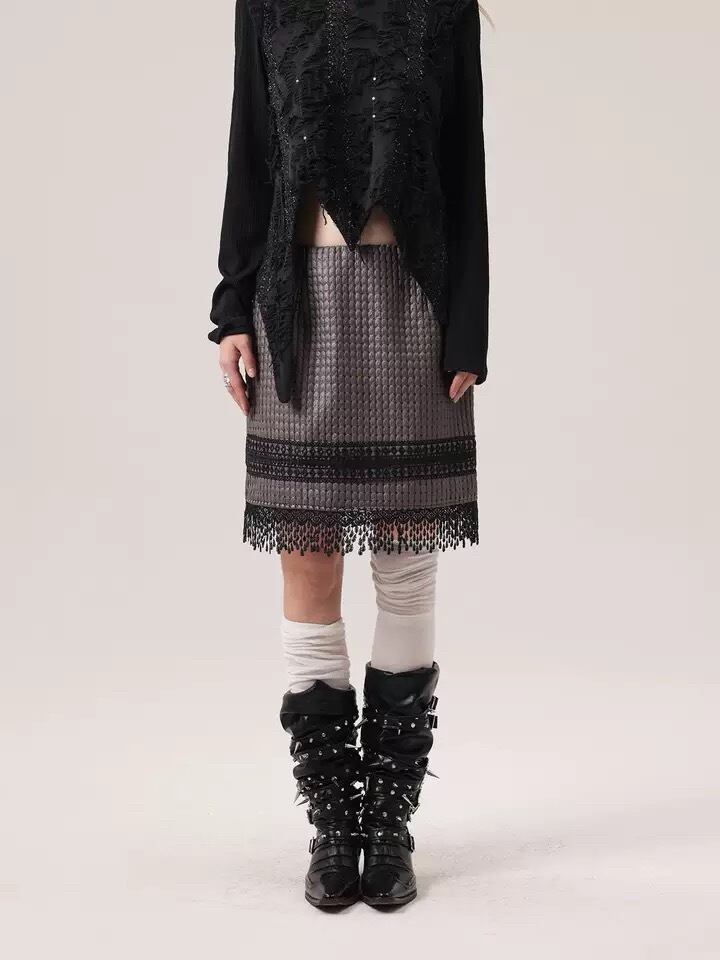 スカート ボドムス チェック 黒 グレー フリンジ