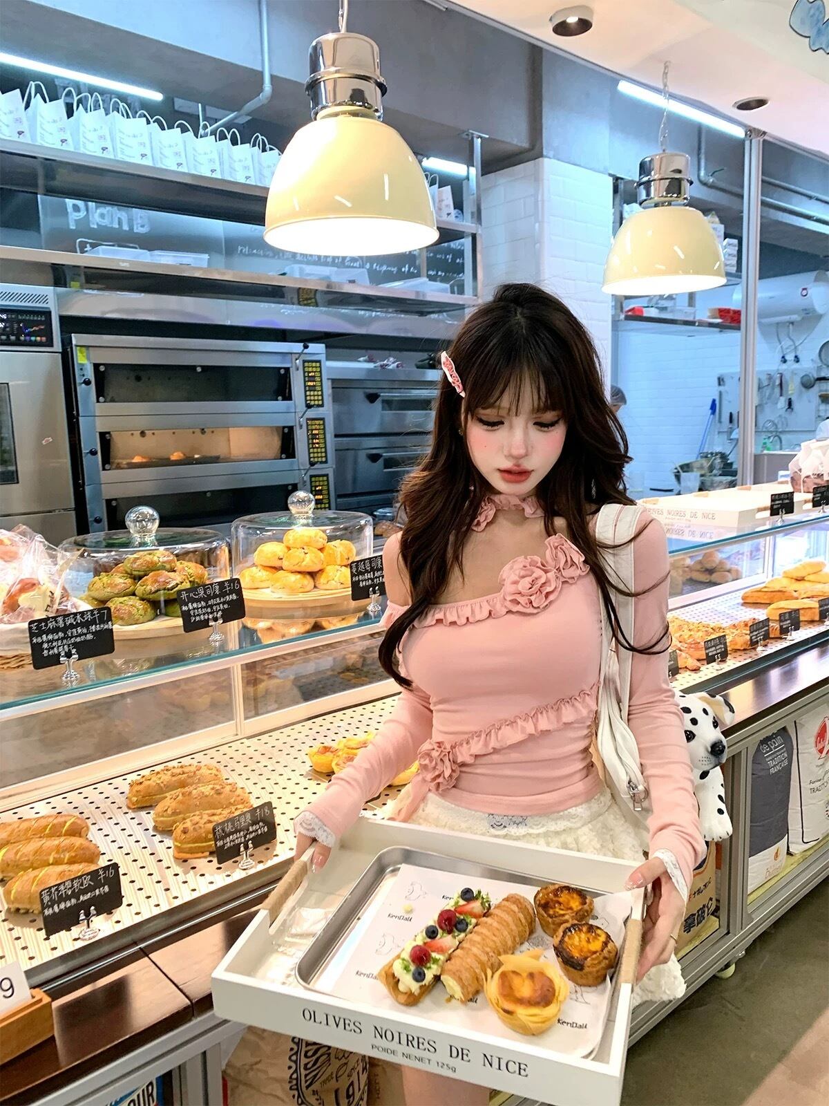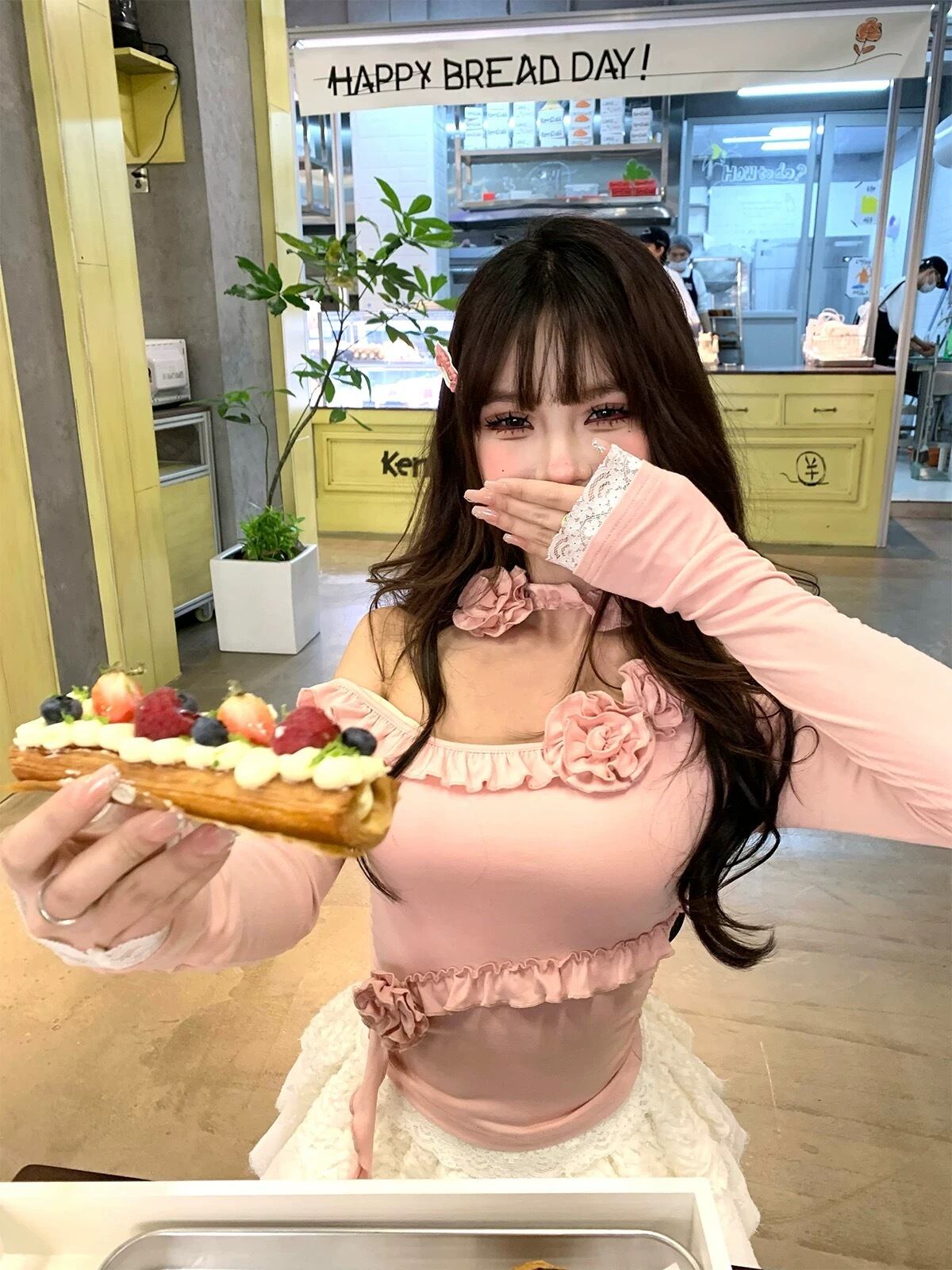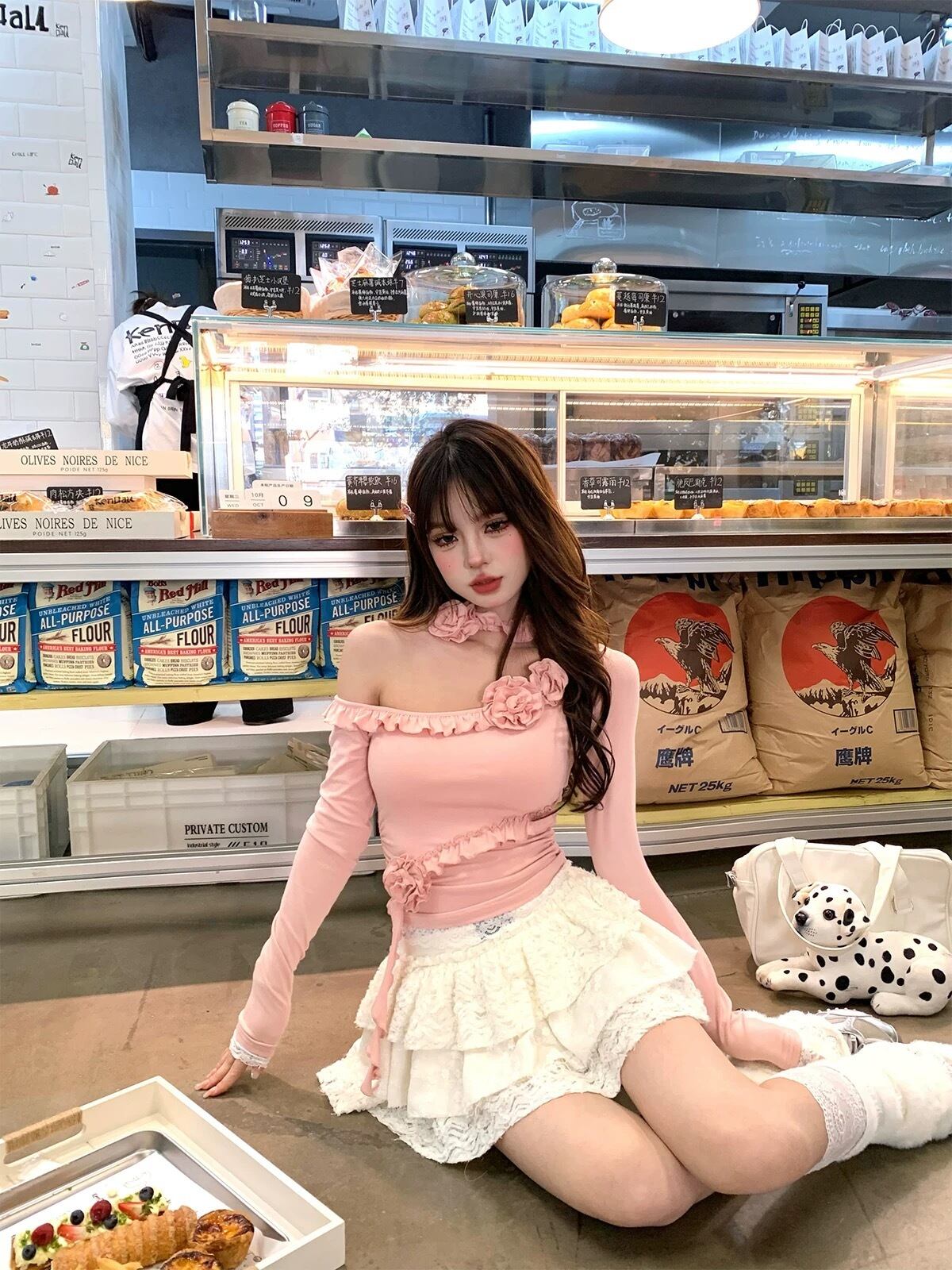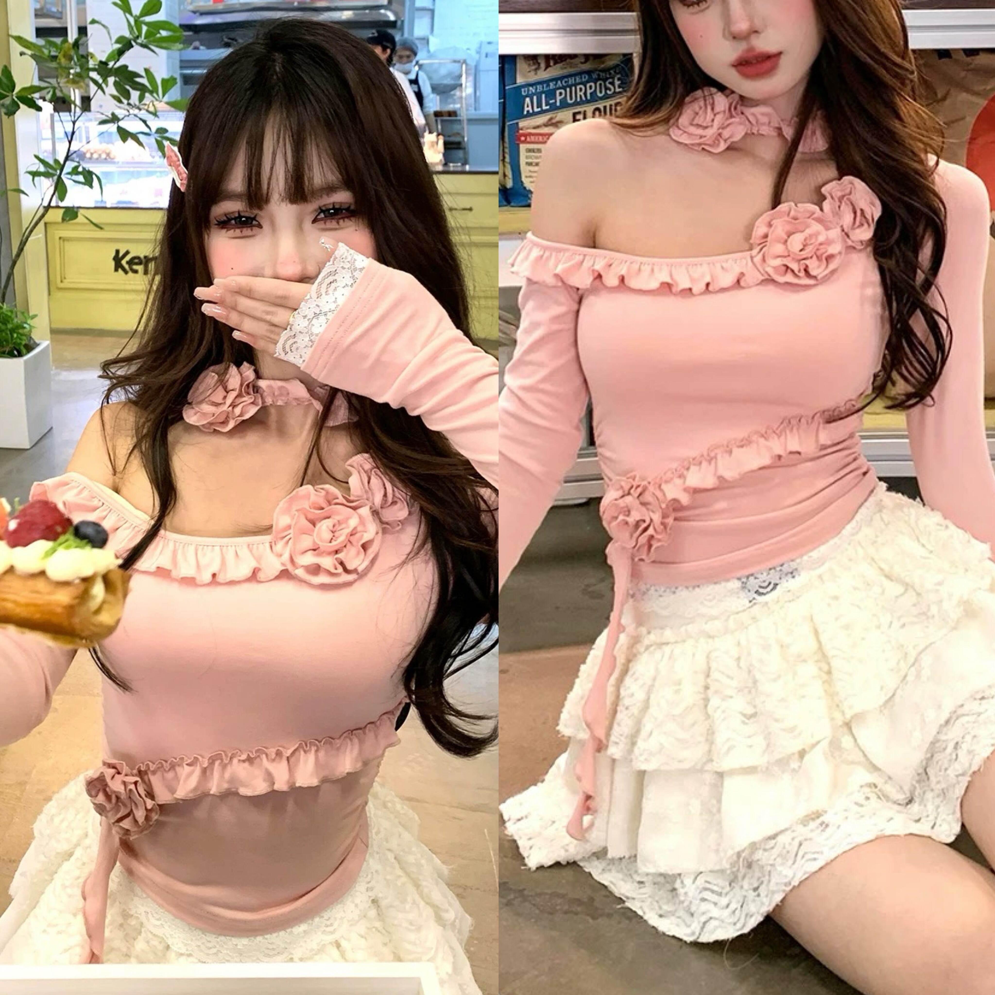 ピンク オフショルダー Tシャツ 薔薇 フラワー