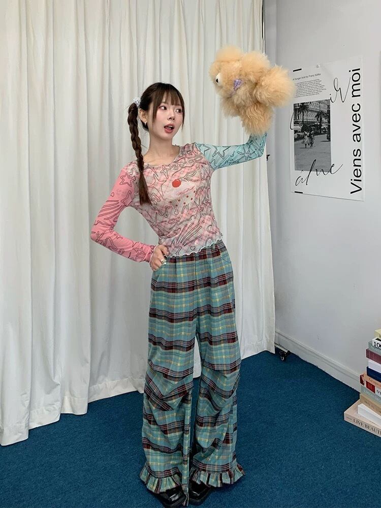 緑 チェック パンツ ボトムス ガーリー 可愛い