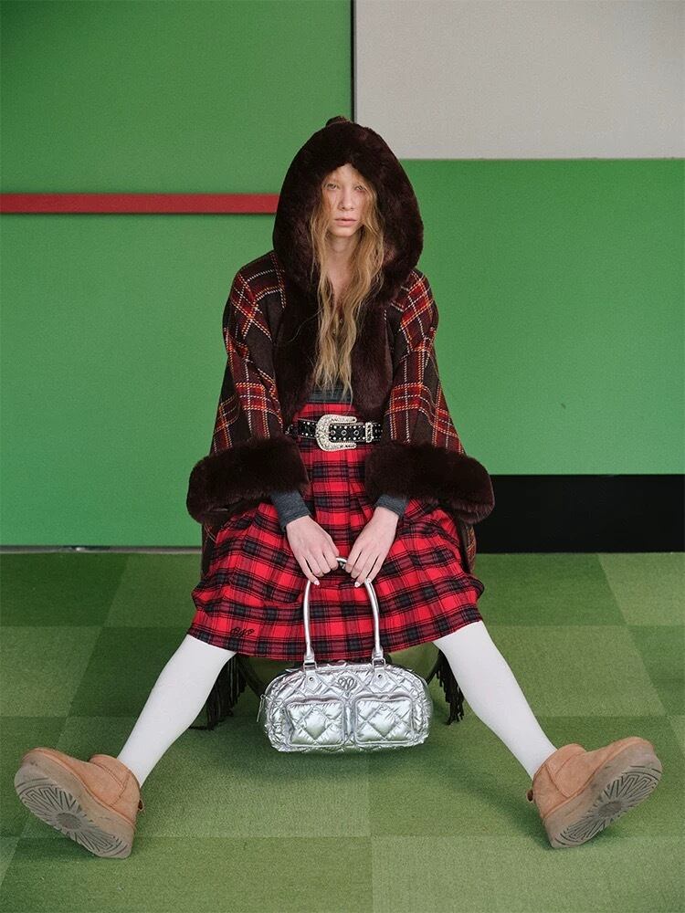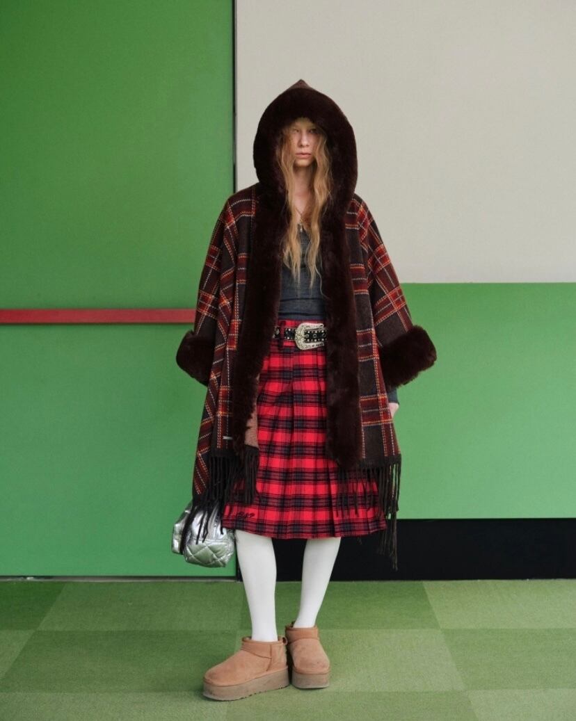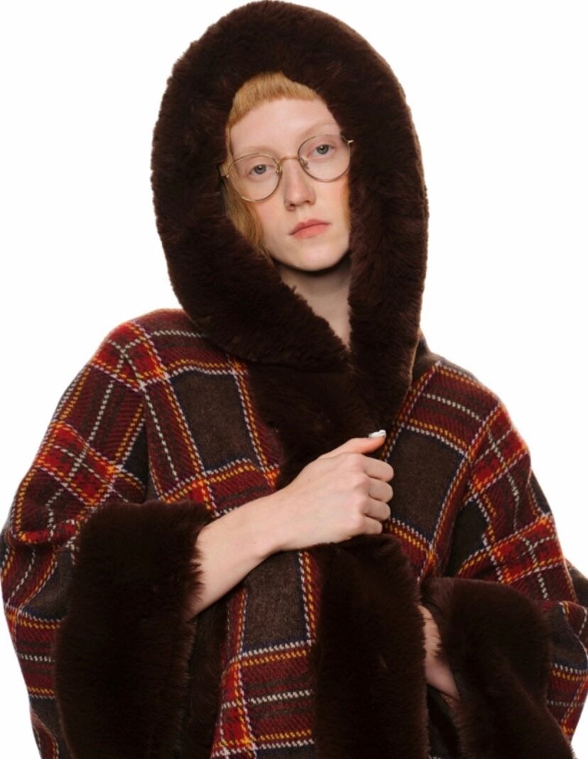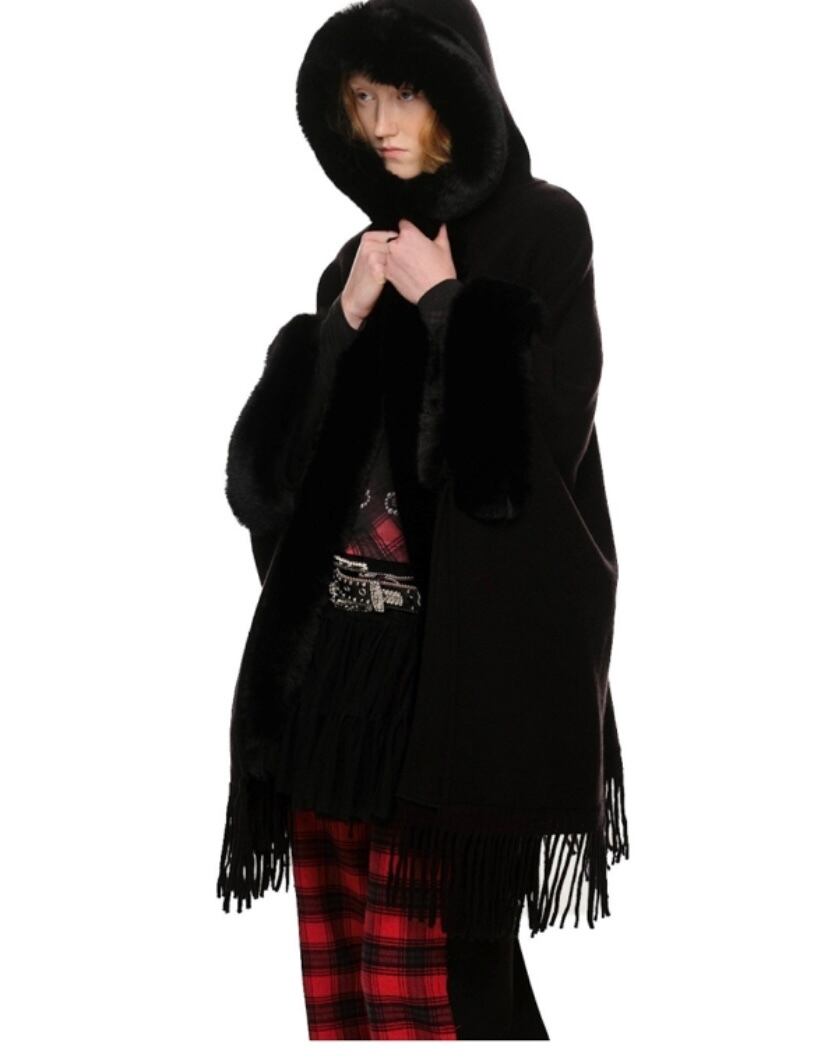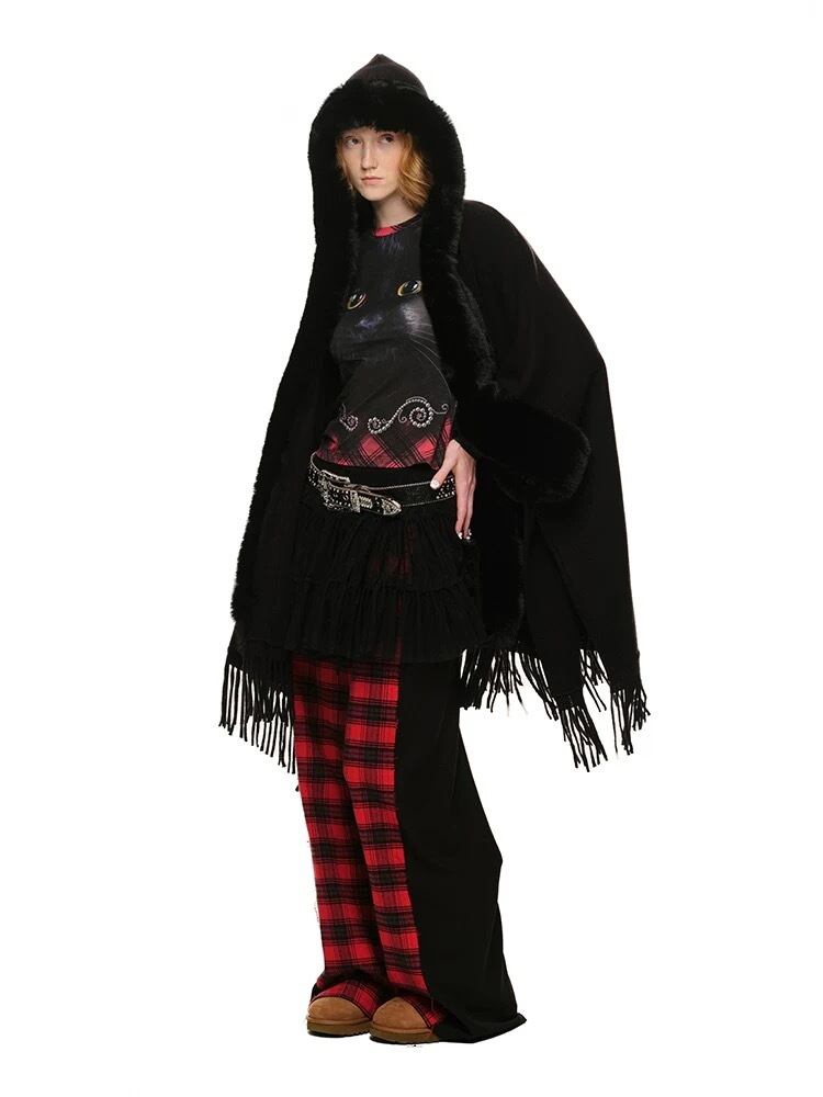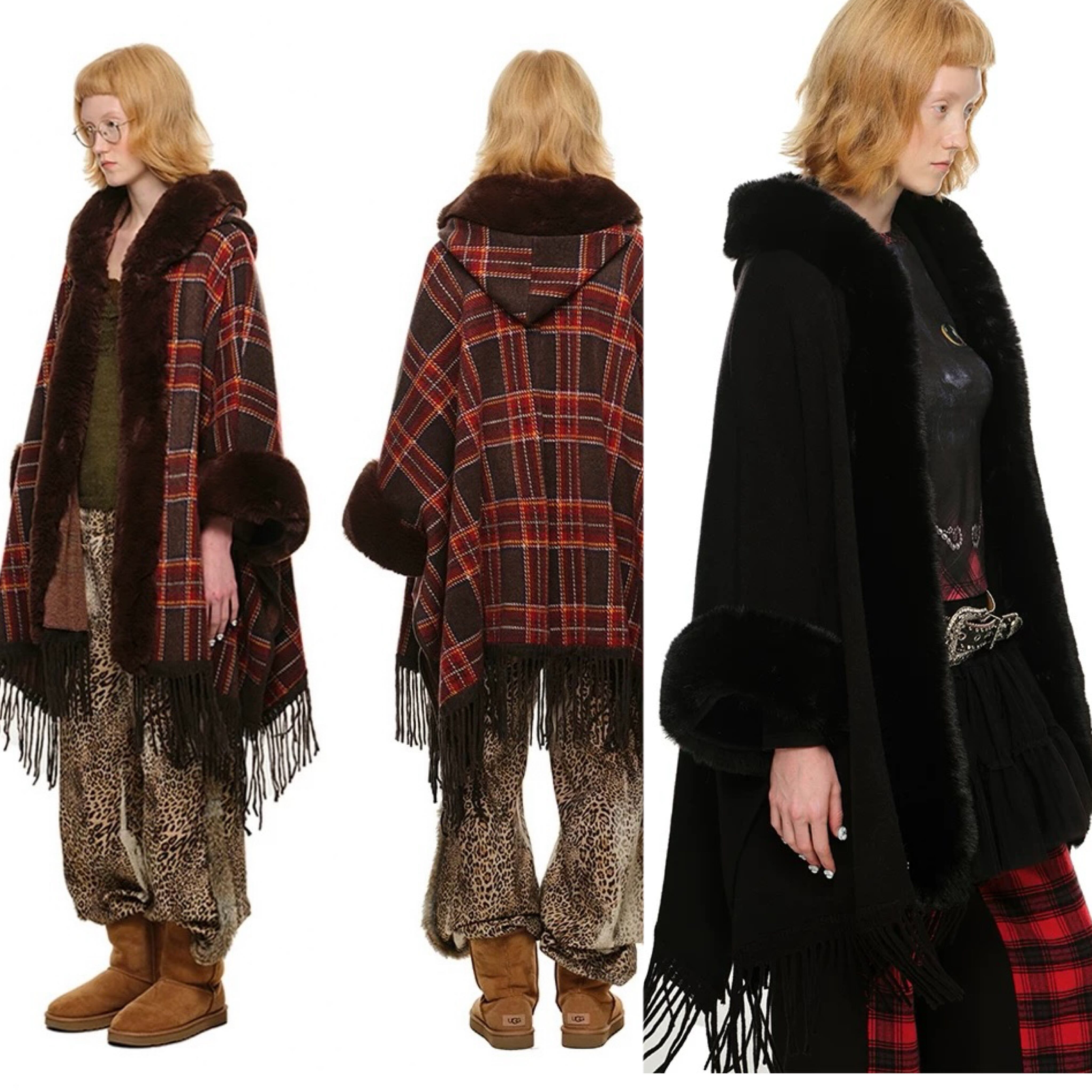 黒 赤 チェック ファー マント コート カーディガン アウター ジャケット フリンジ フード