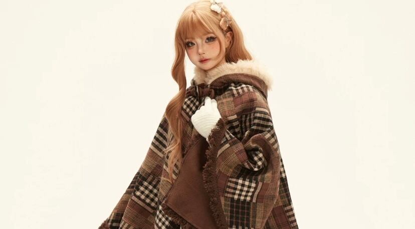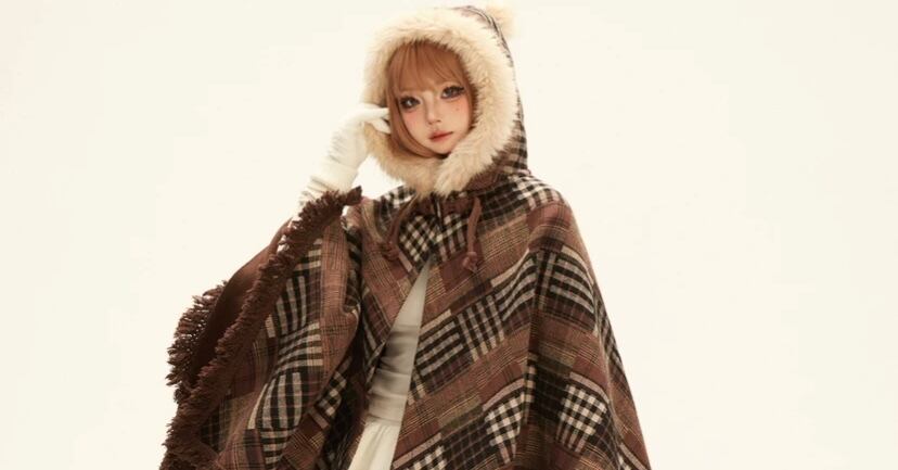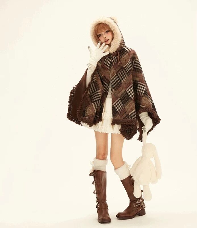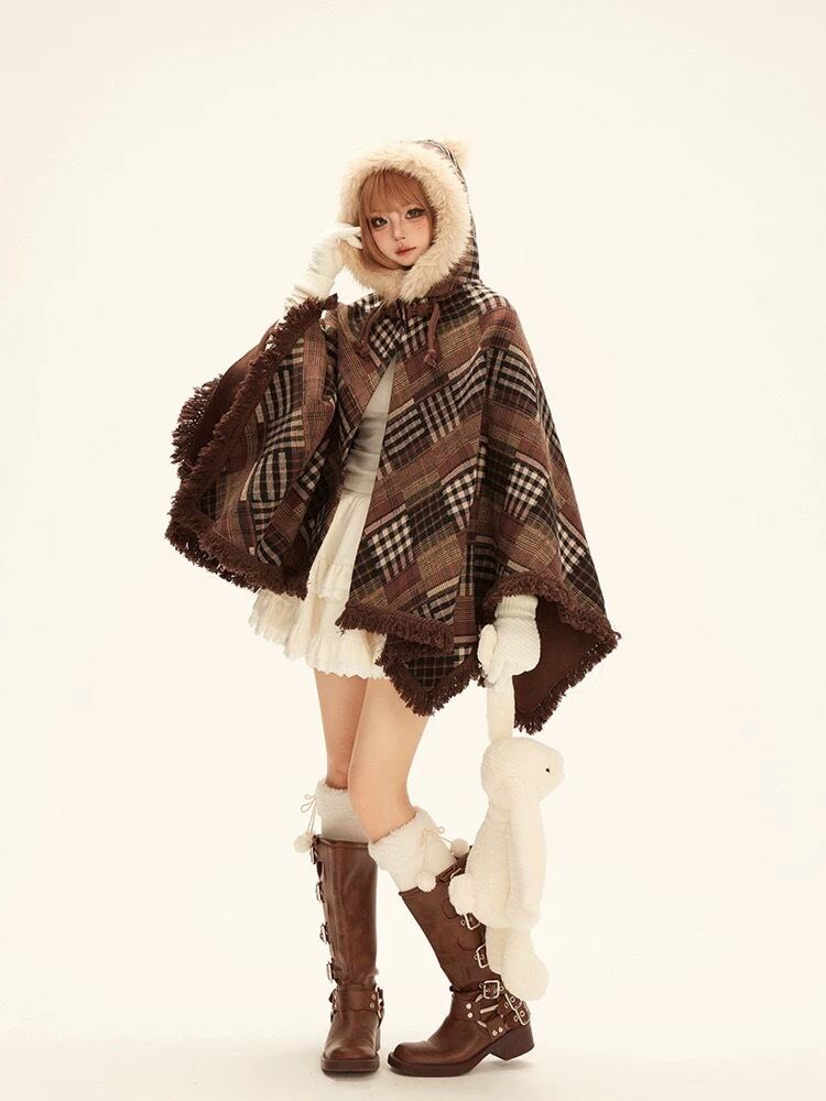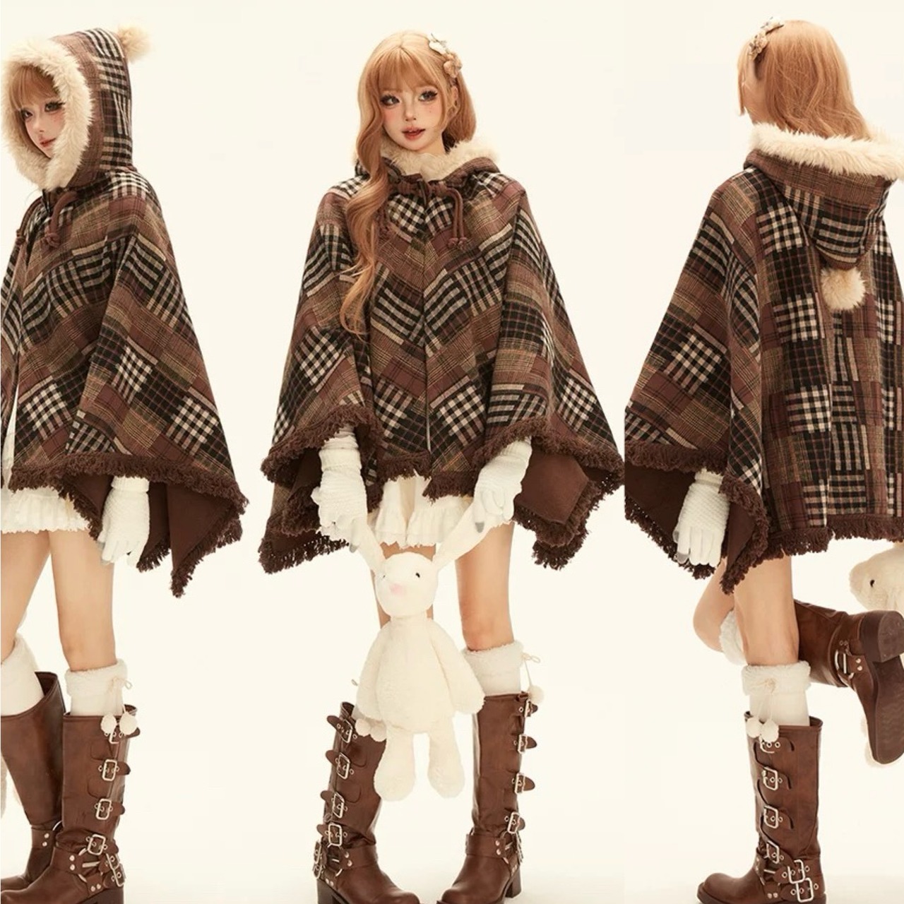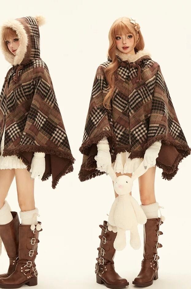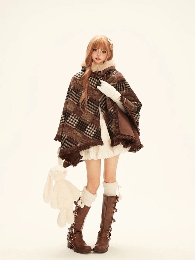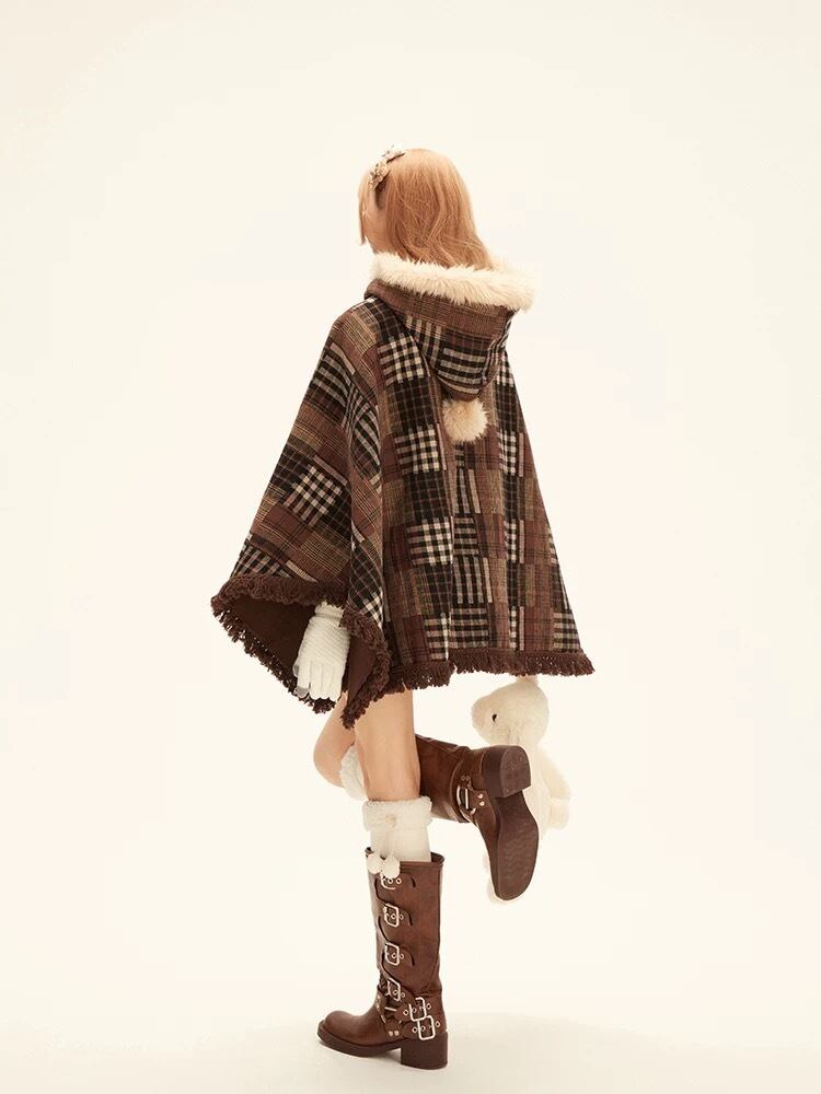 茶色 チェック マント フード アウター ジャケット カーディガン