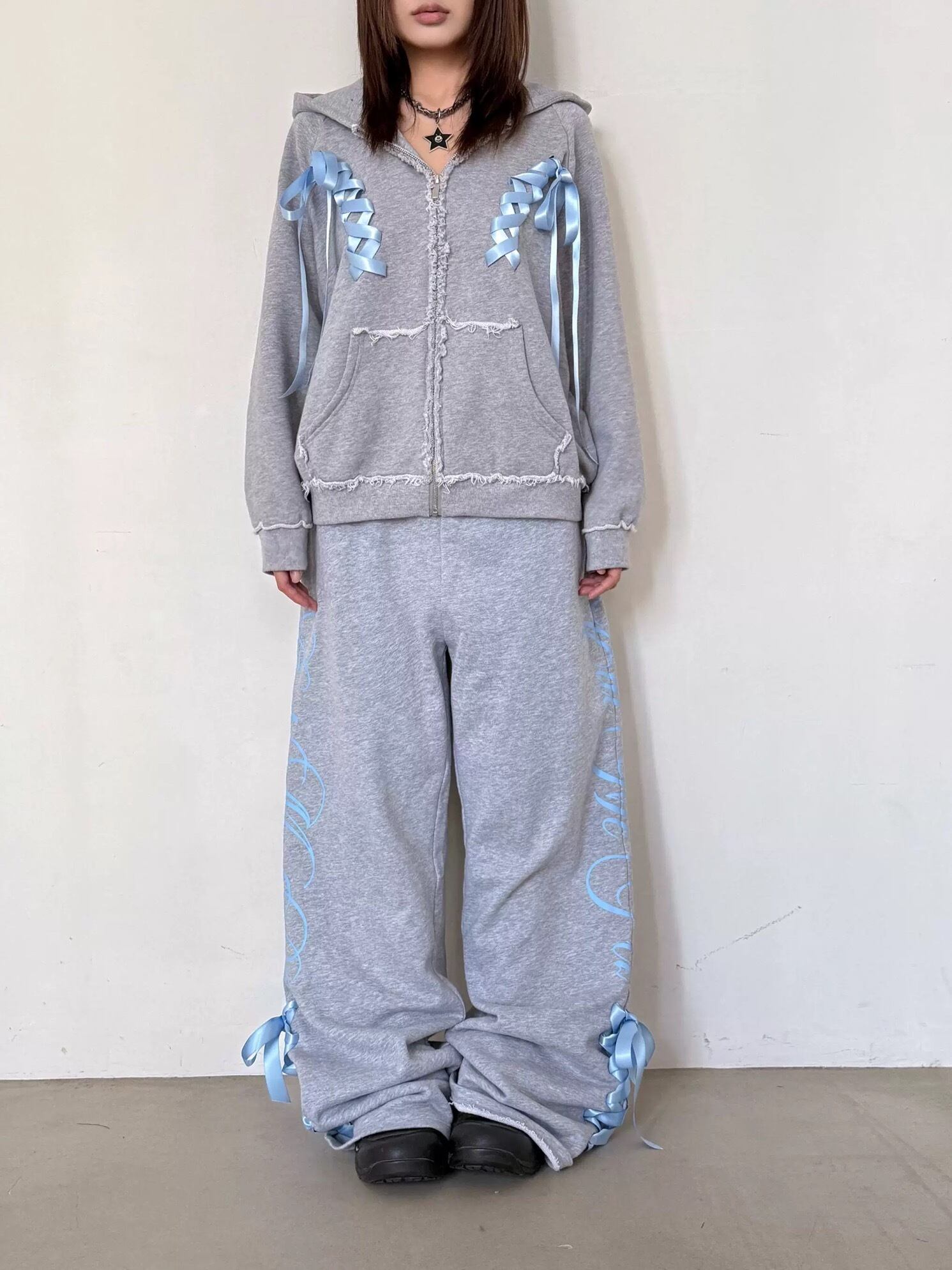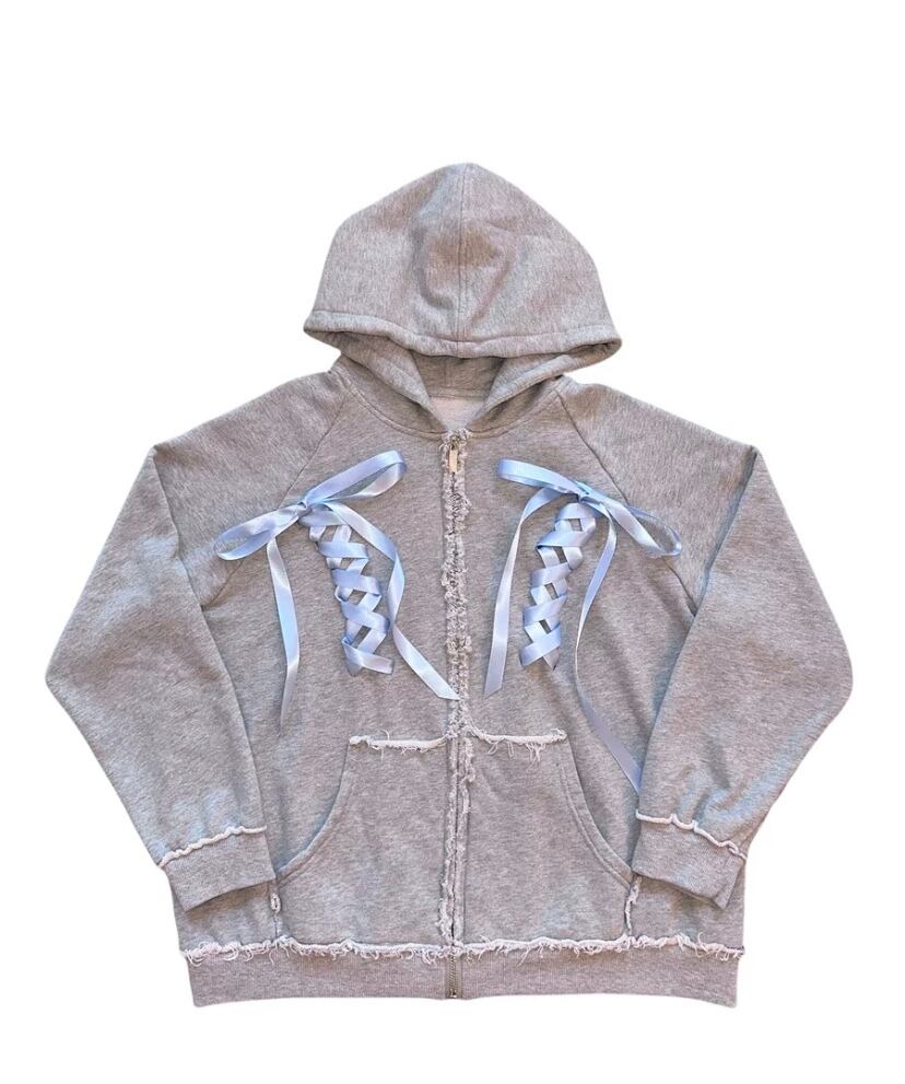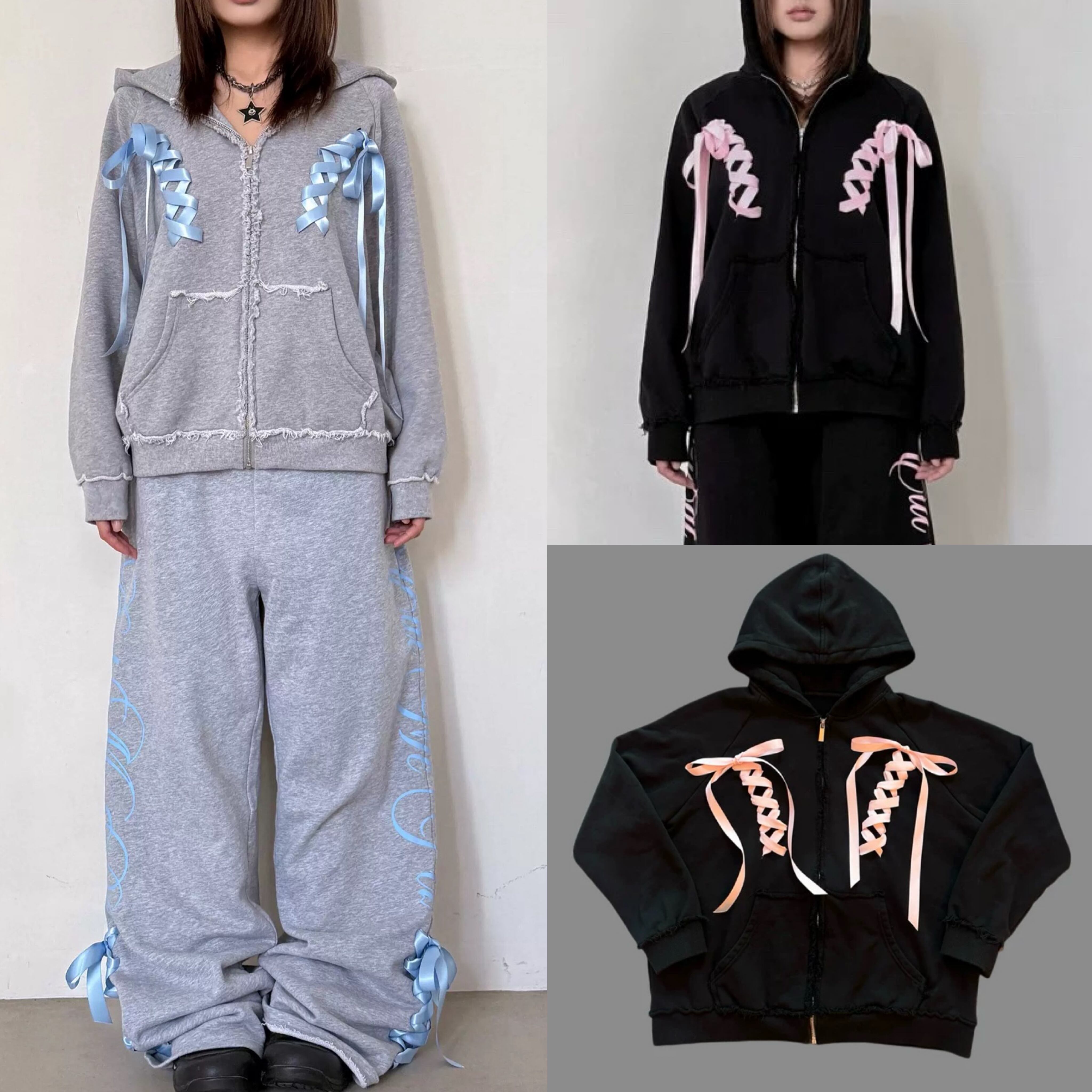 【パーカー】黒 グレー ピンク 水色 リボン スウェット