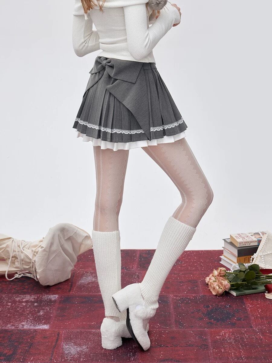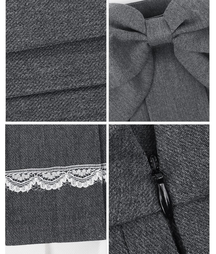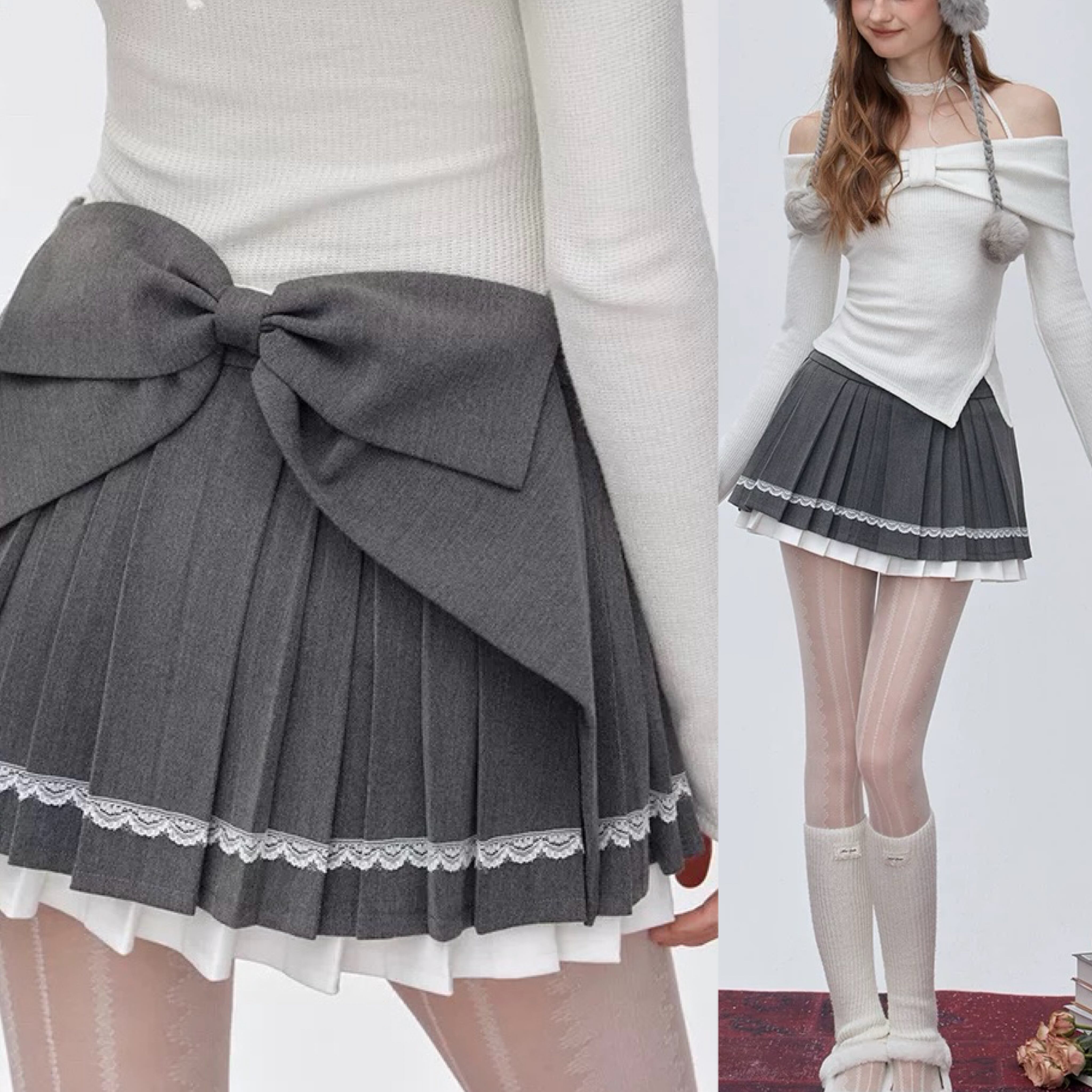 【スカート】ミニスカート ボトムス グレー プリーツ リボン ガーリー スクール