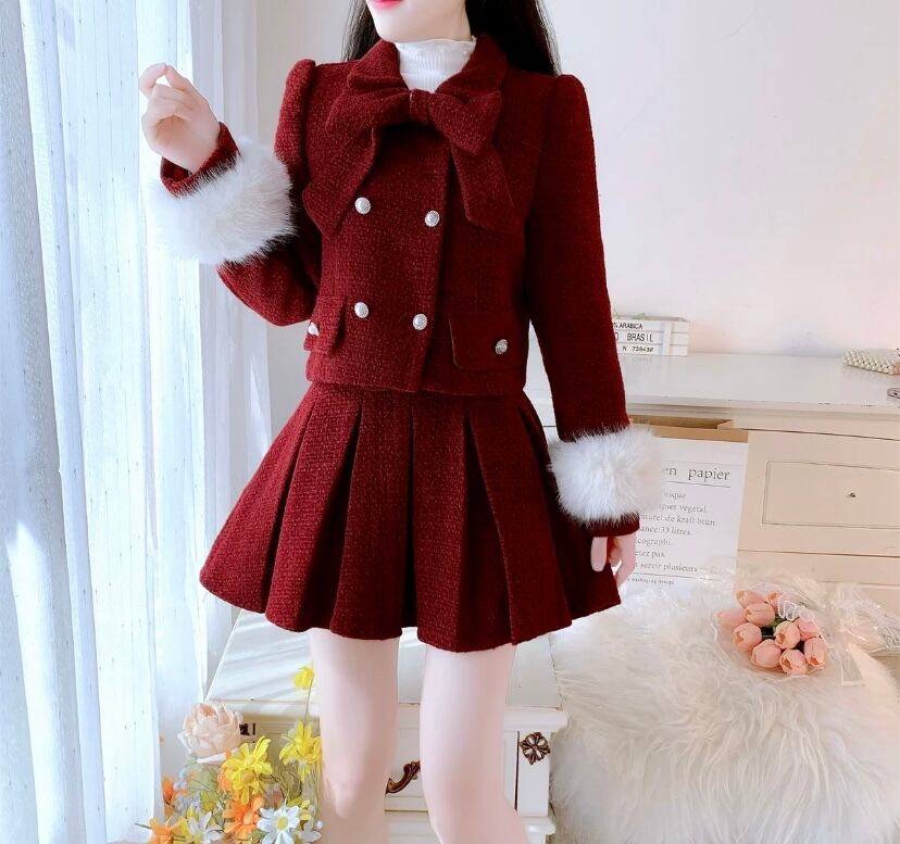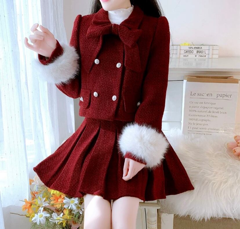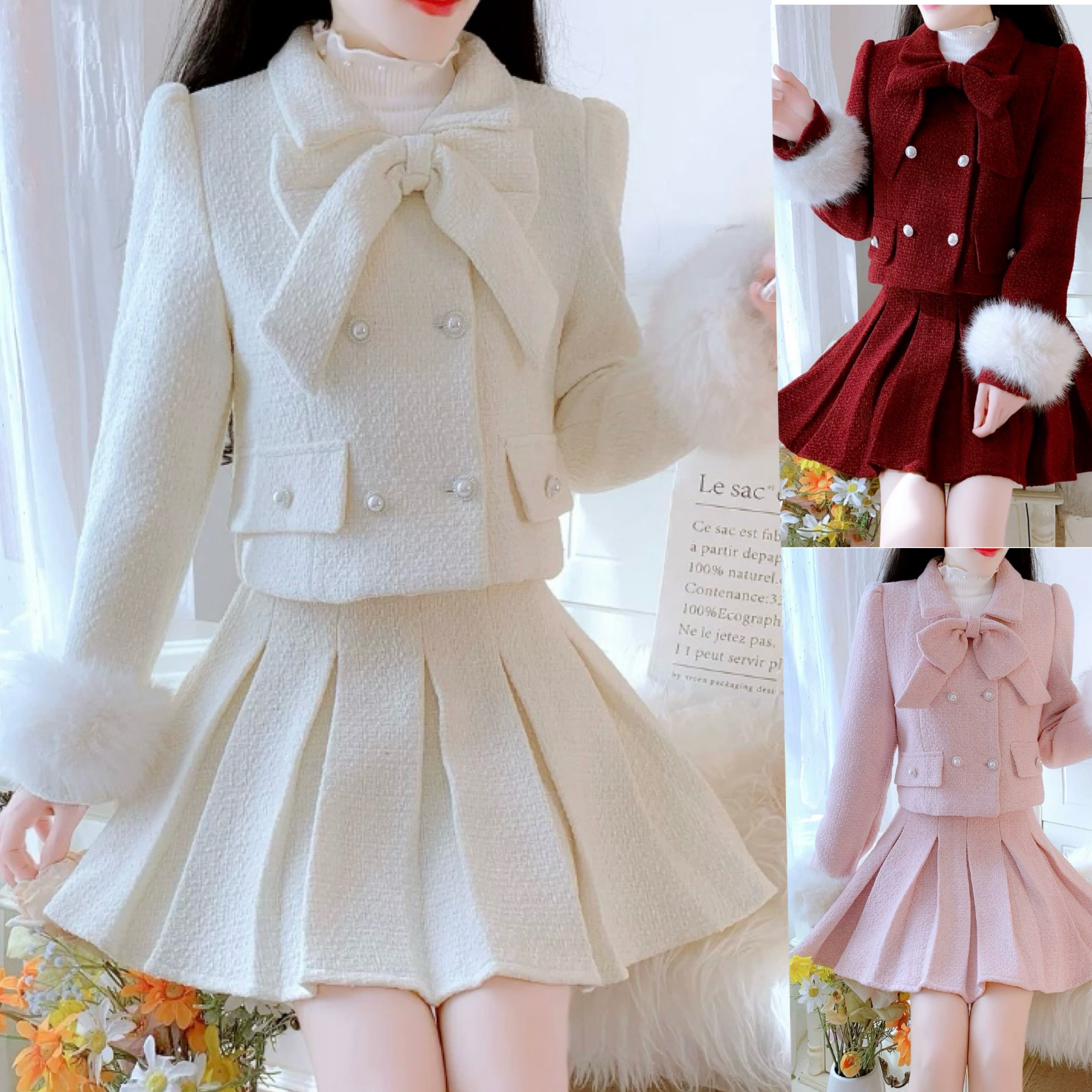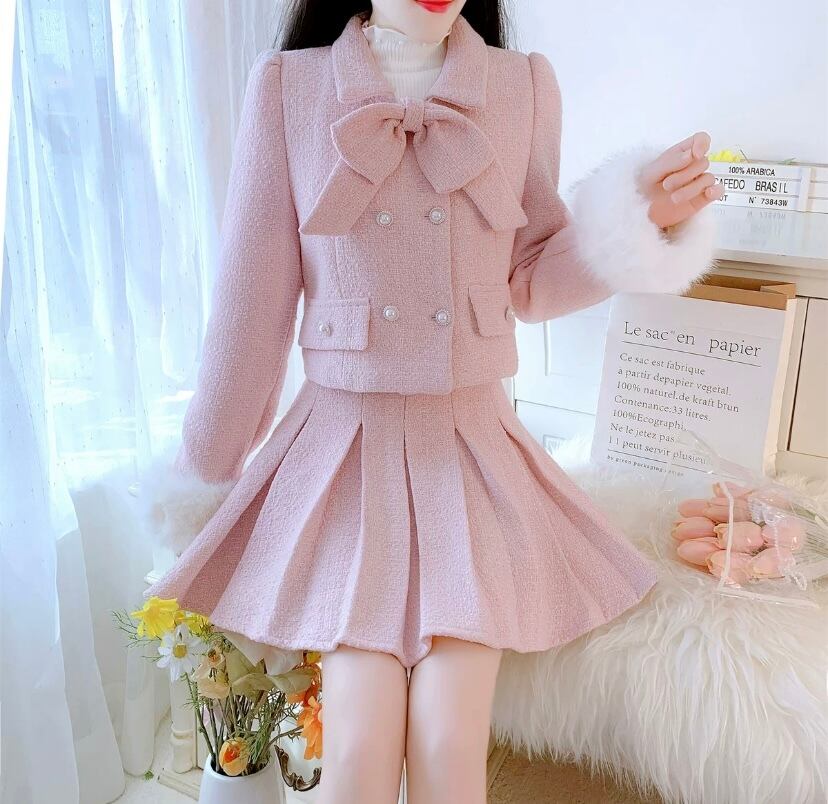 【セットアップ】ピンク ベージュ スーツ プリーツスカート ガーリー 制服 可愛い ジャケット ファー 白 リボン ガーリー スーツ リボン