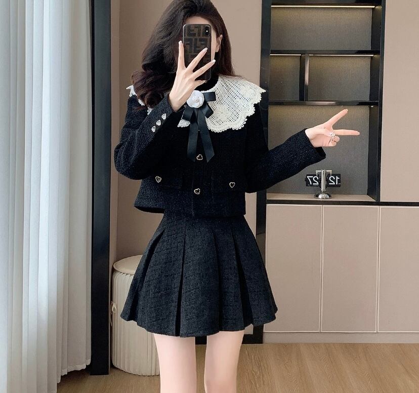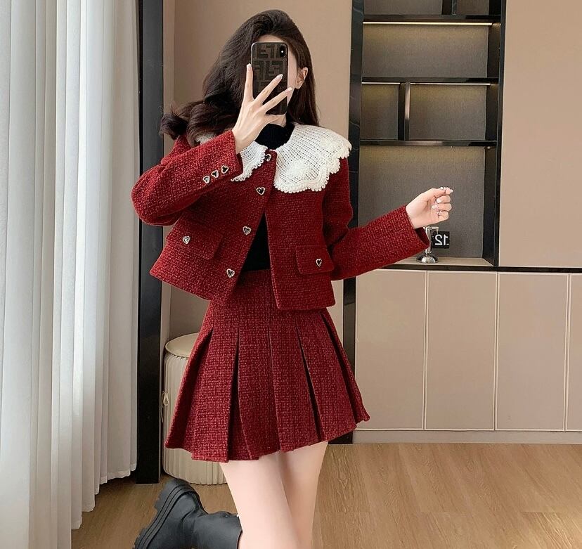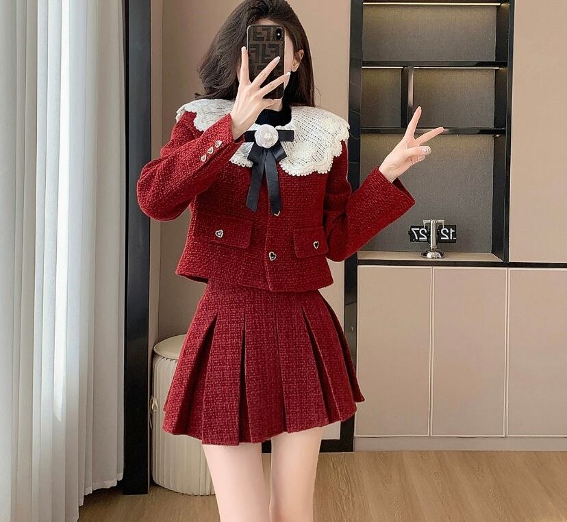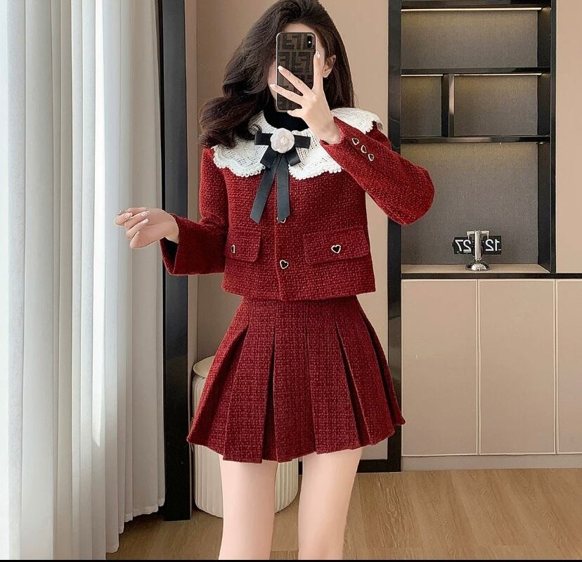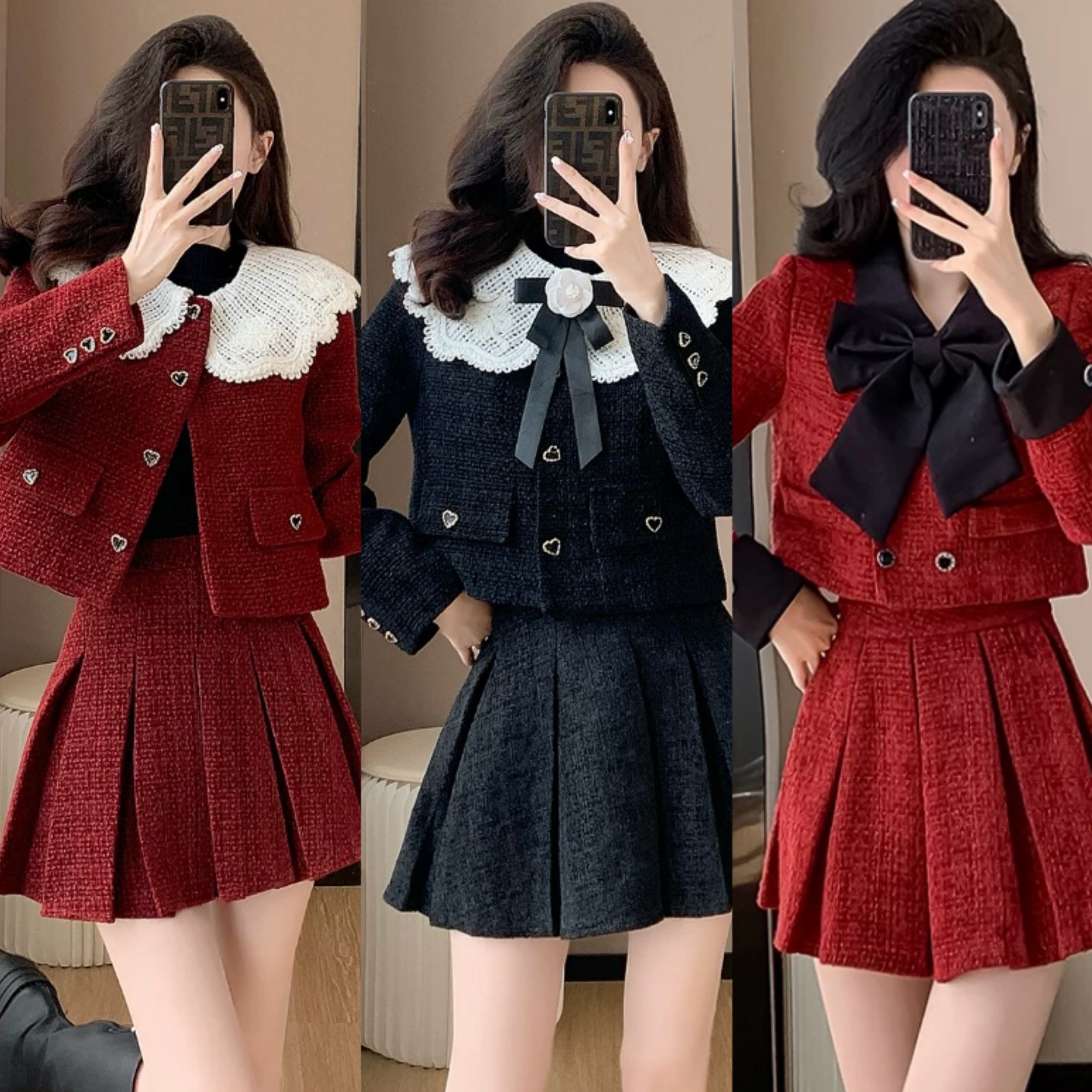 【セットアップ】ピンク ベージュ スーツ プリーツスカート ガーリー 制服 可愛い ジャケット ファー 白 リボン ガーリー スーツ 赤 黒 カメリア