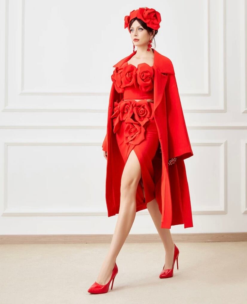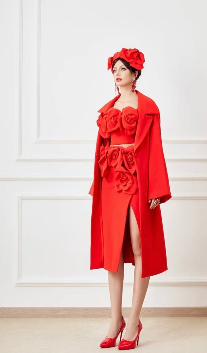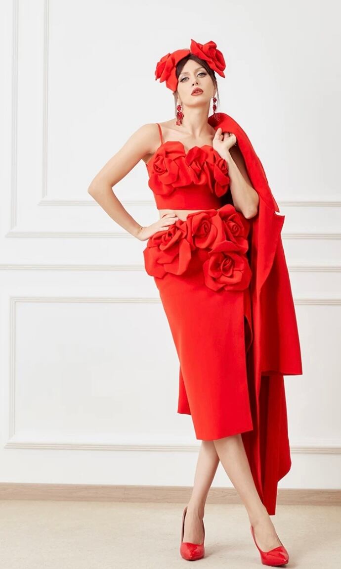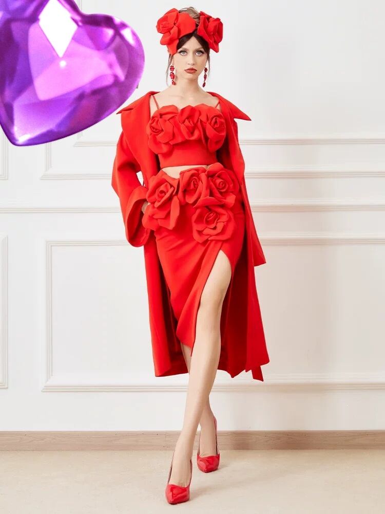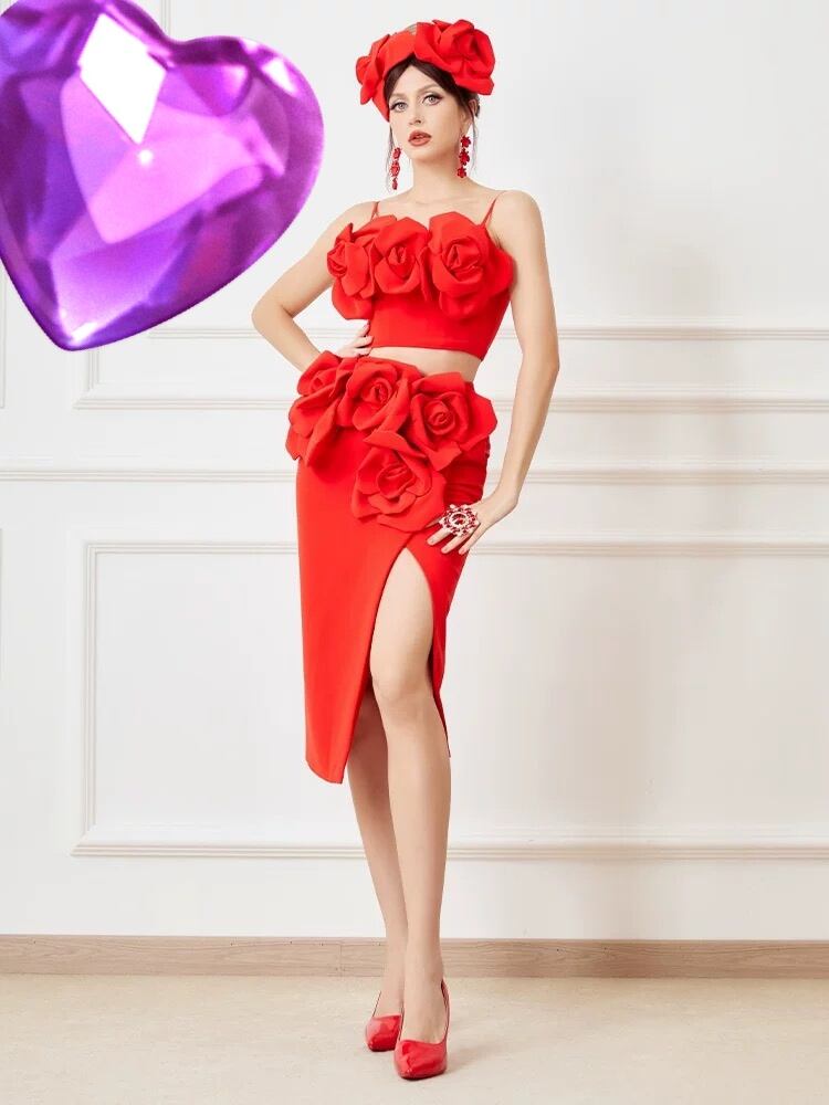 【3XLまで】赤 カメリア 薔薇 フラワー 花柄 コート キャミソール ドレス セレブ スカート スリット セットアップ パーティー 衣装