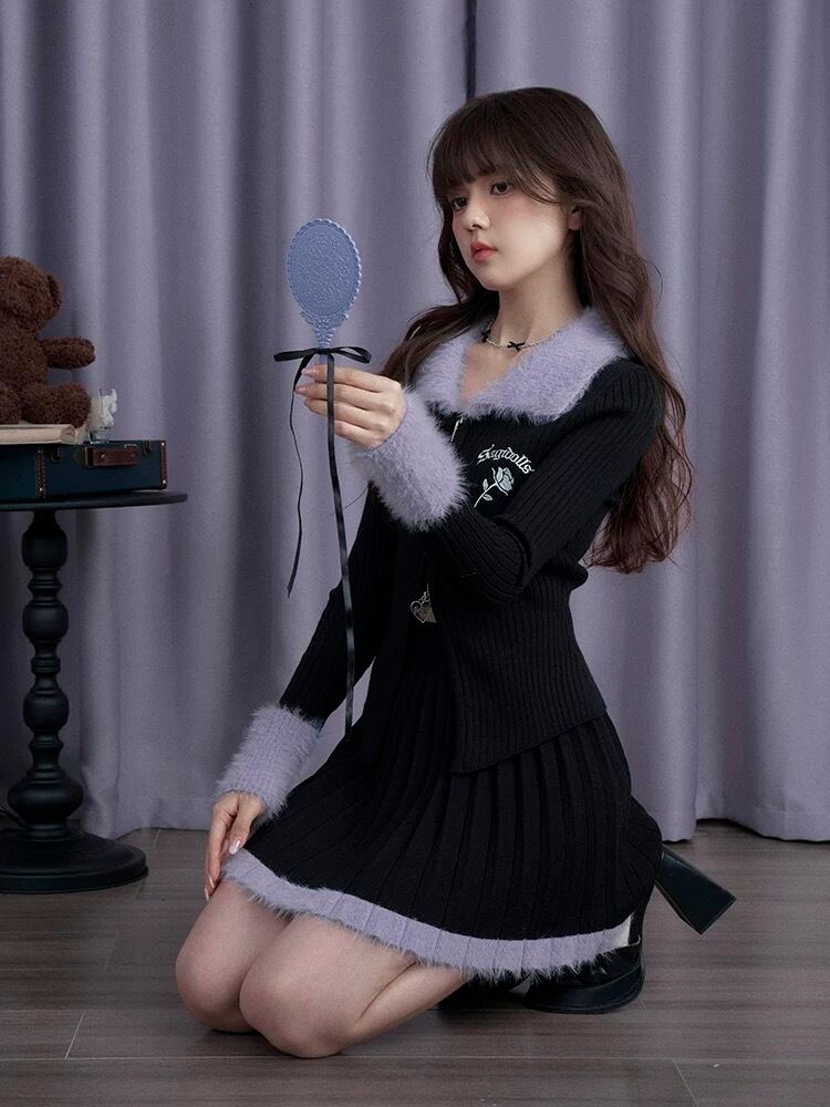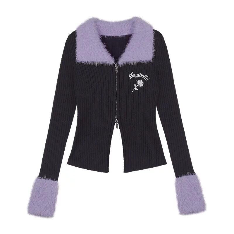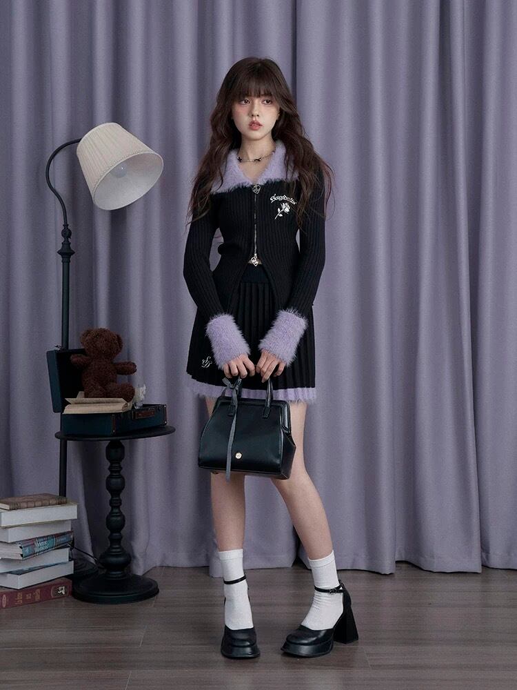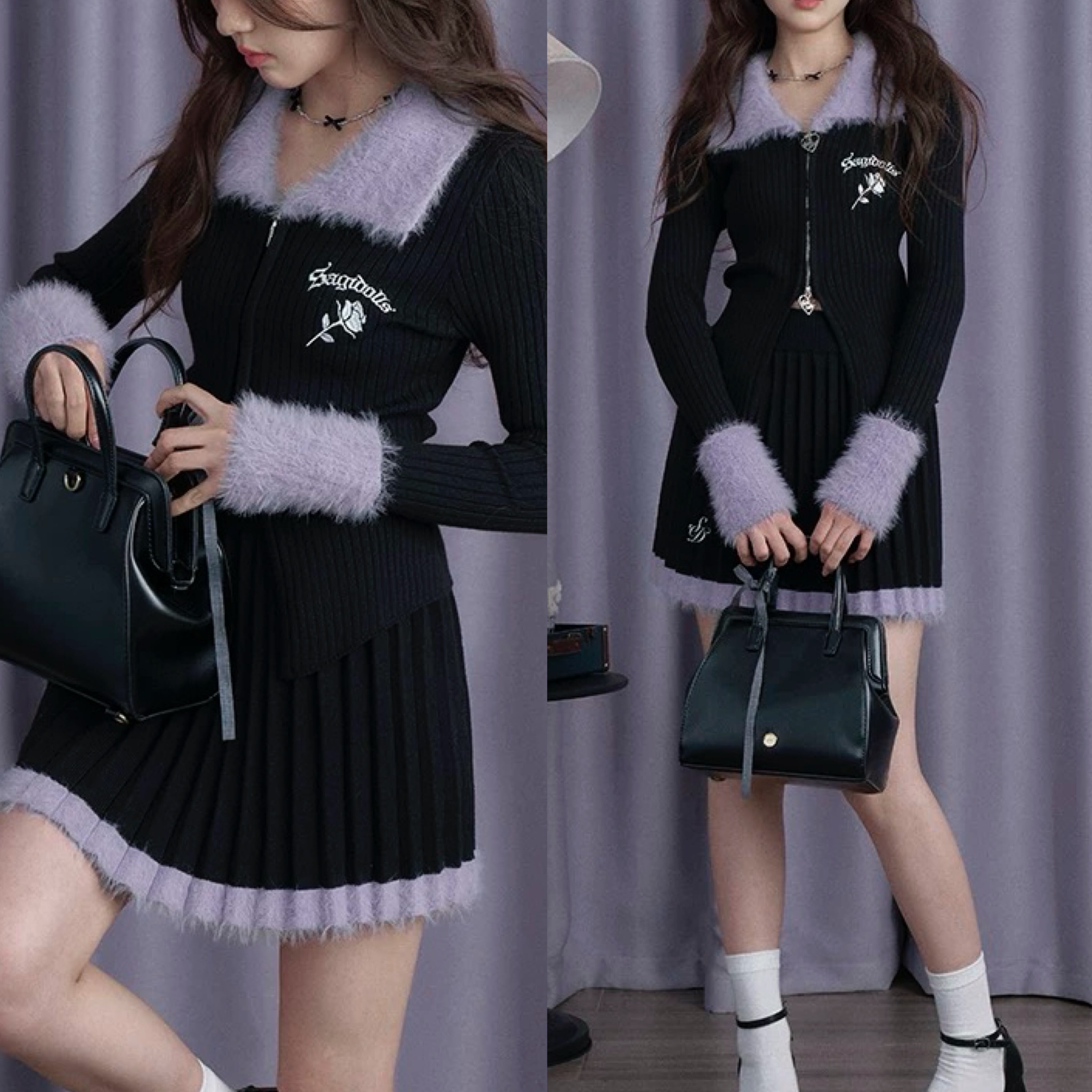 【セットアップ】黒 カーディガン セーター 紫 ファー ミニスカート
