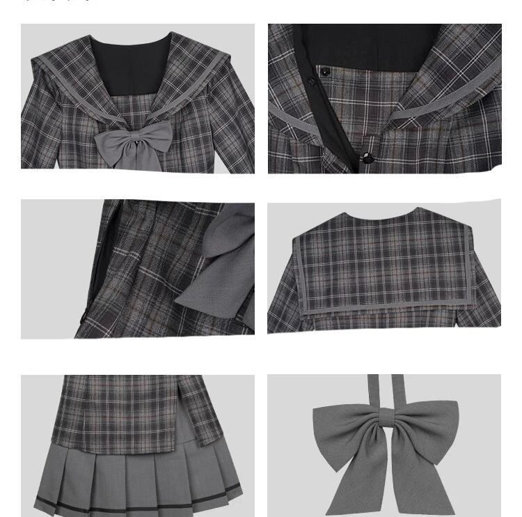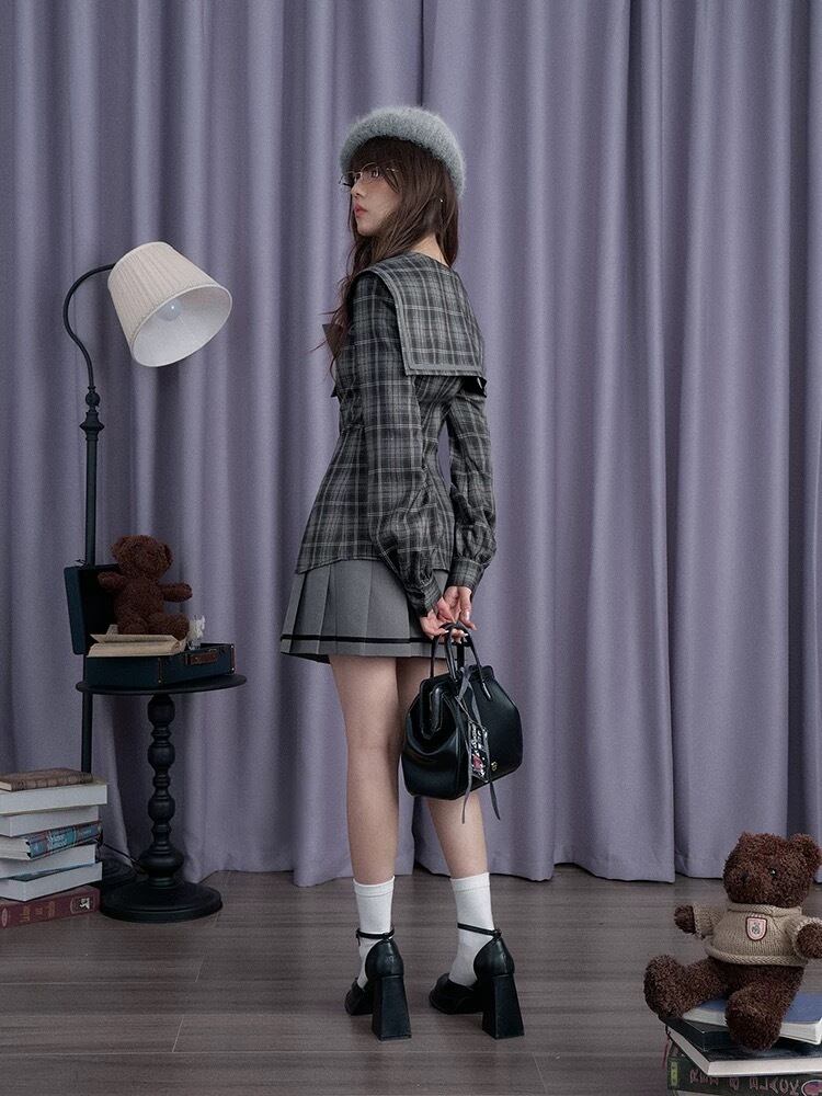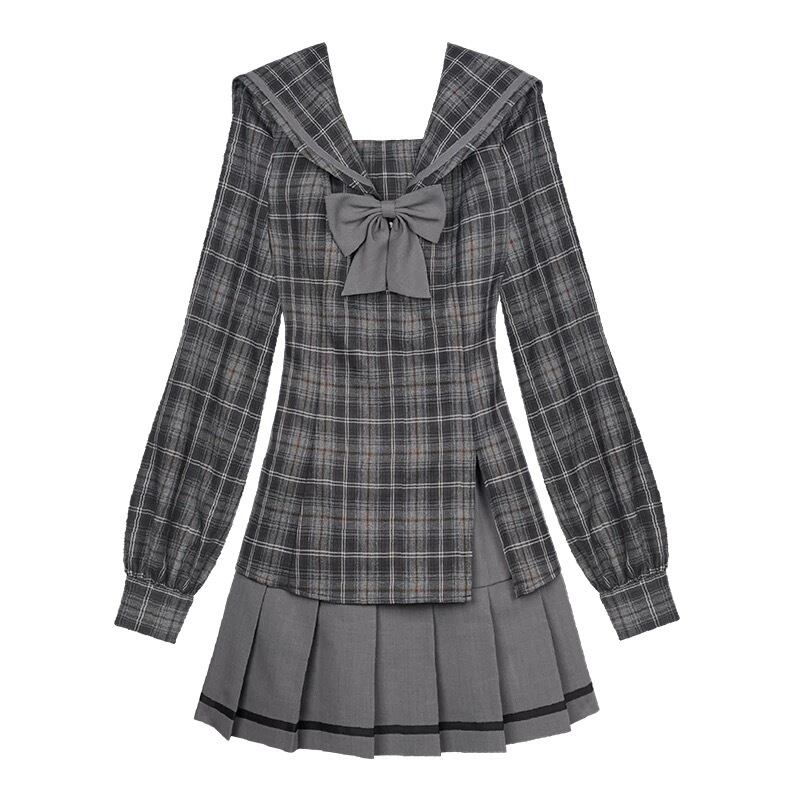 【ワンピース】グレー スクール セーラー チェック 制服 ワンピース ガーリー