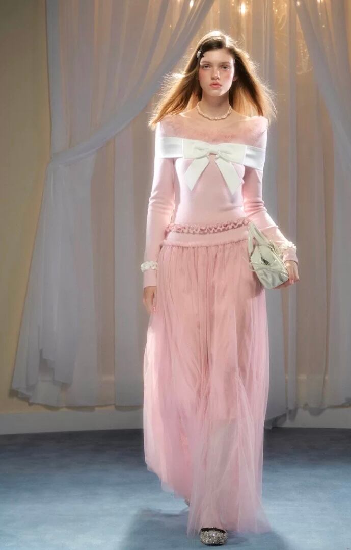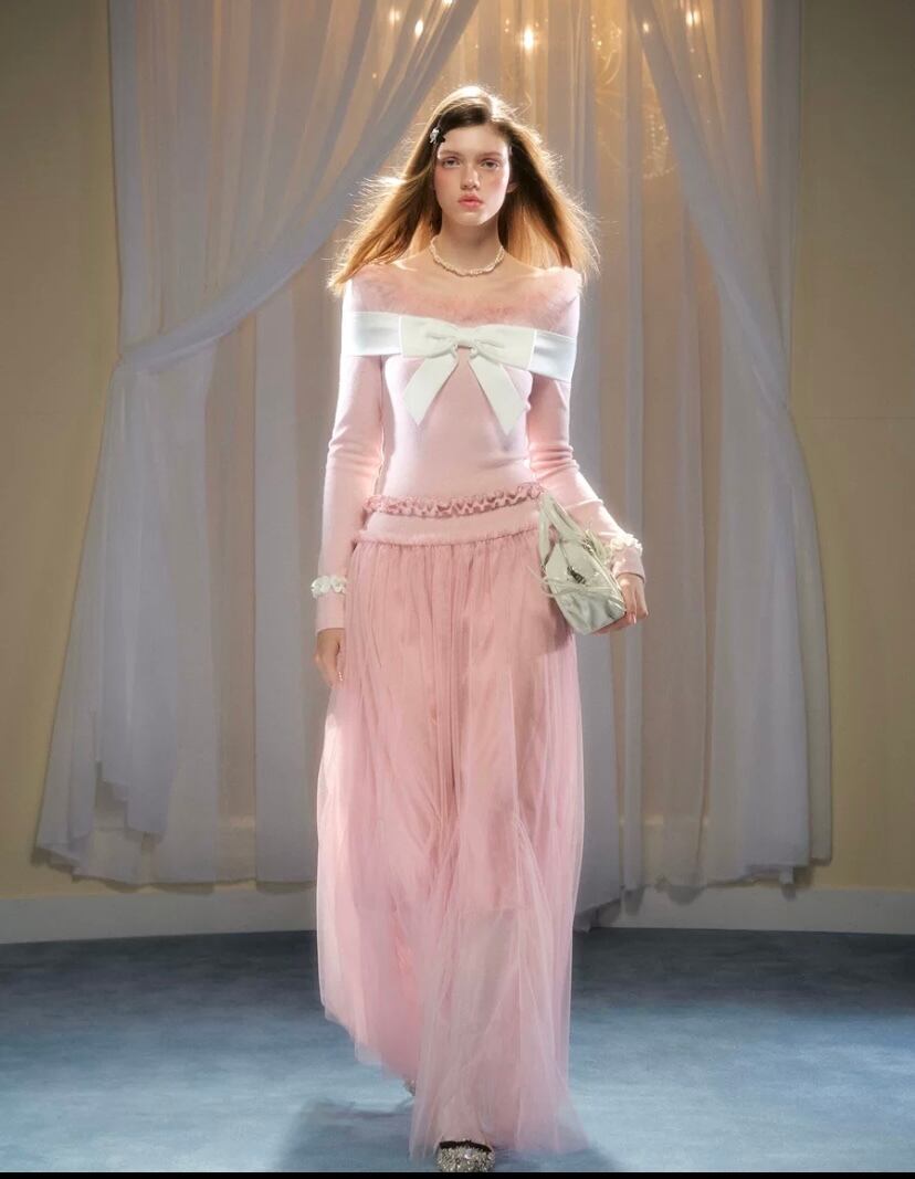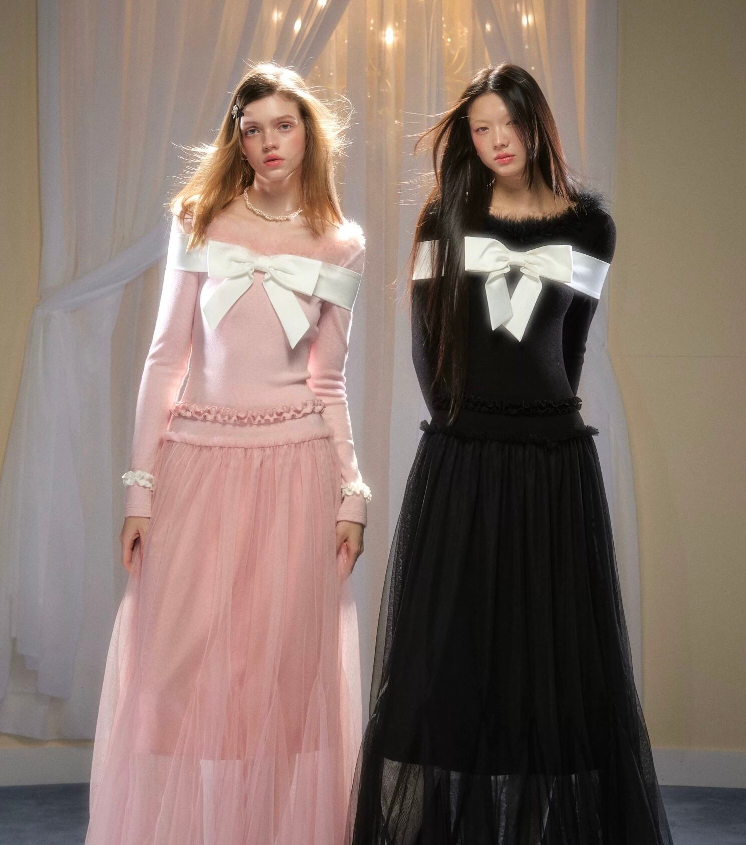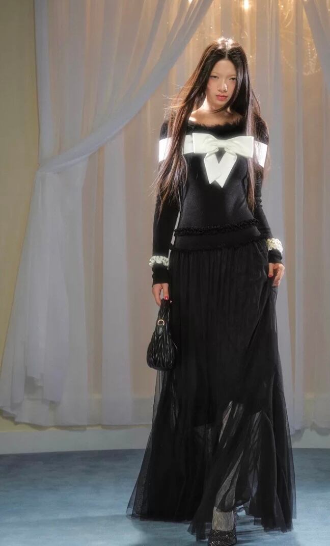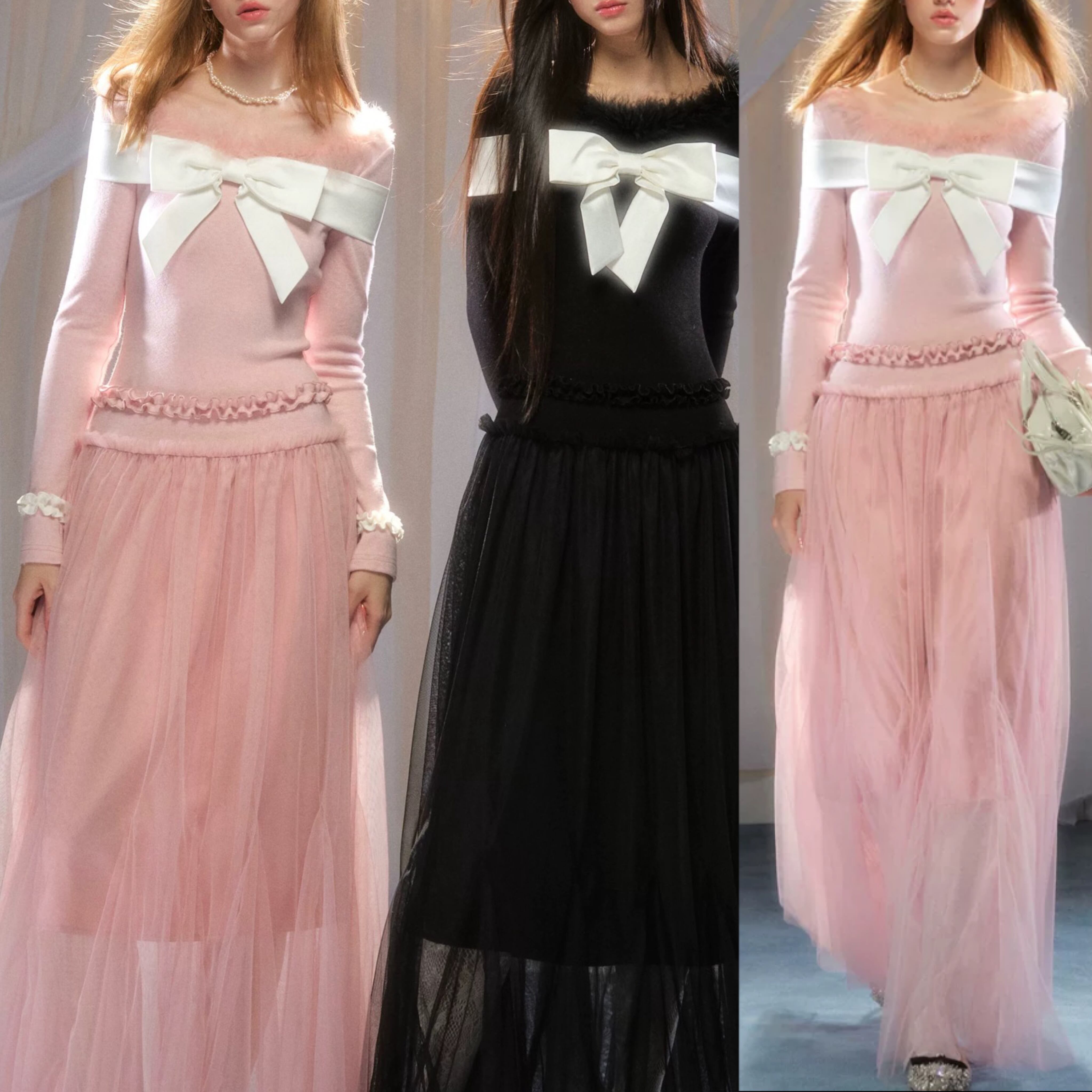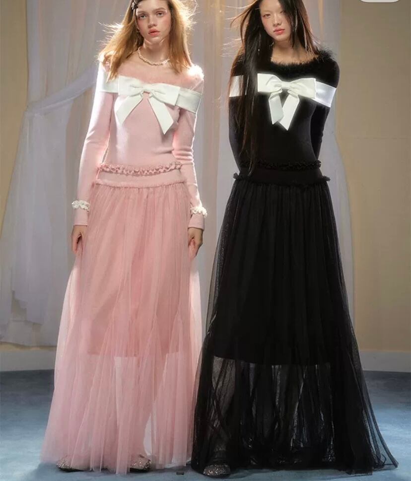 黒 ピンク ワンピース ガーリー 長袖 マキシ セーター リボン カーディガン