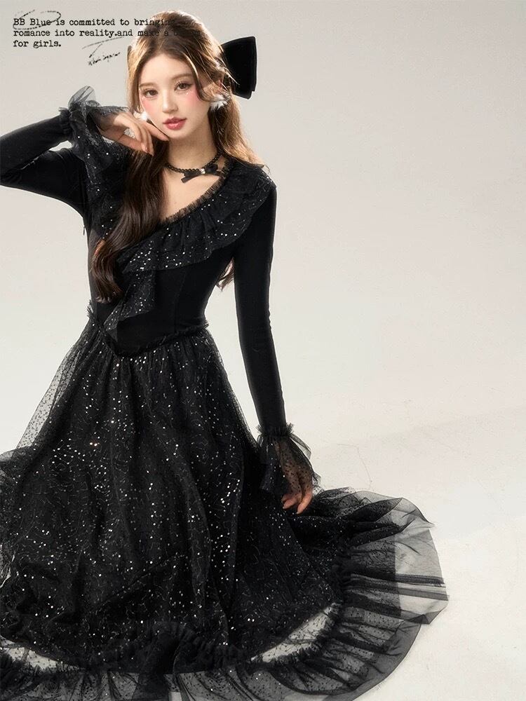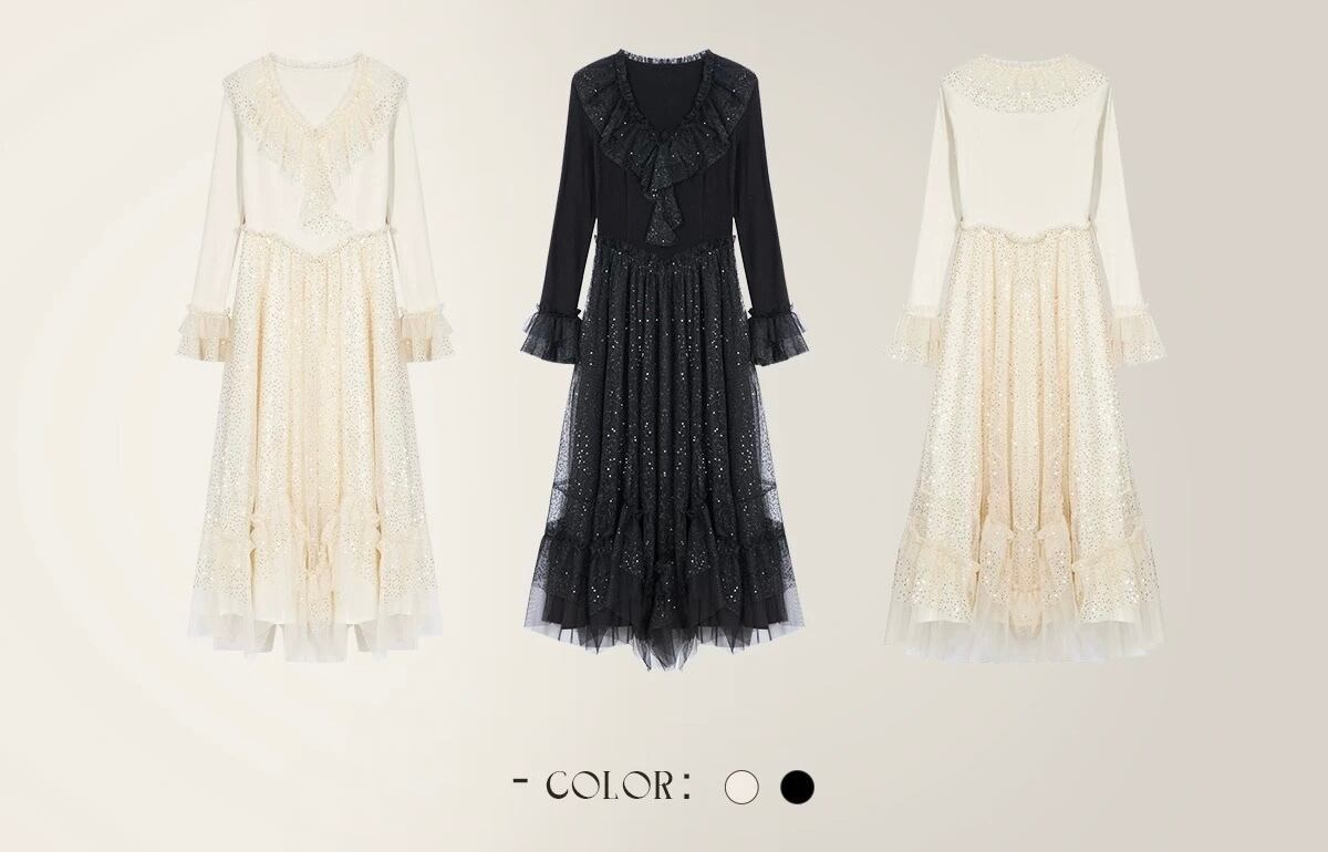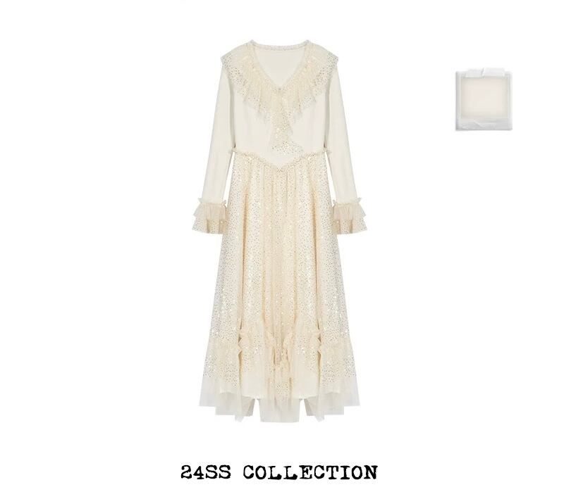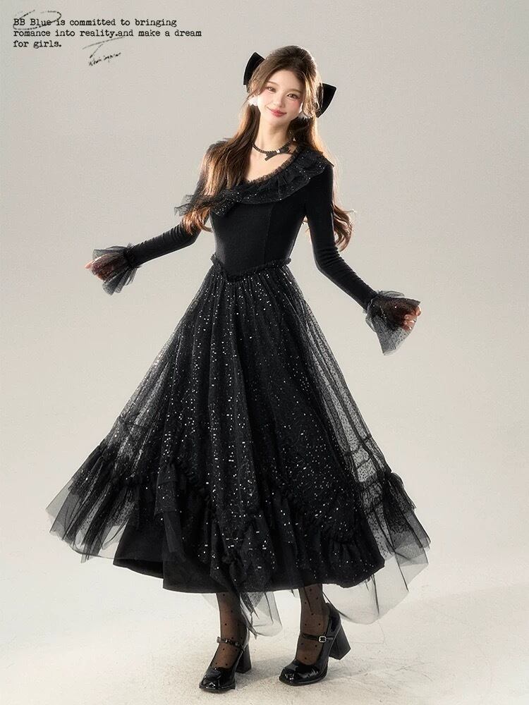 ブラウス キラキラ マキシ ベージュ 黒 スカート ワンピース ドレス