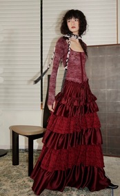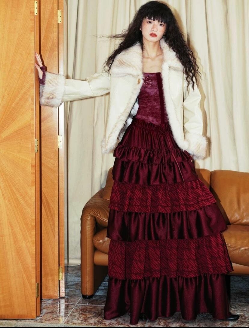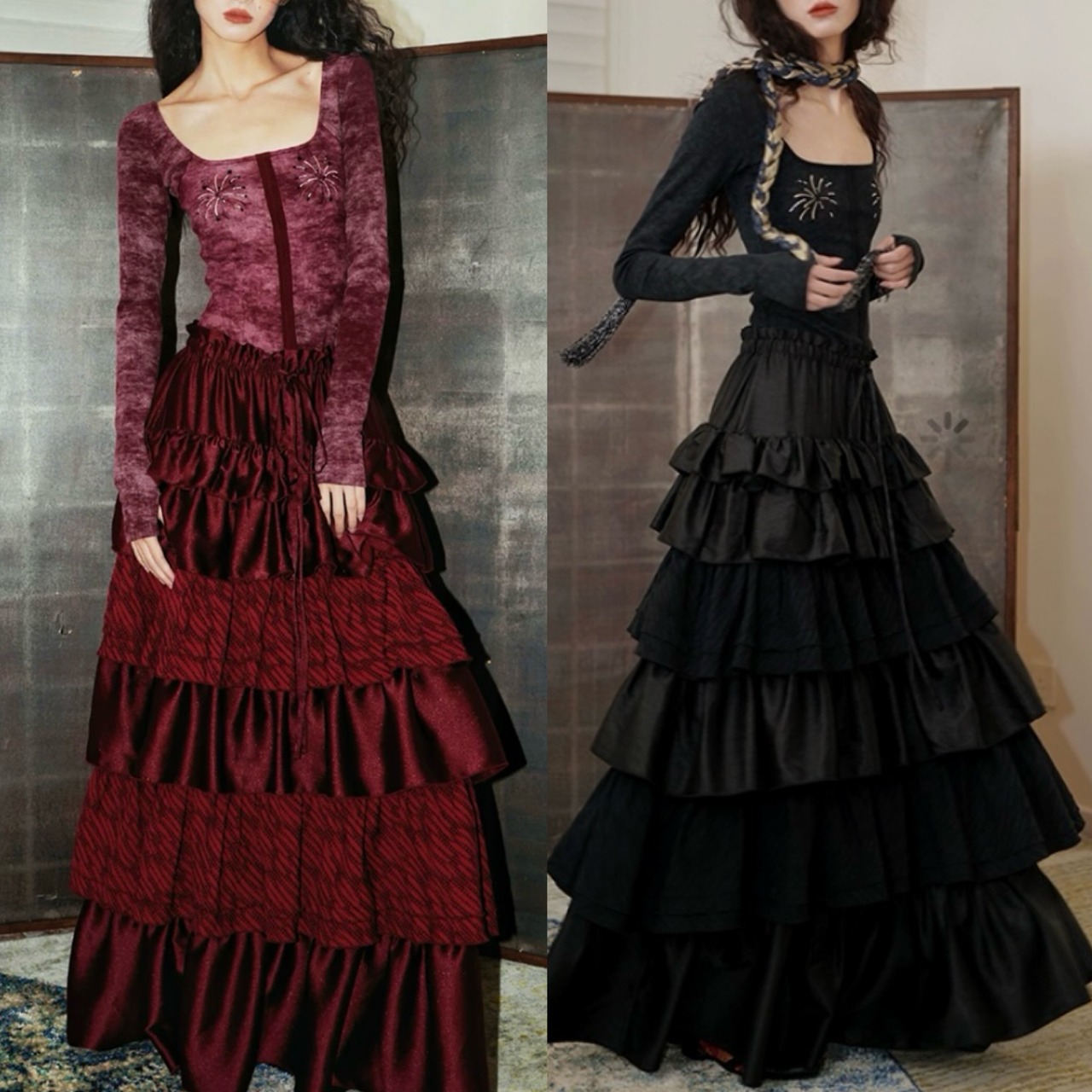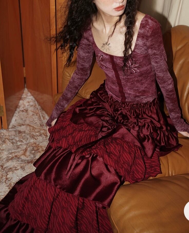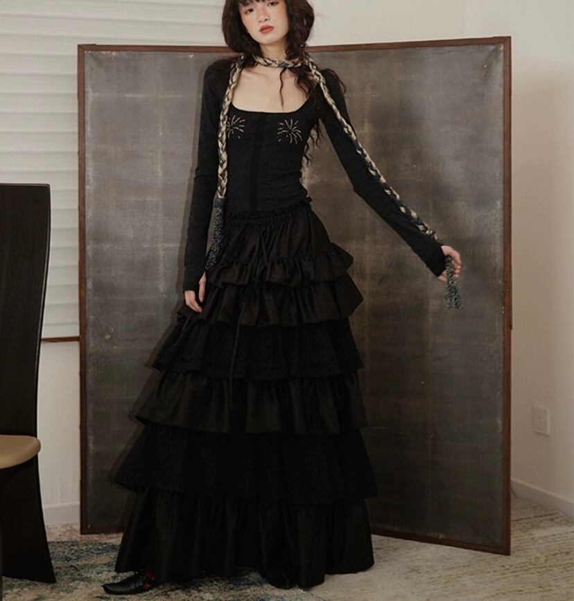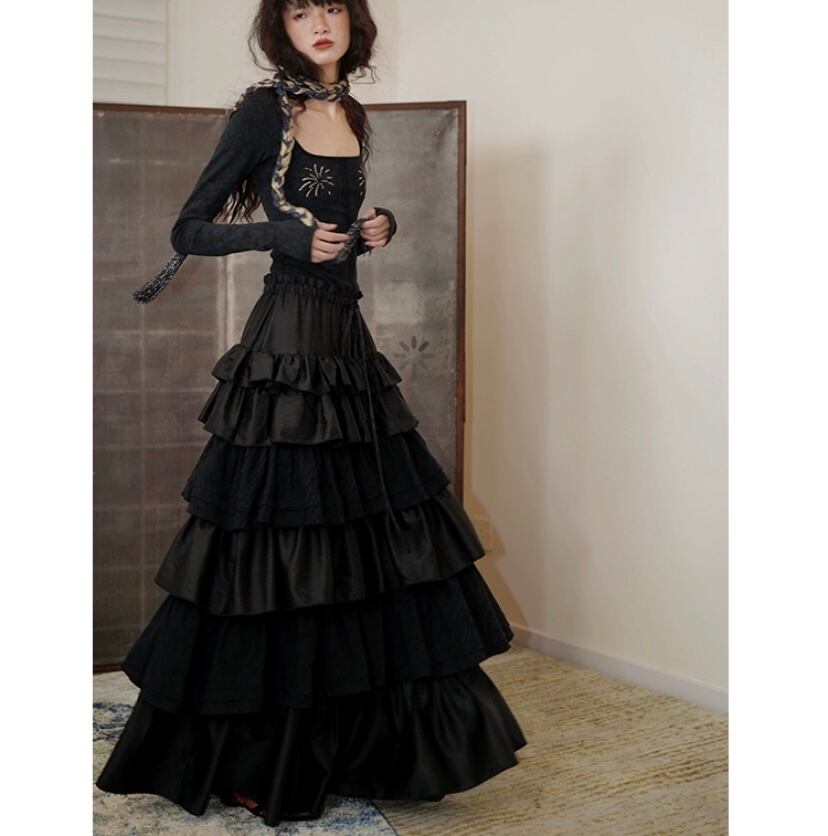 モード エレガント マキシ 黒 赤 フリル スカート ロング