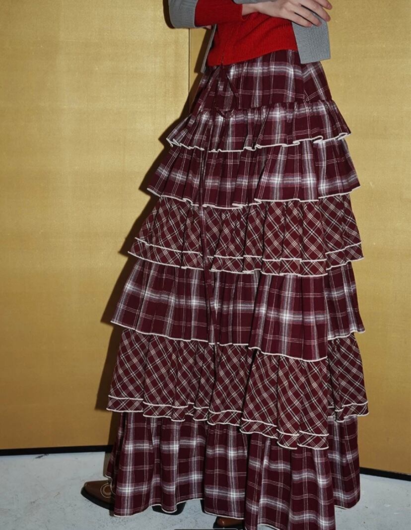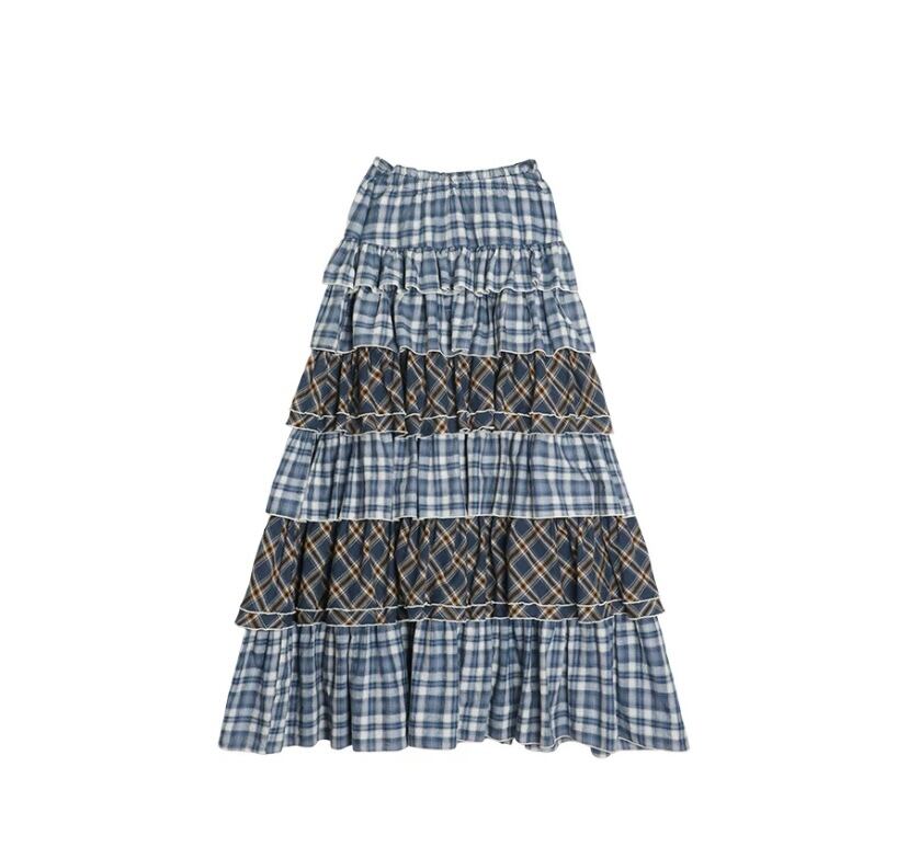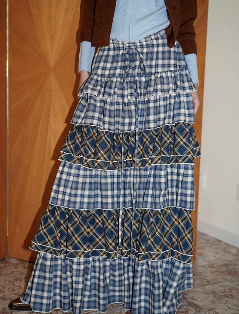 【2way】赤 水色 チェック ワンピース スカート マキシ ロング フリル ボトムス
