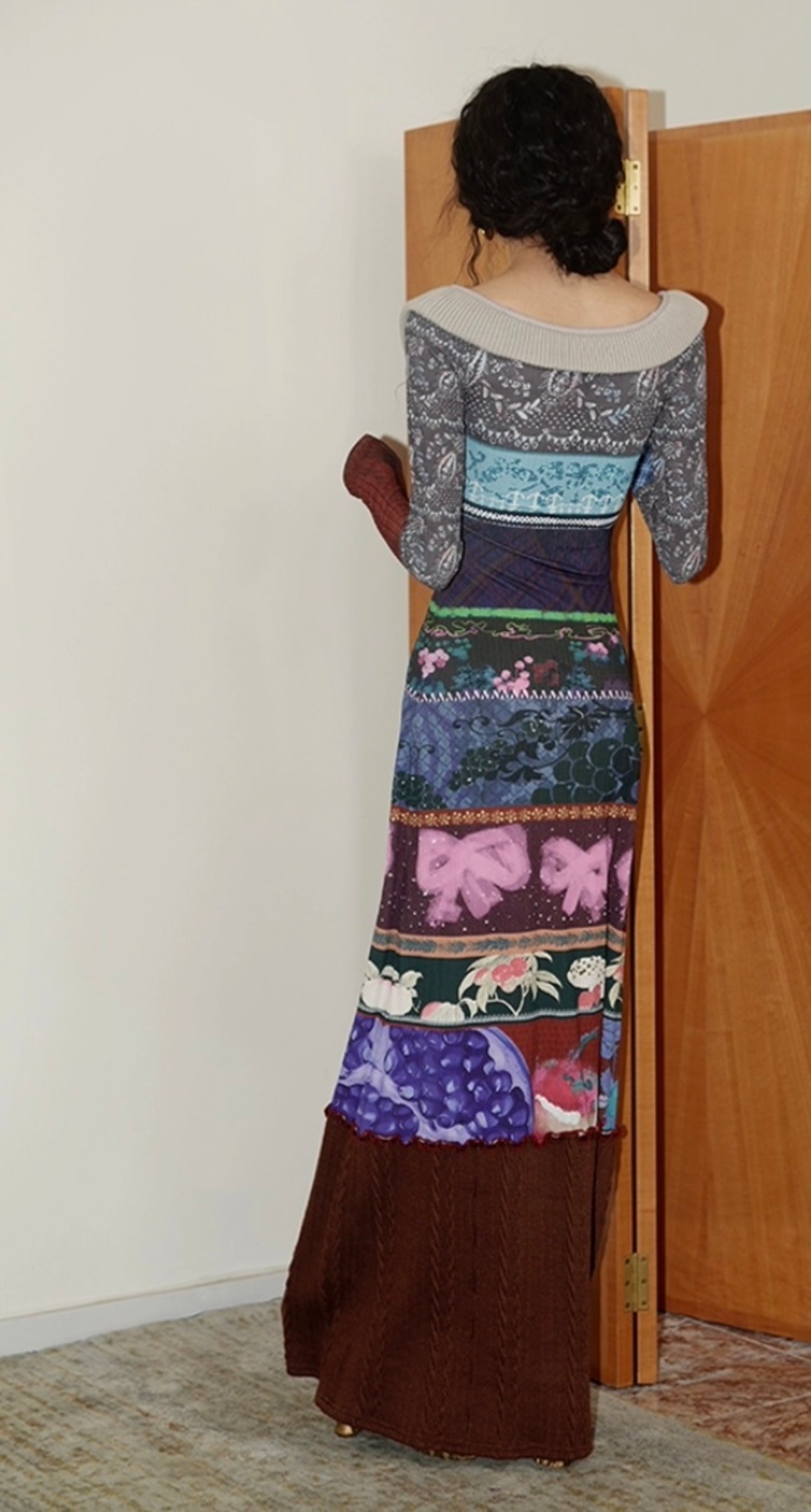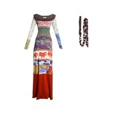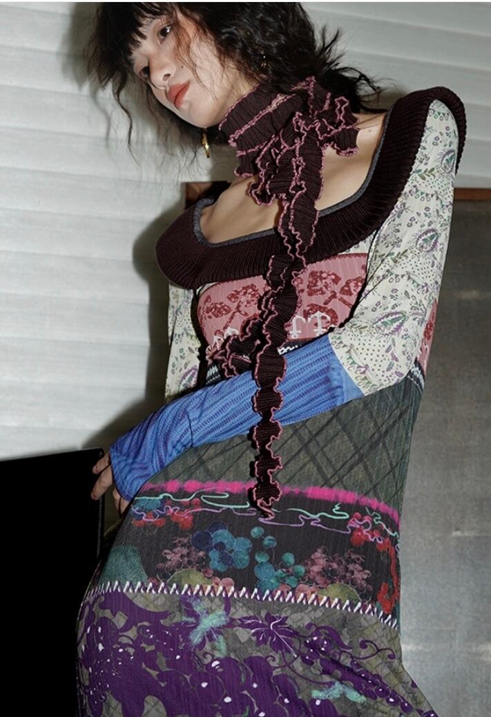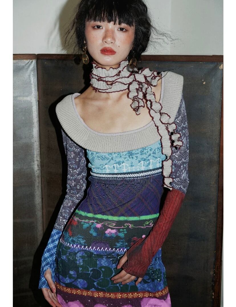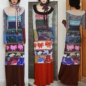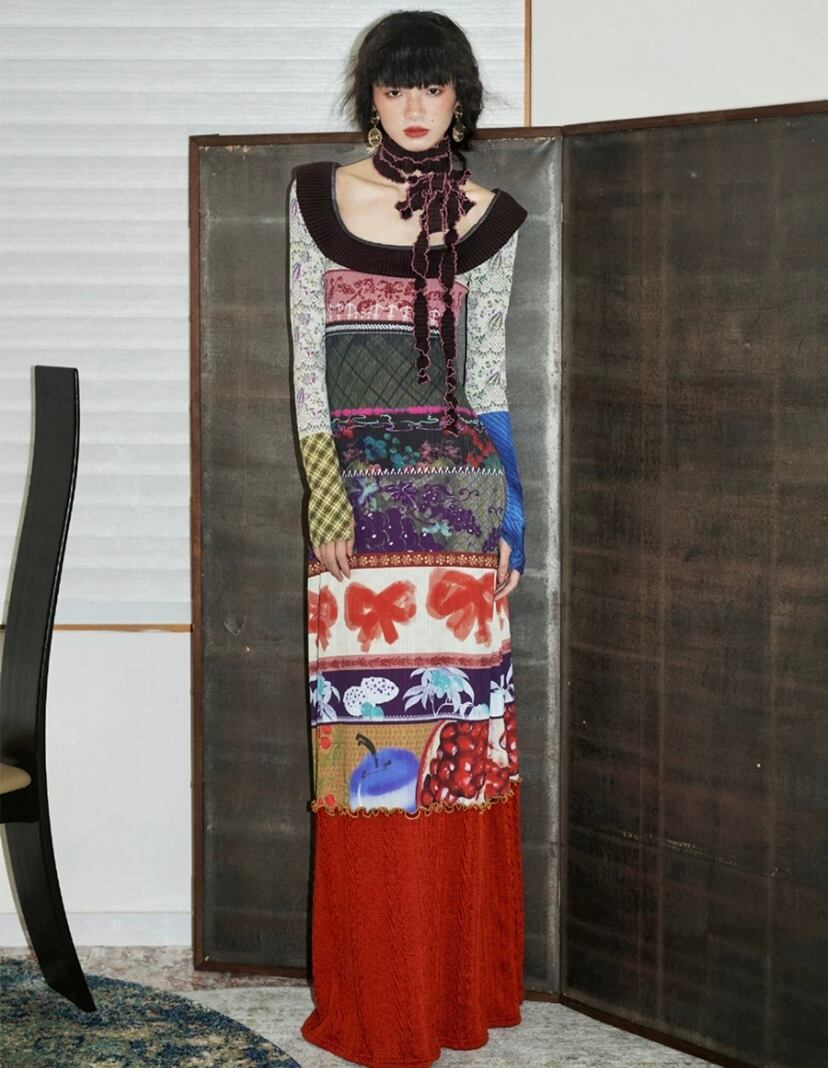 パッチワーク リボン エスニック アジアン 水色 グレー 赤 ワンピース ドレス