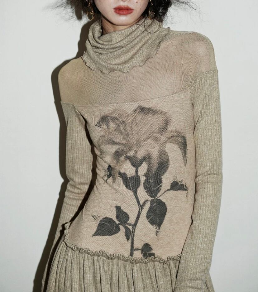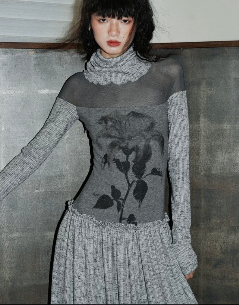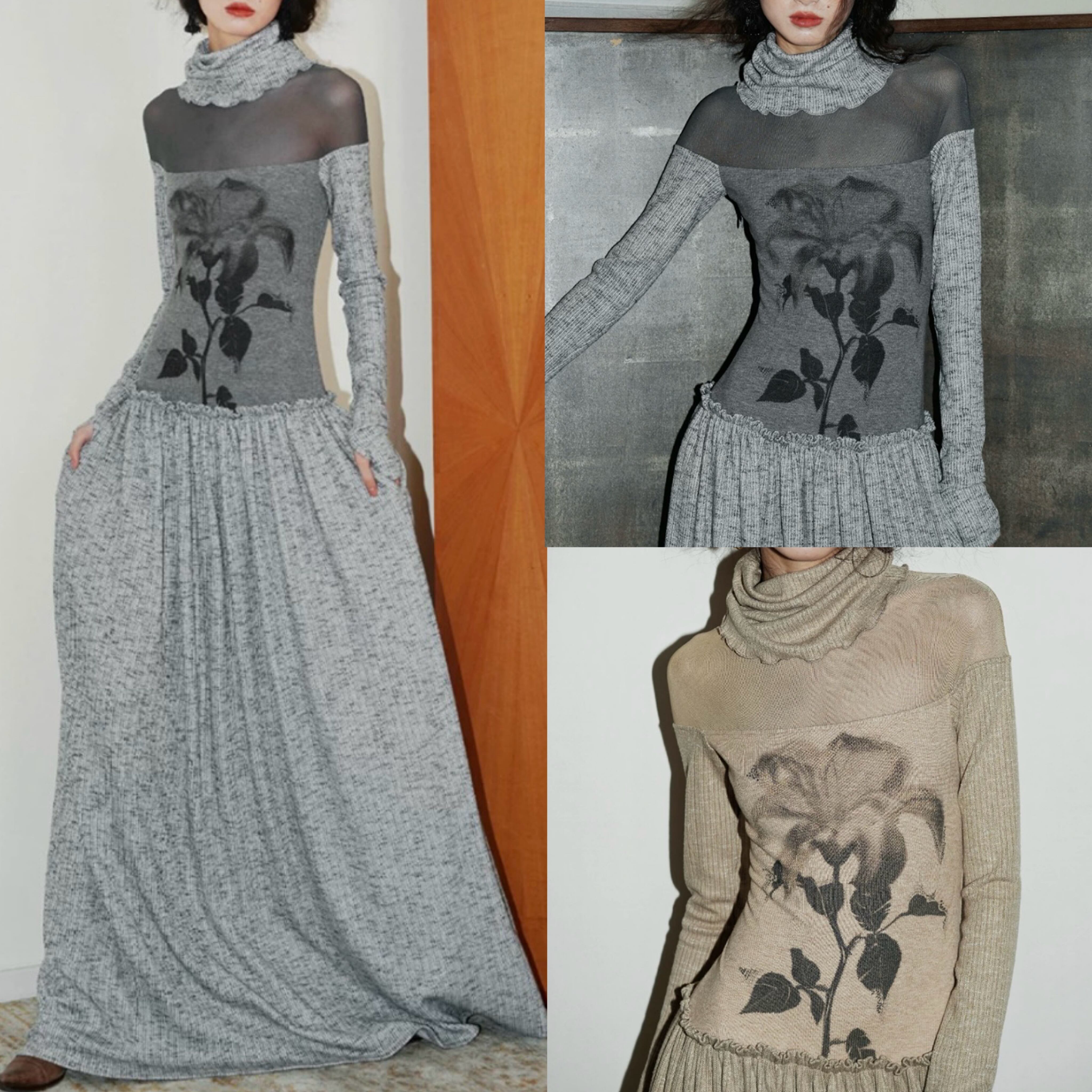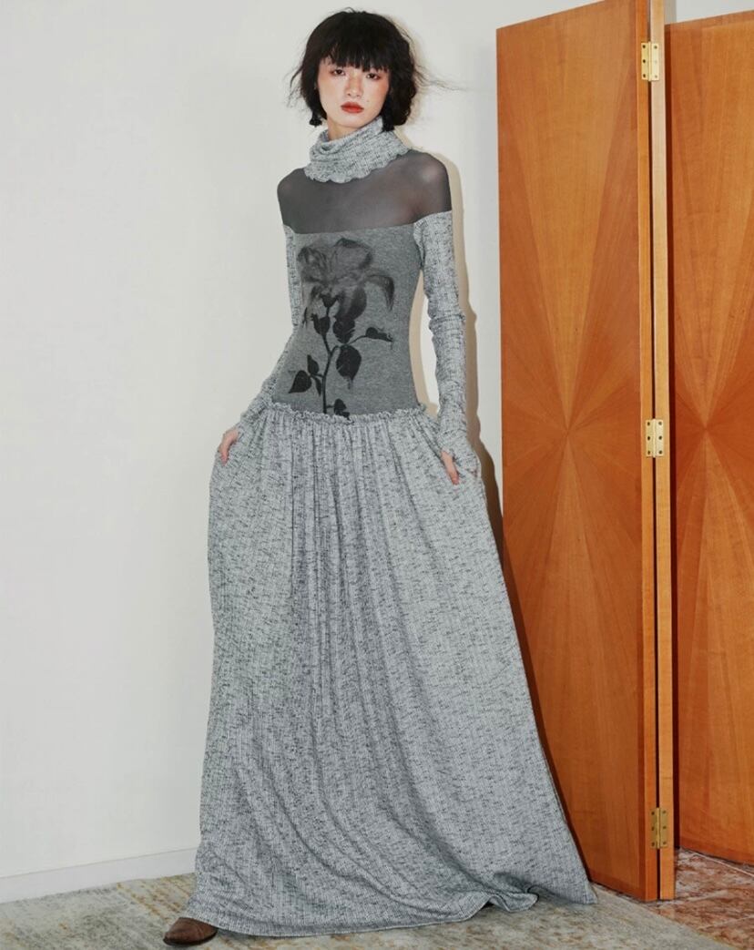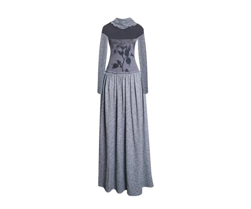 グレー ベージュ マキシ ロング 百合 花柄 カジュアル ワンピース