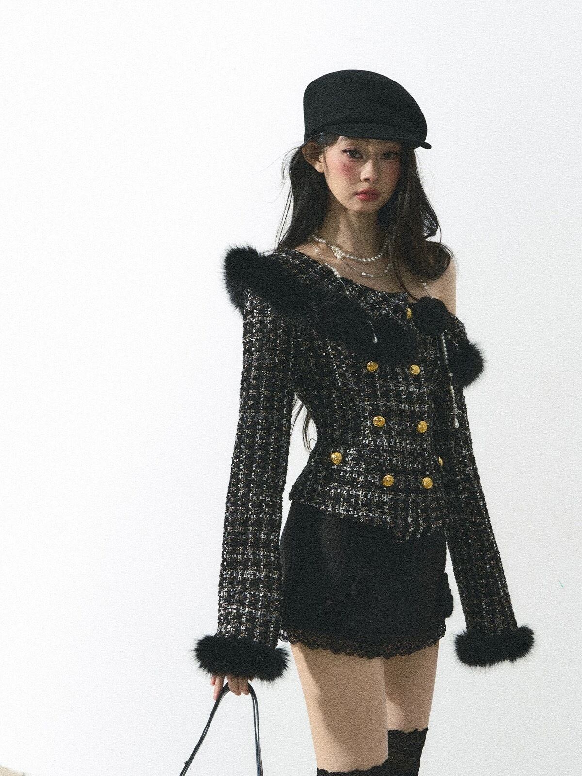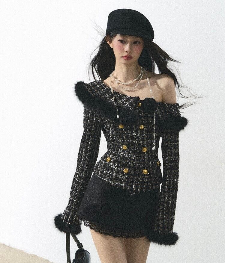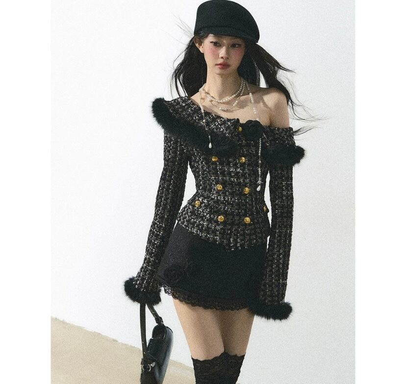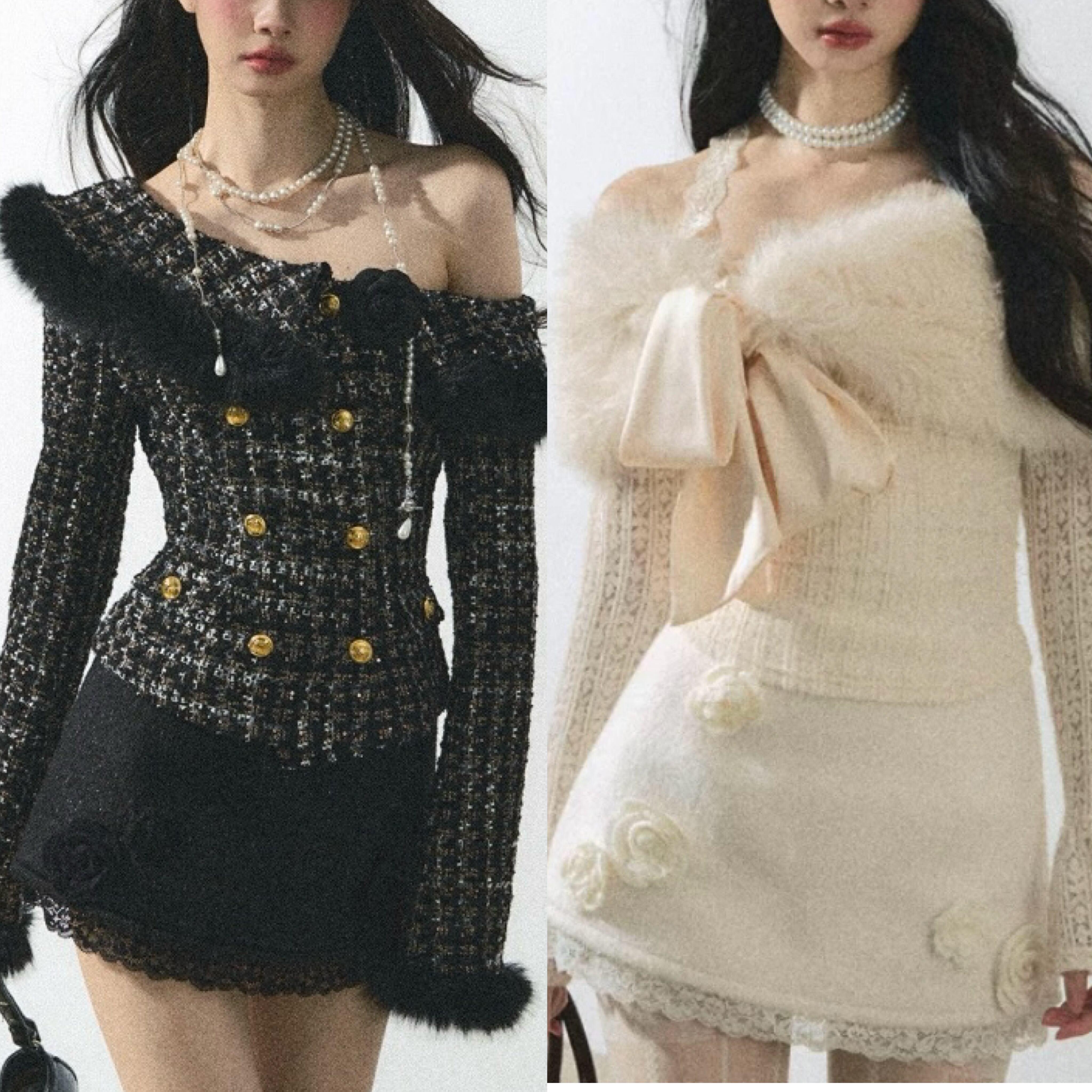 オフショルダー ブラウス ジャケット リボン ツイード ベージュ 黒 リボン ガーリー