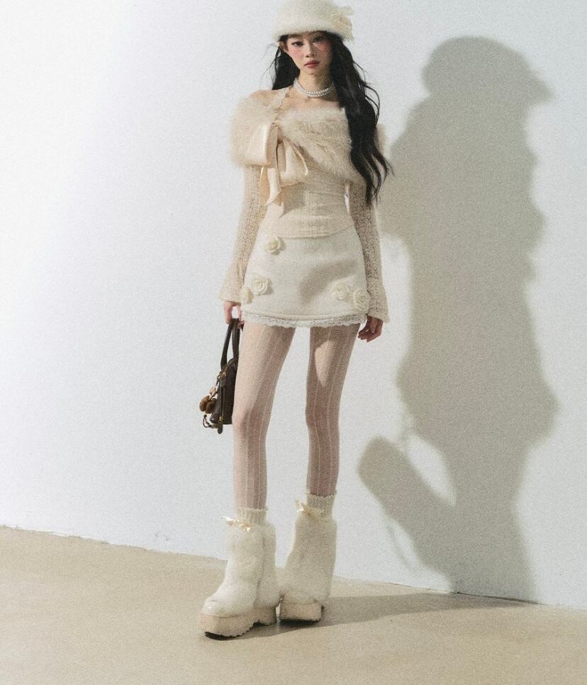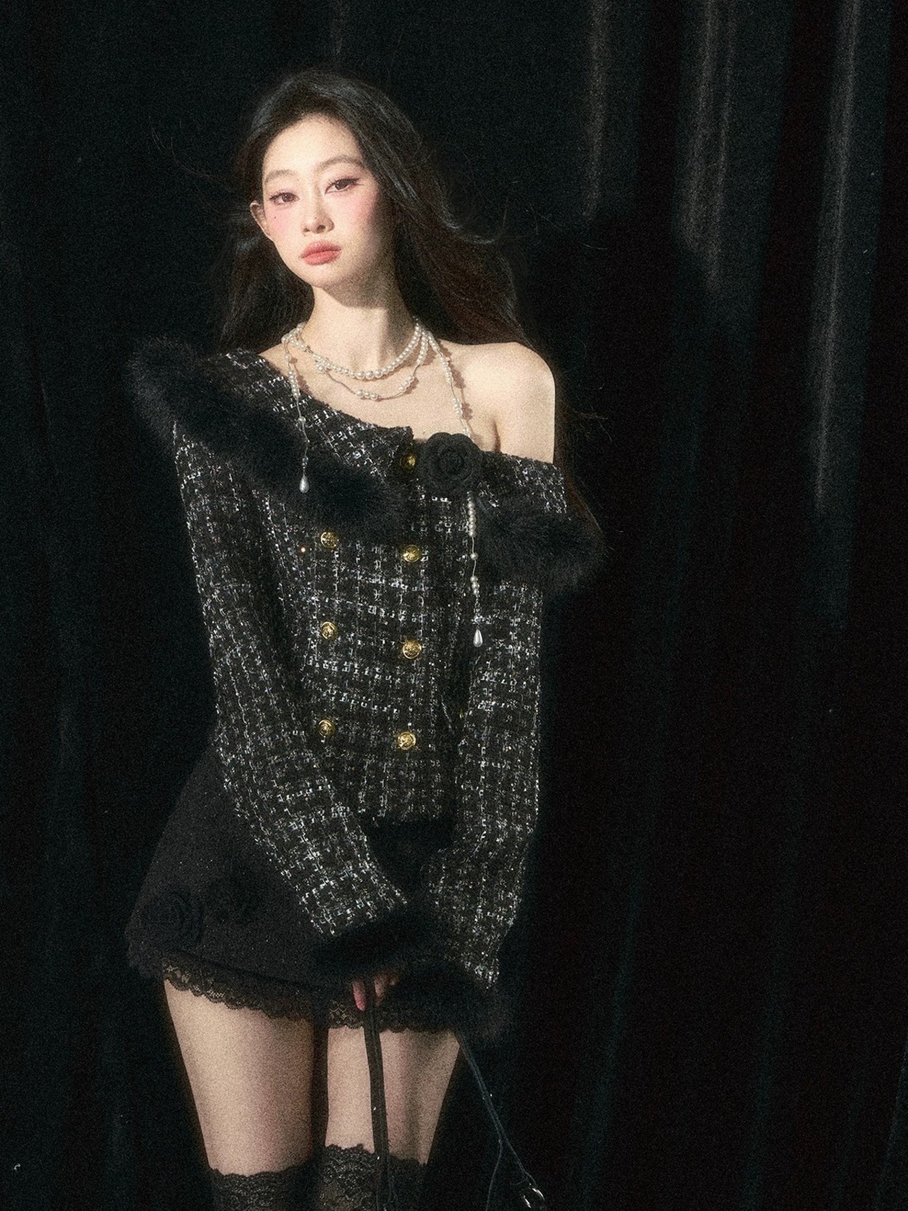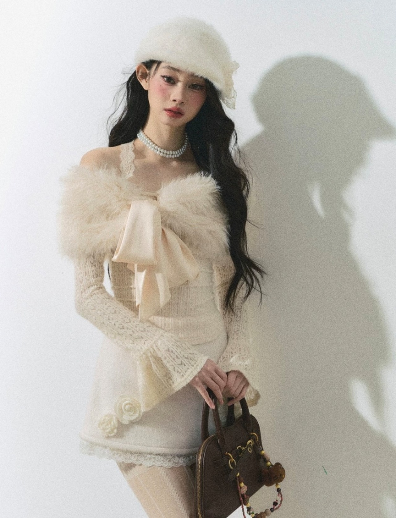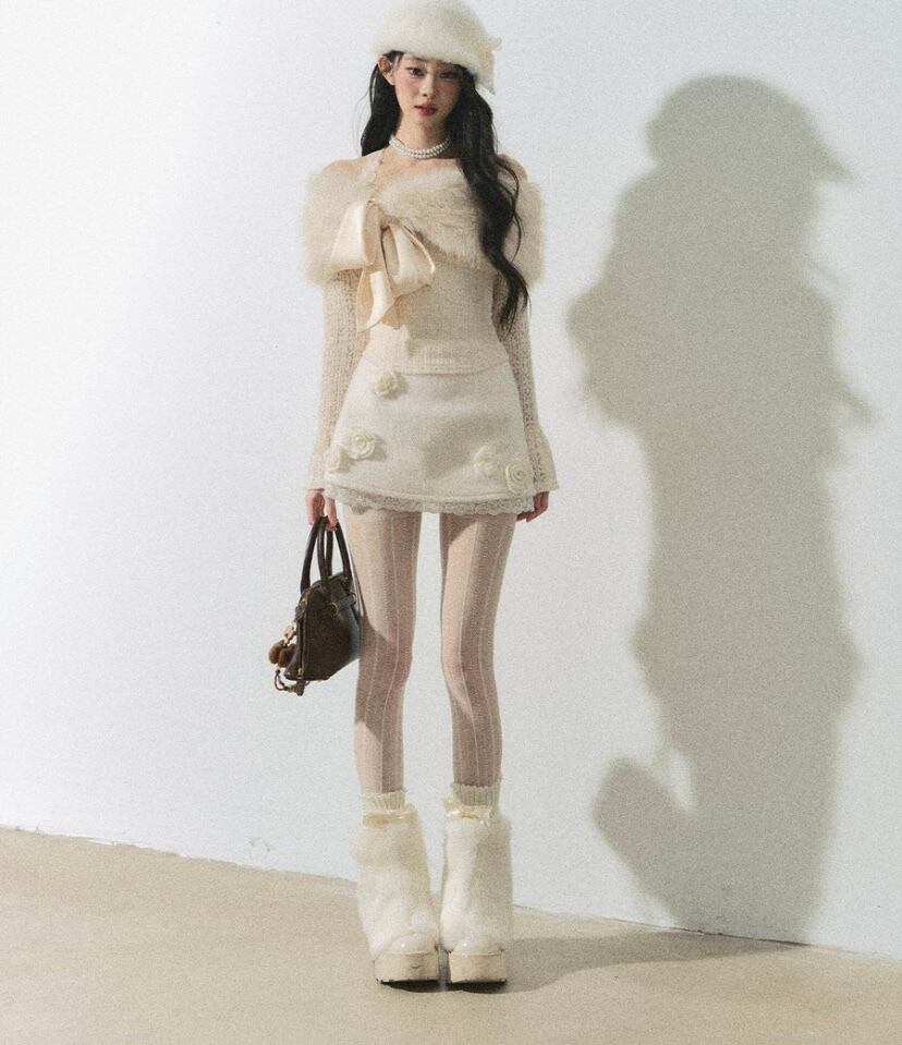 オフショルダー ブラウス ジャケット リボン ツイード ベージュ 黒 リボン ガーリー