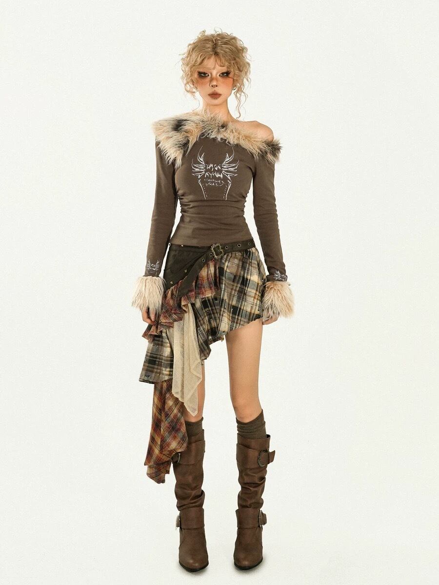 ベージュ カーキ オフショルダー ファー ブラウス トップス
