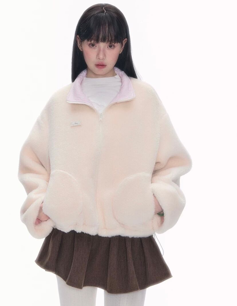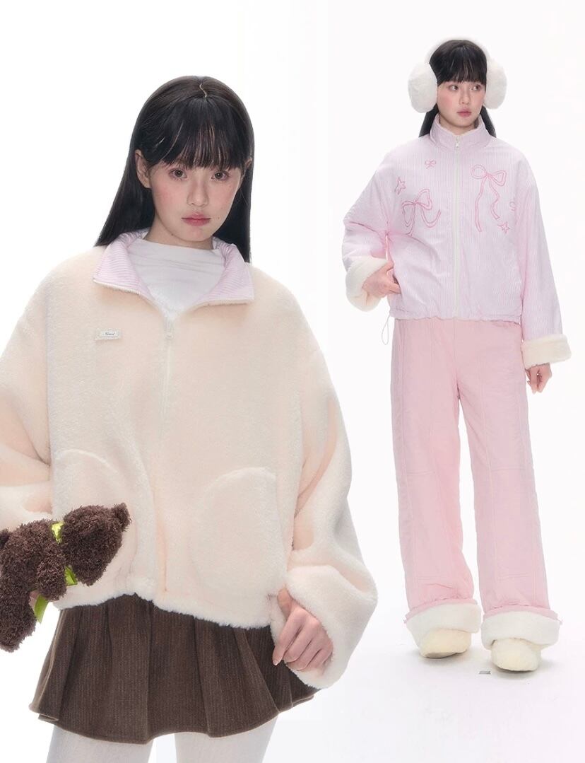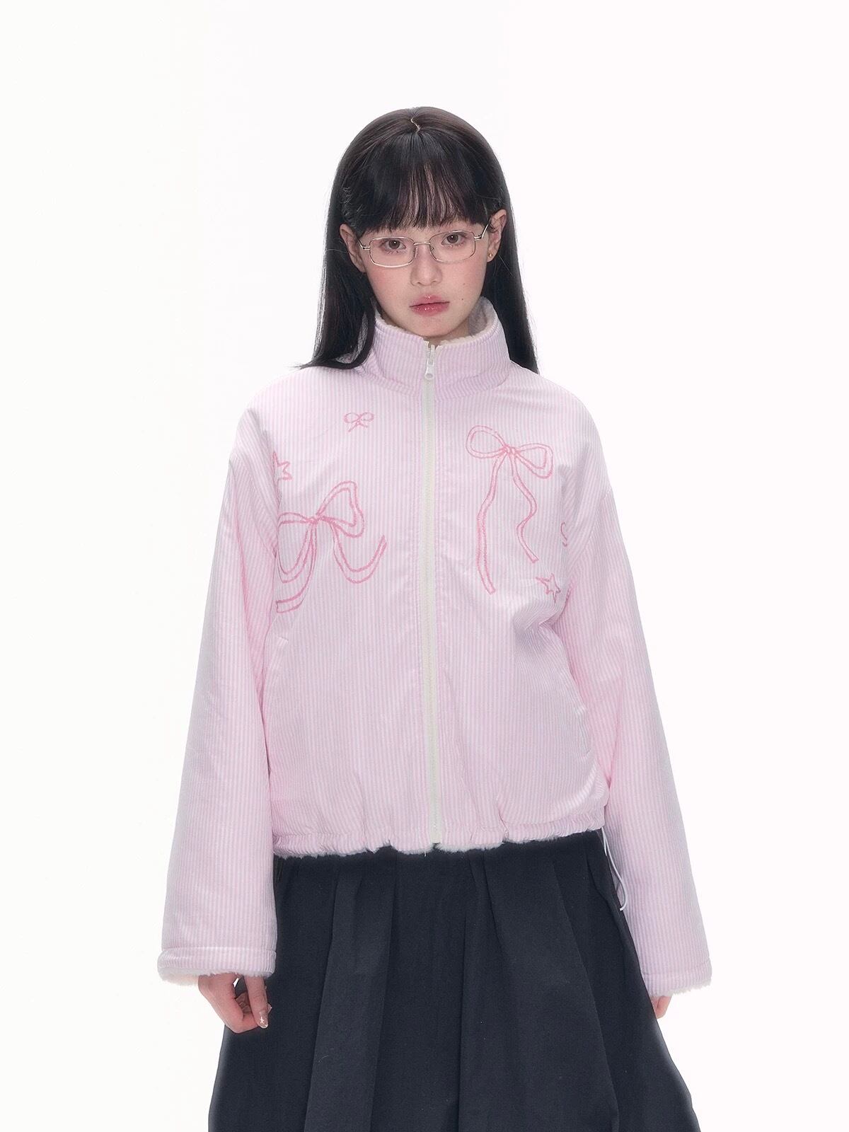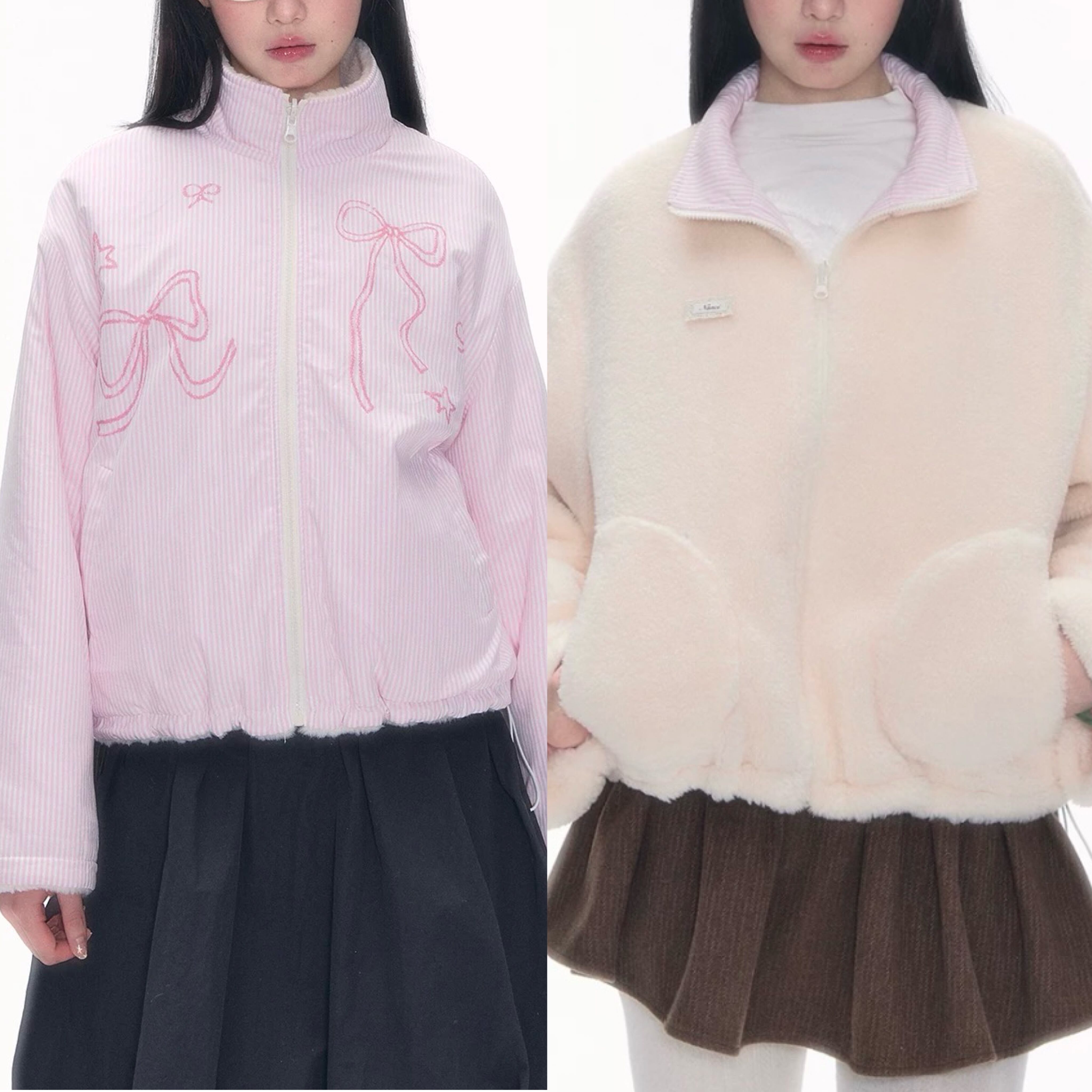 【リバーシブル】ベージュ ピンク ボーダー ストライプ ガーリー ジャンパー アウター