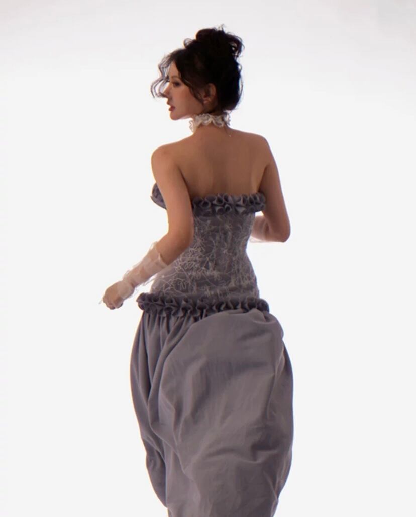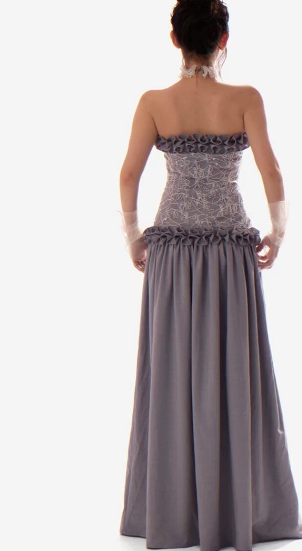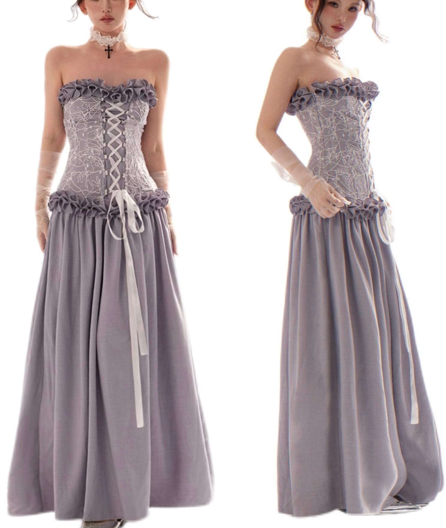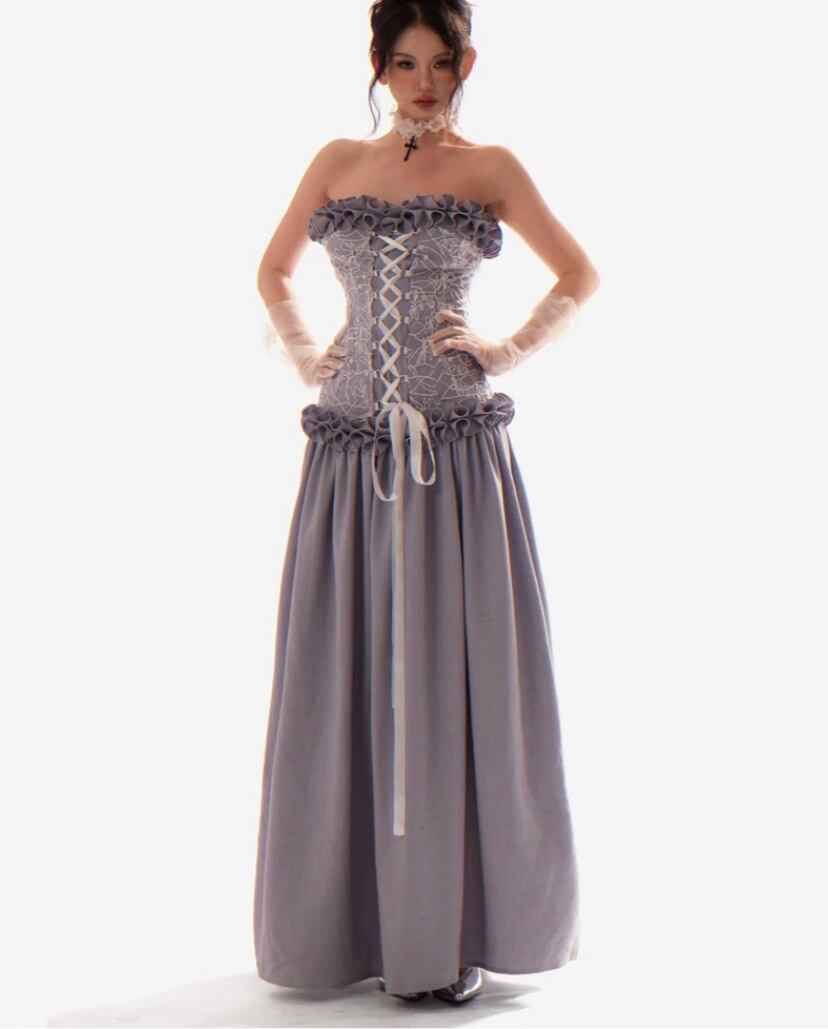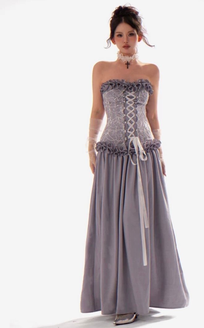 グレー マキシ パーティー ドレス 衣装 編み上げ リボン スカート ベアトップ
