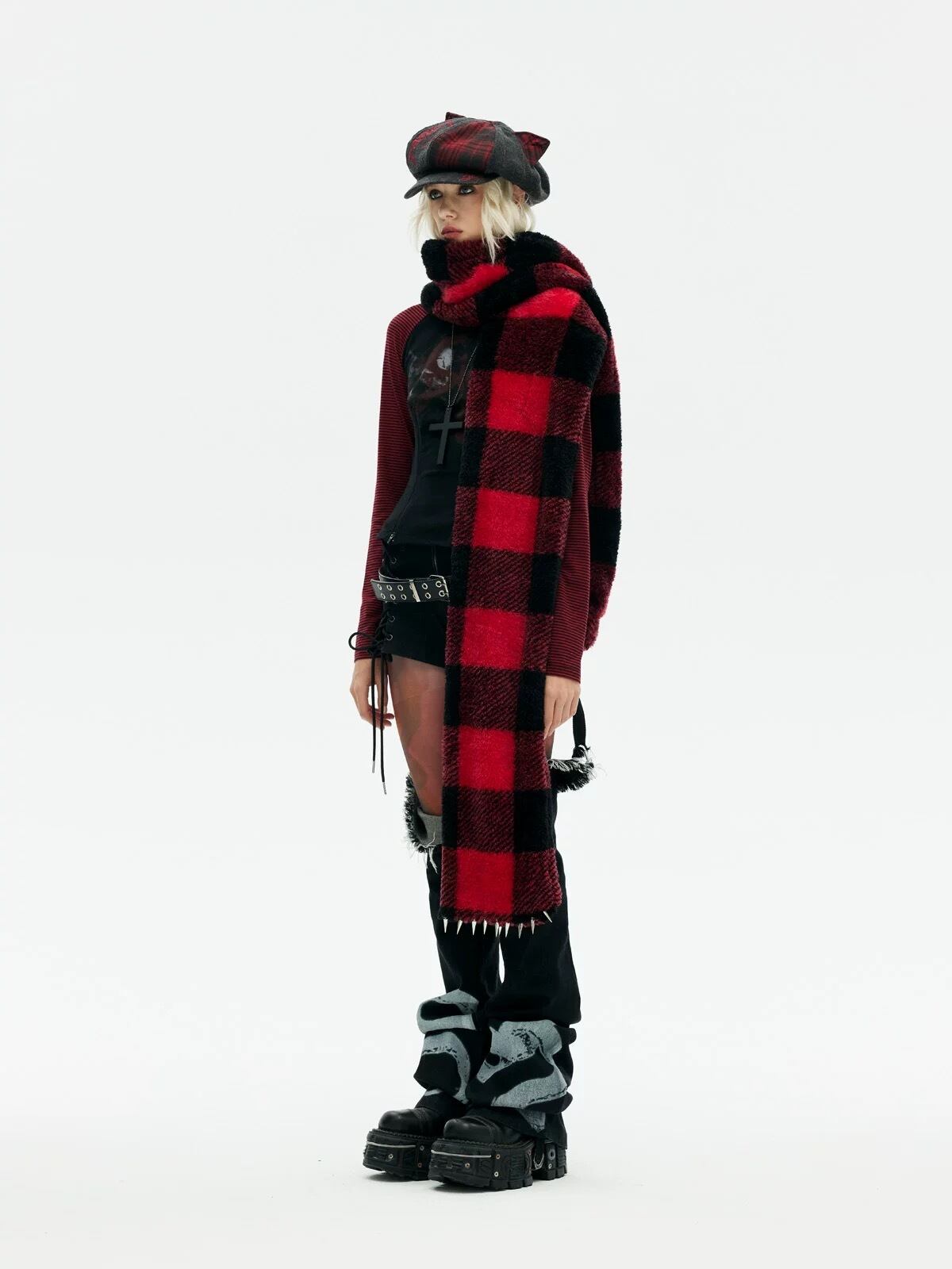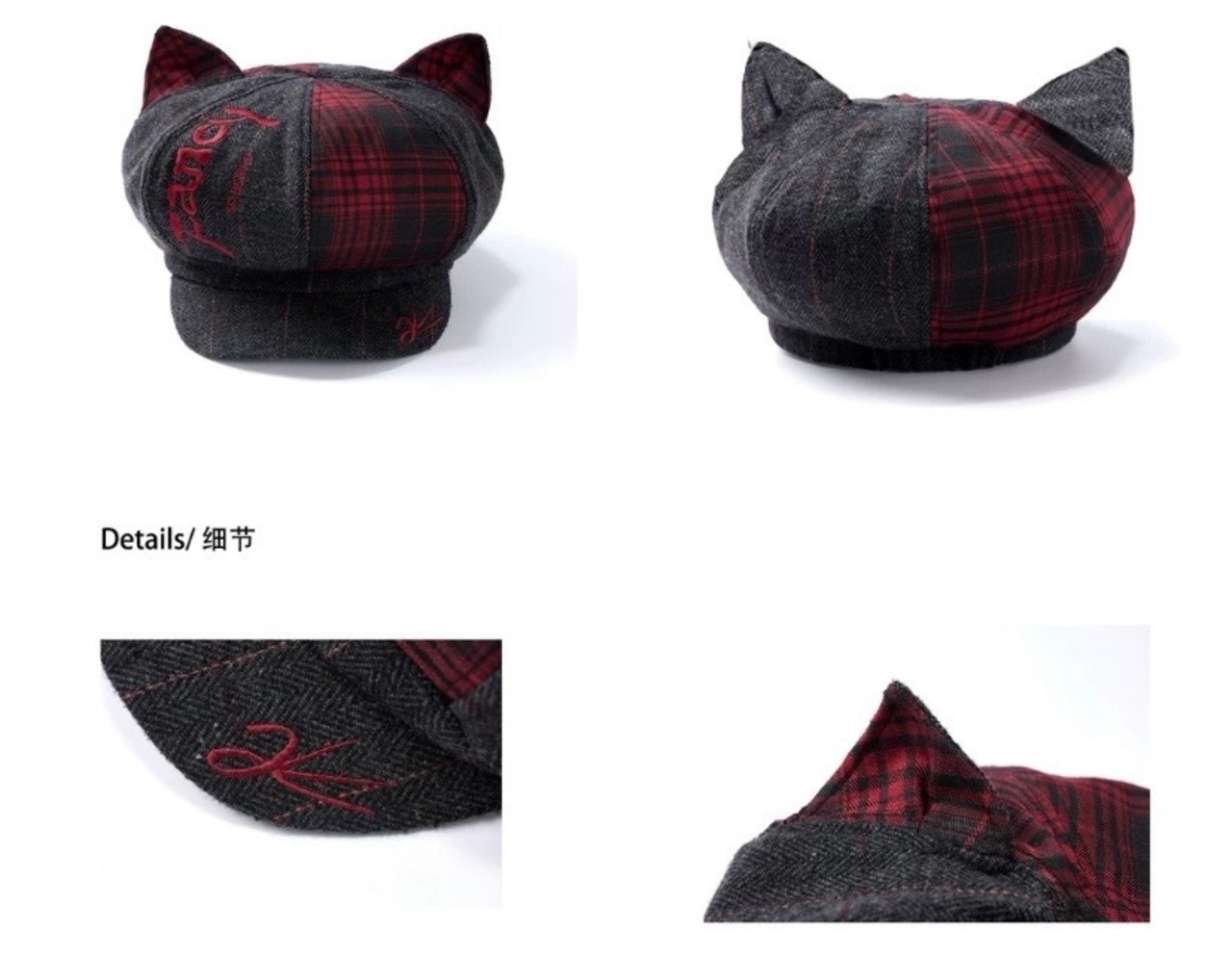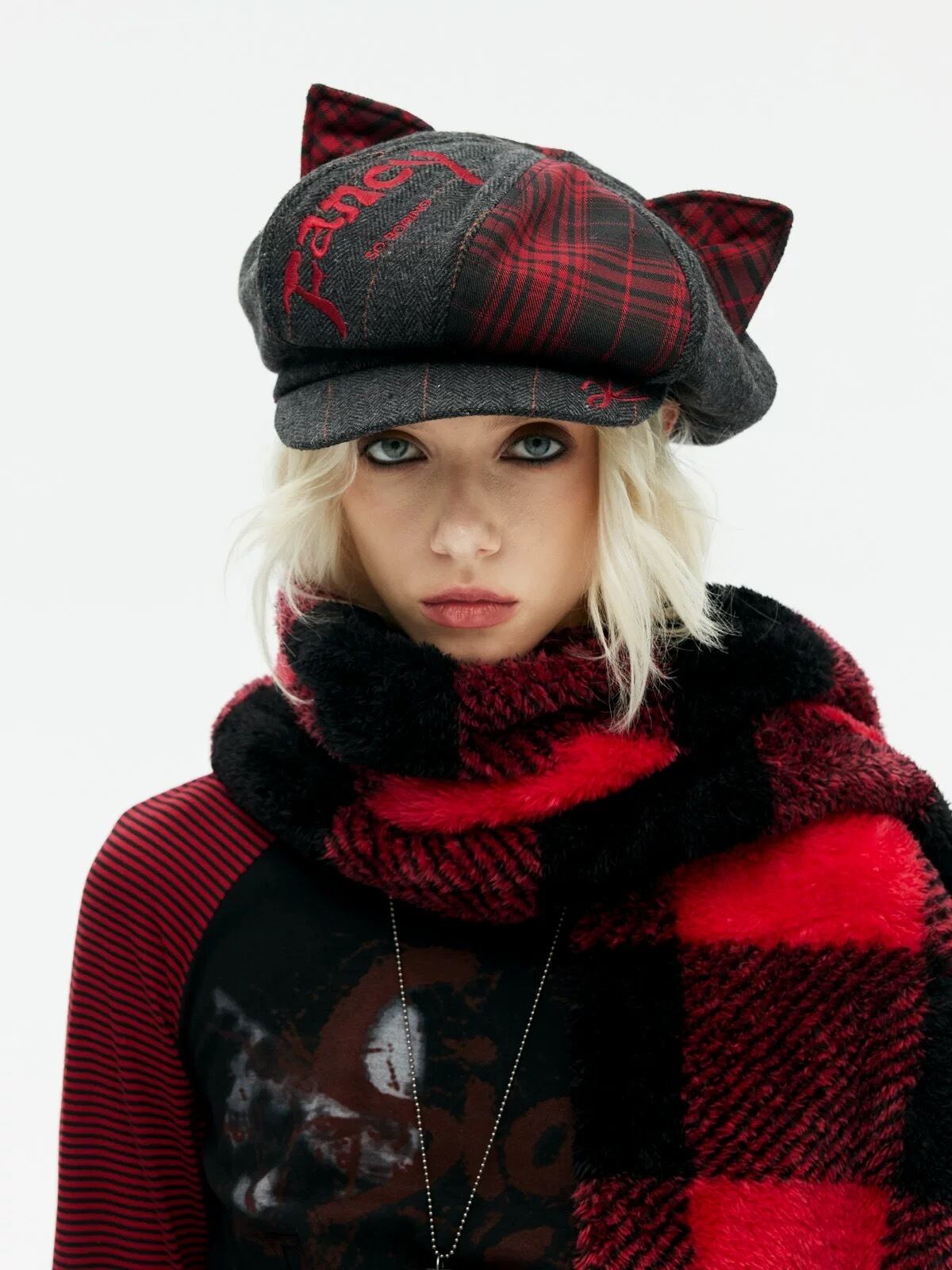 赤 黒 チェック ベレー帽子 ねこ みみ 帽子 ヘアアクセ