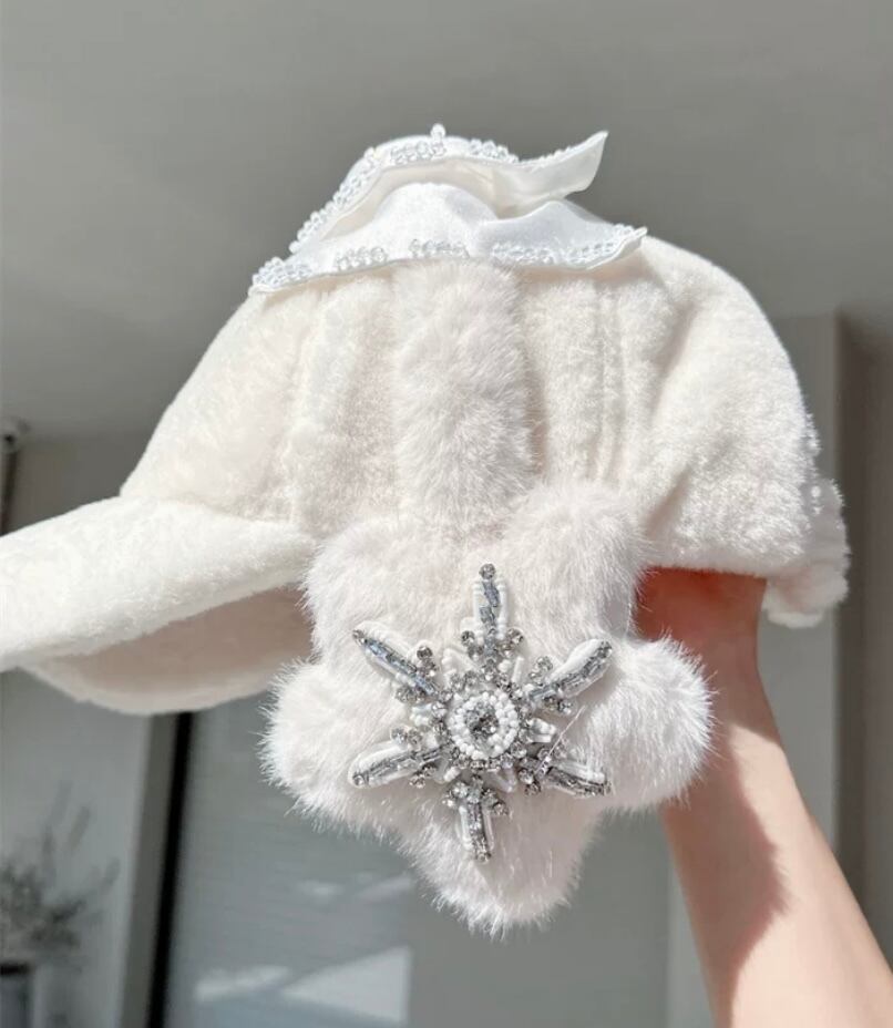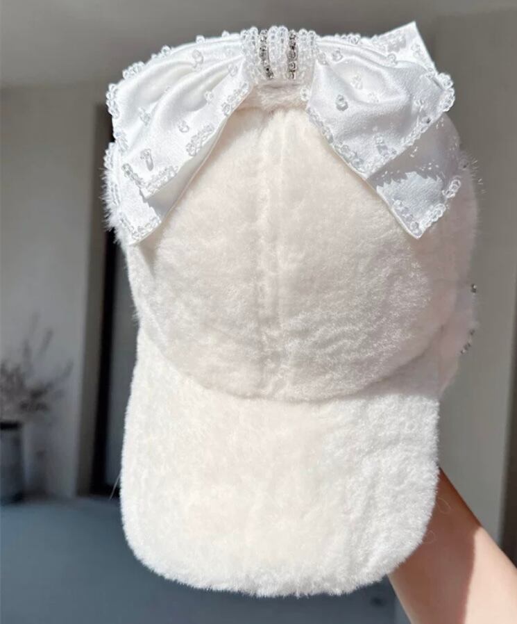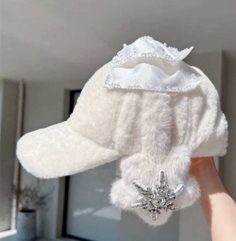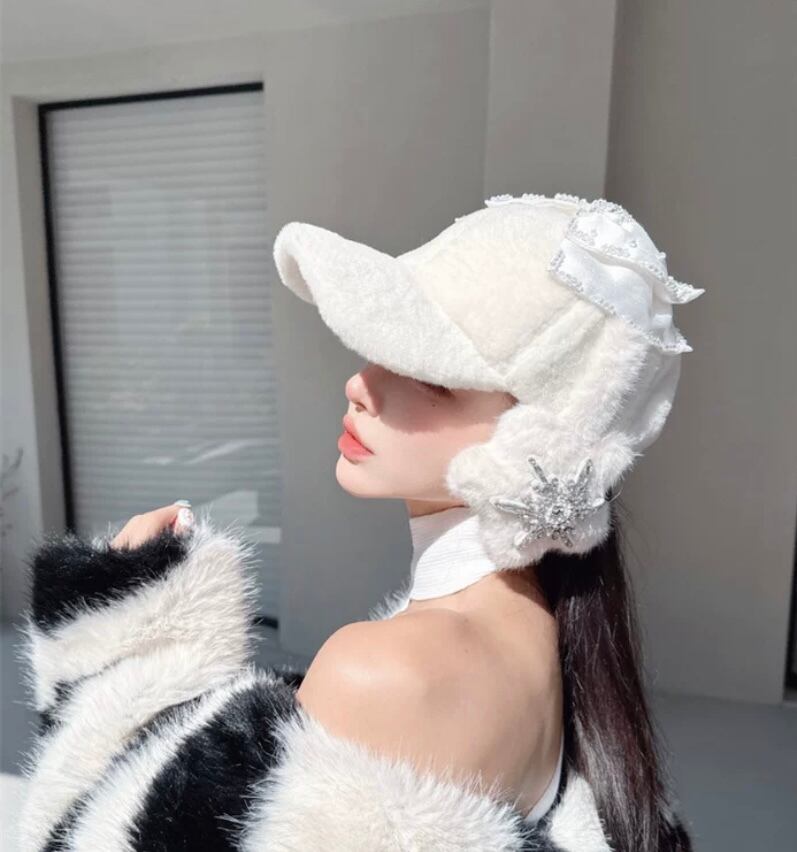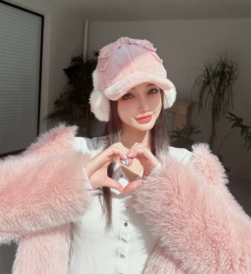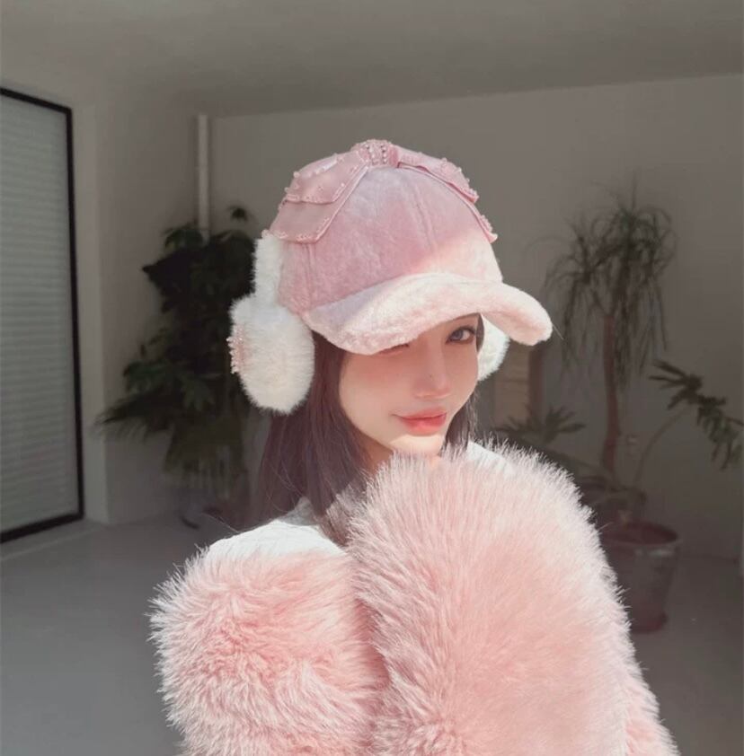 キャップ 帽子 ピンク 白 カメリア 花柄 耳当て リボン 可愛い ガーリー