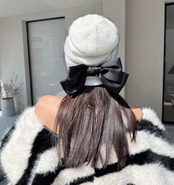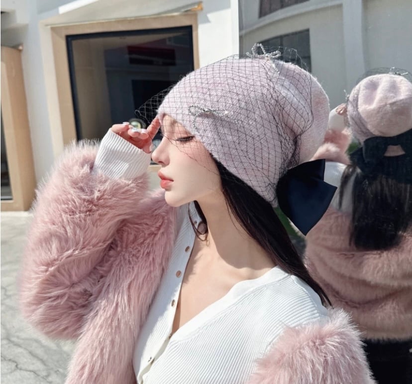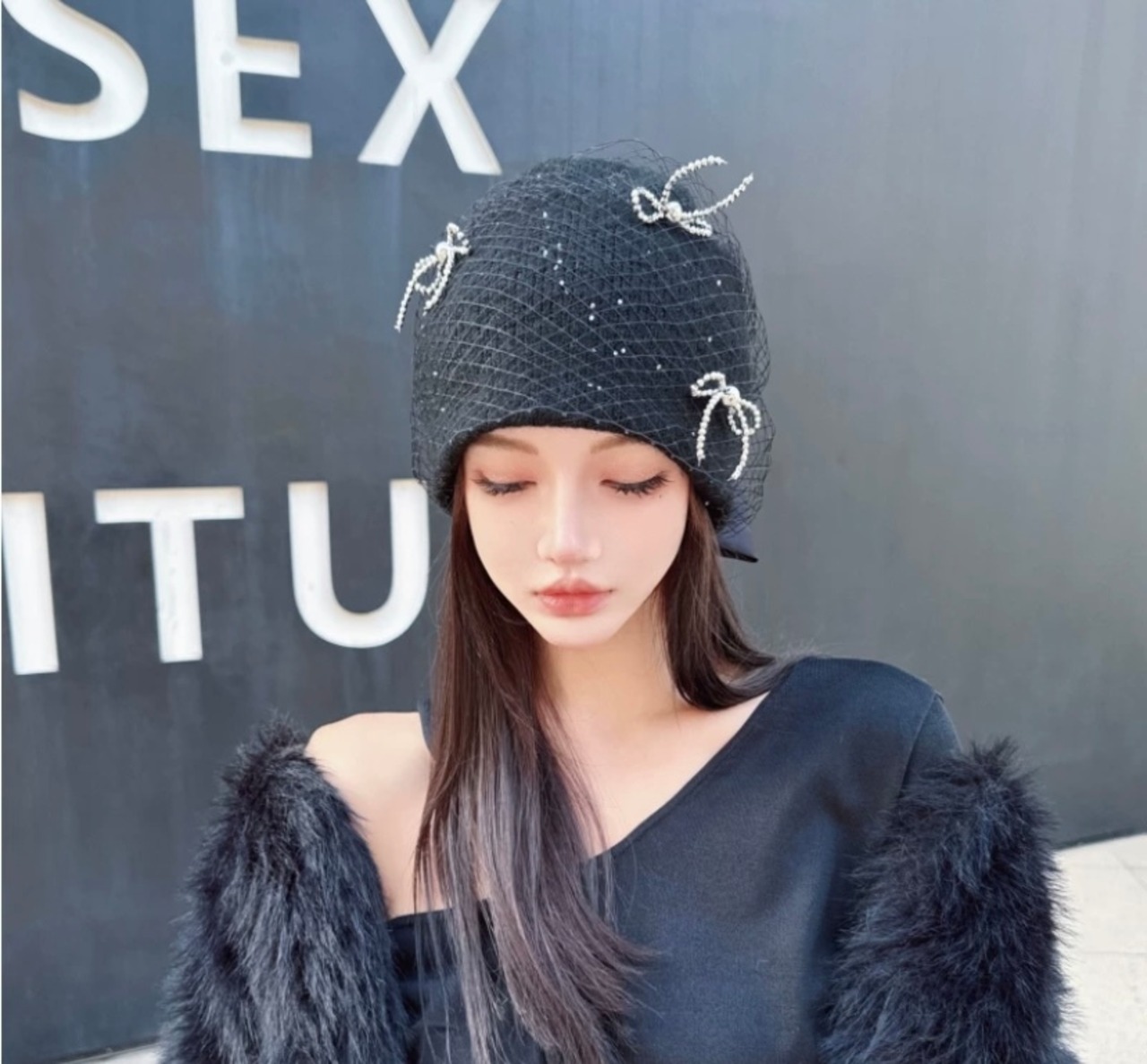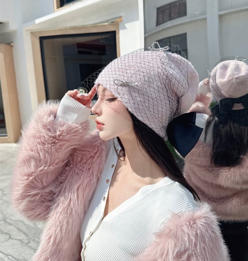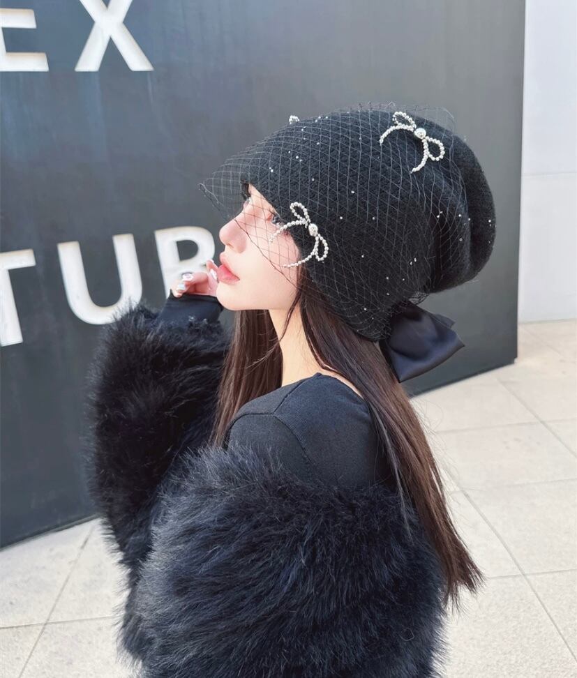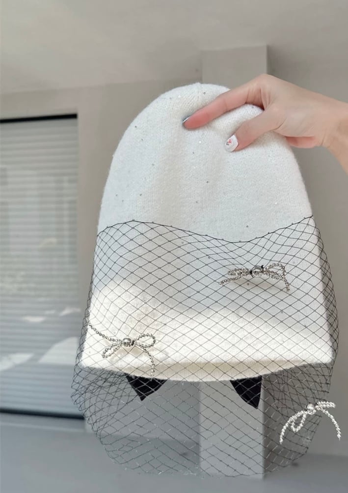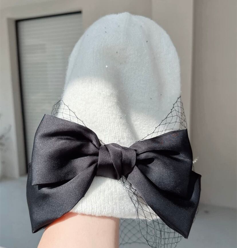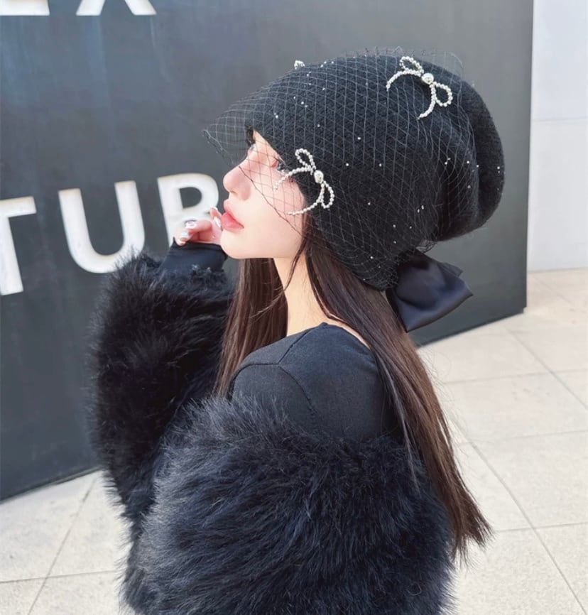 ニット帽 ガーリー 黒 あみあみ 帽子 デコレーション 白 キラキラ リボン ピンク シンプル