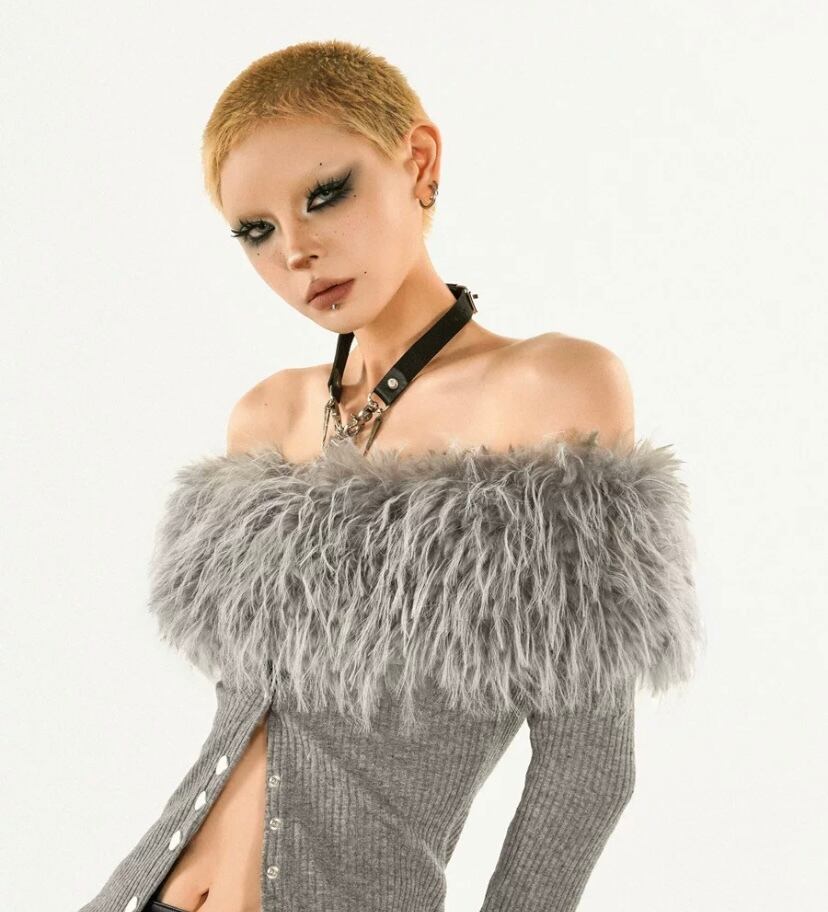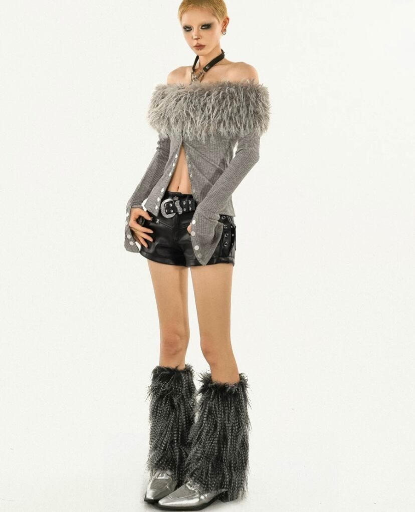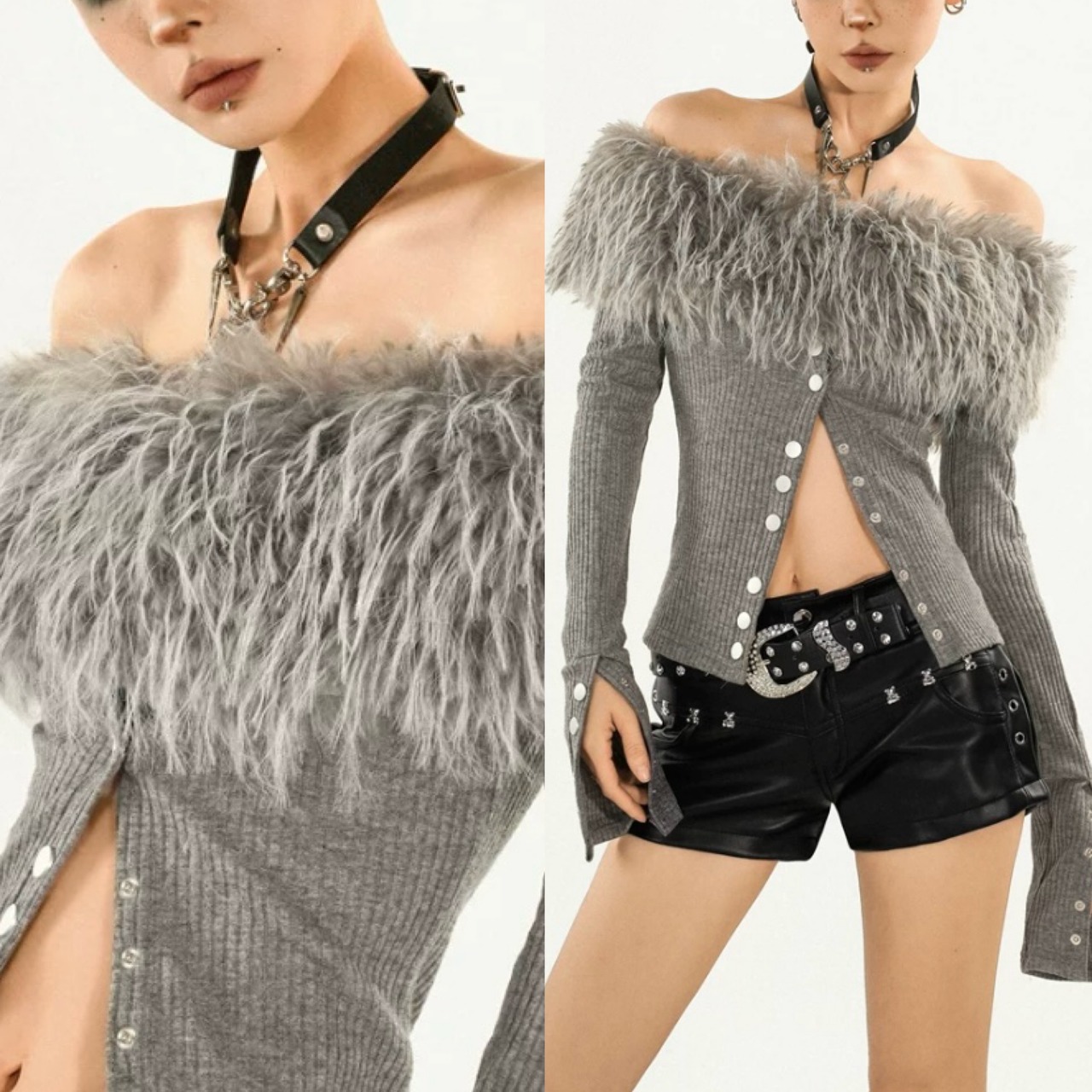 グレー オフショルダー ファー セーター カーディガン ブラウス かっこいい