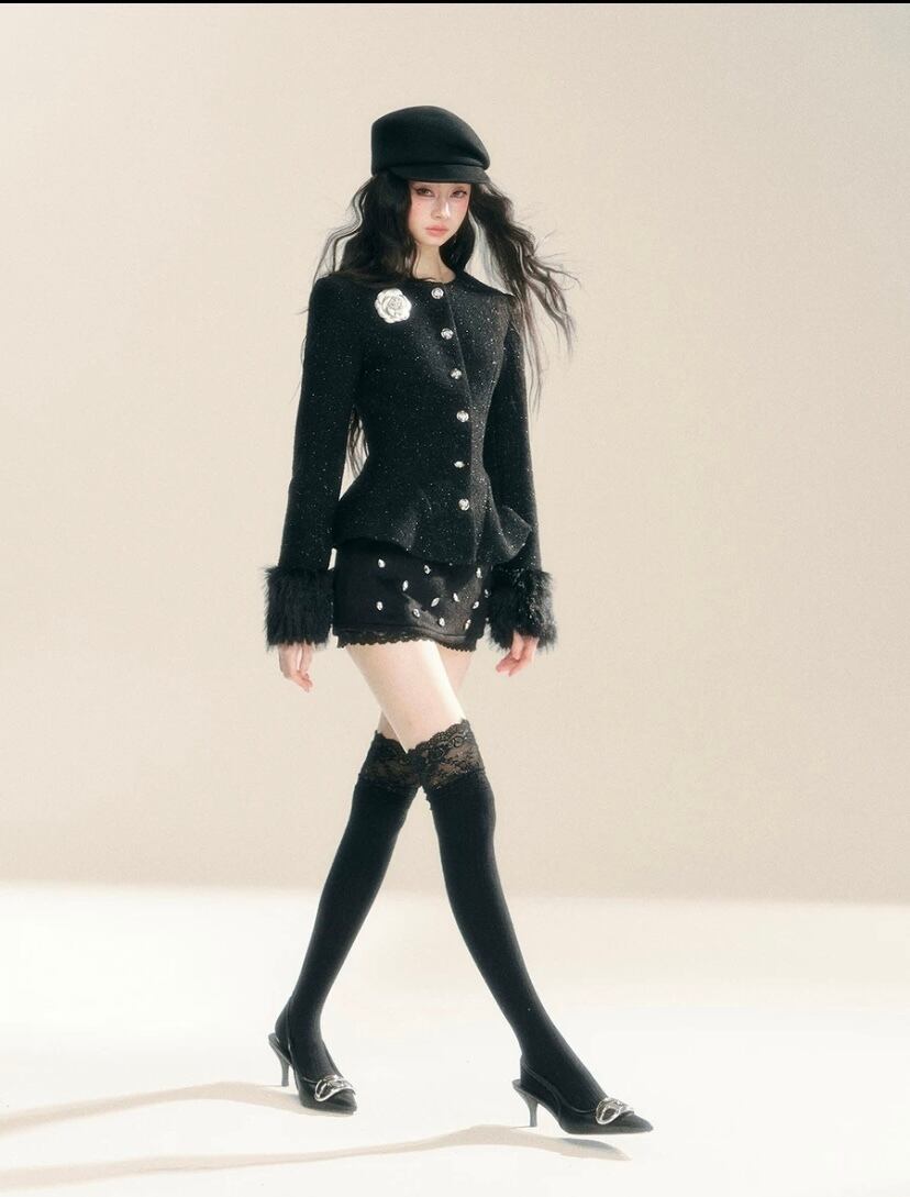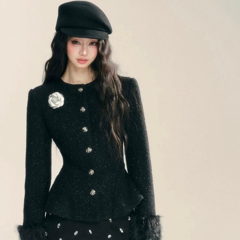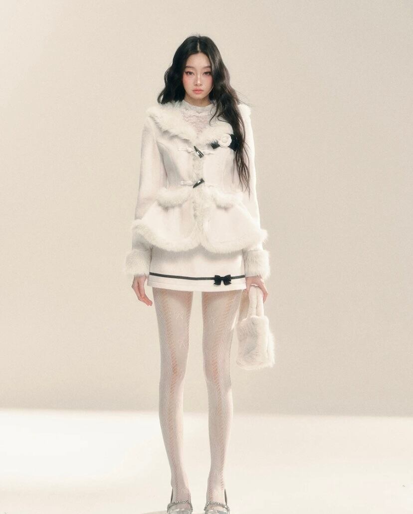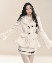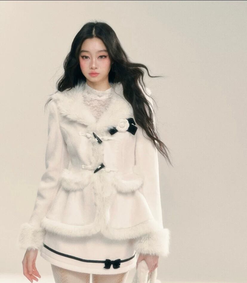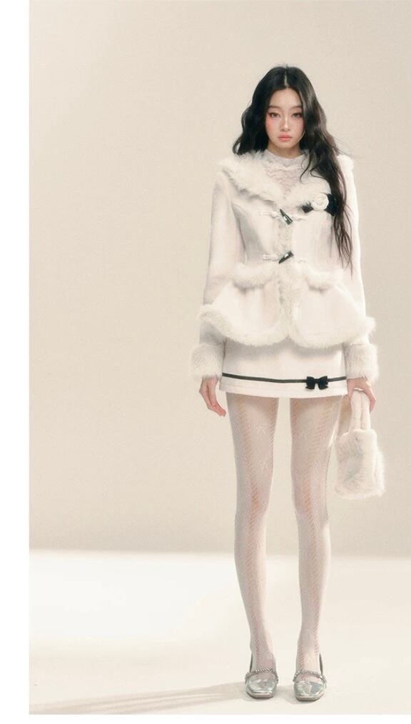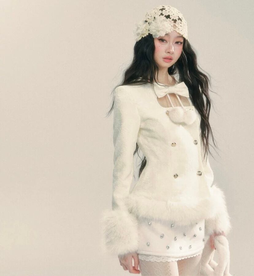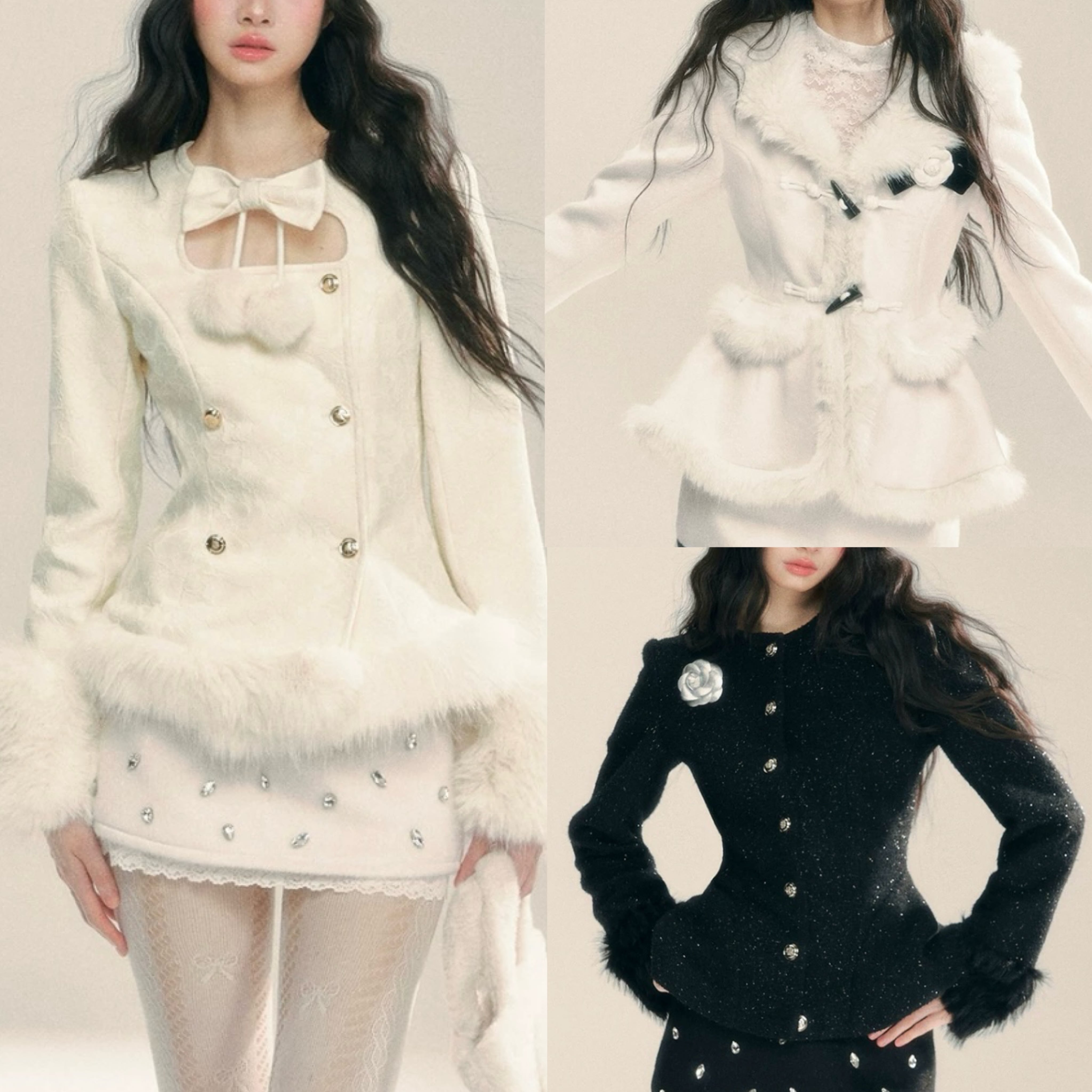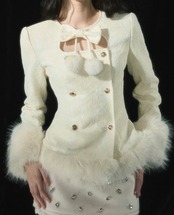 【ジャケット】白 黒 ホワイト ガーリー 可愛い ファー カメリア リボン キラキラ ポンポン カーディガン アウター