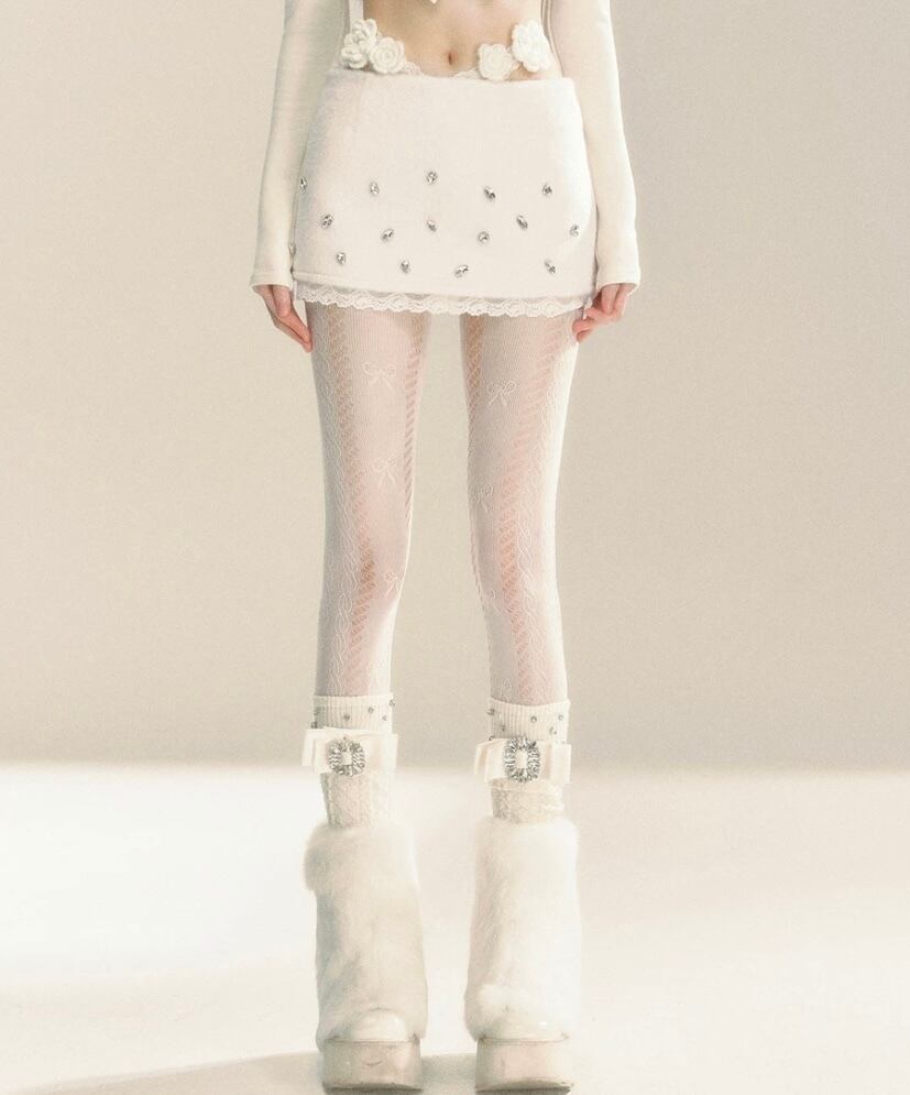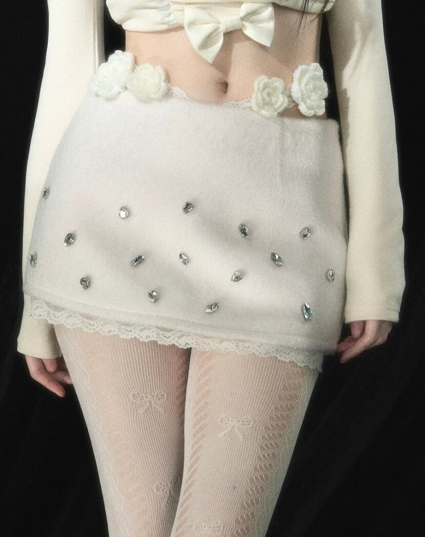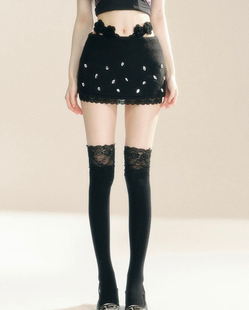 ミニスカート ラインストーン キラキラ カメリア 花柄 フラワー 黒 白 ホワイトデー ガーリー リボン 可愛い