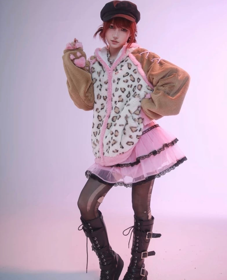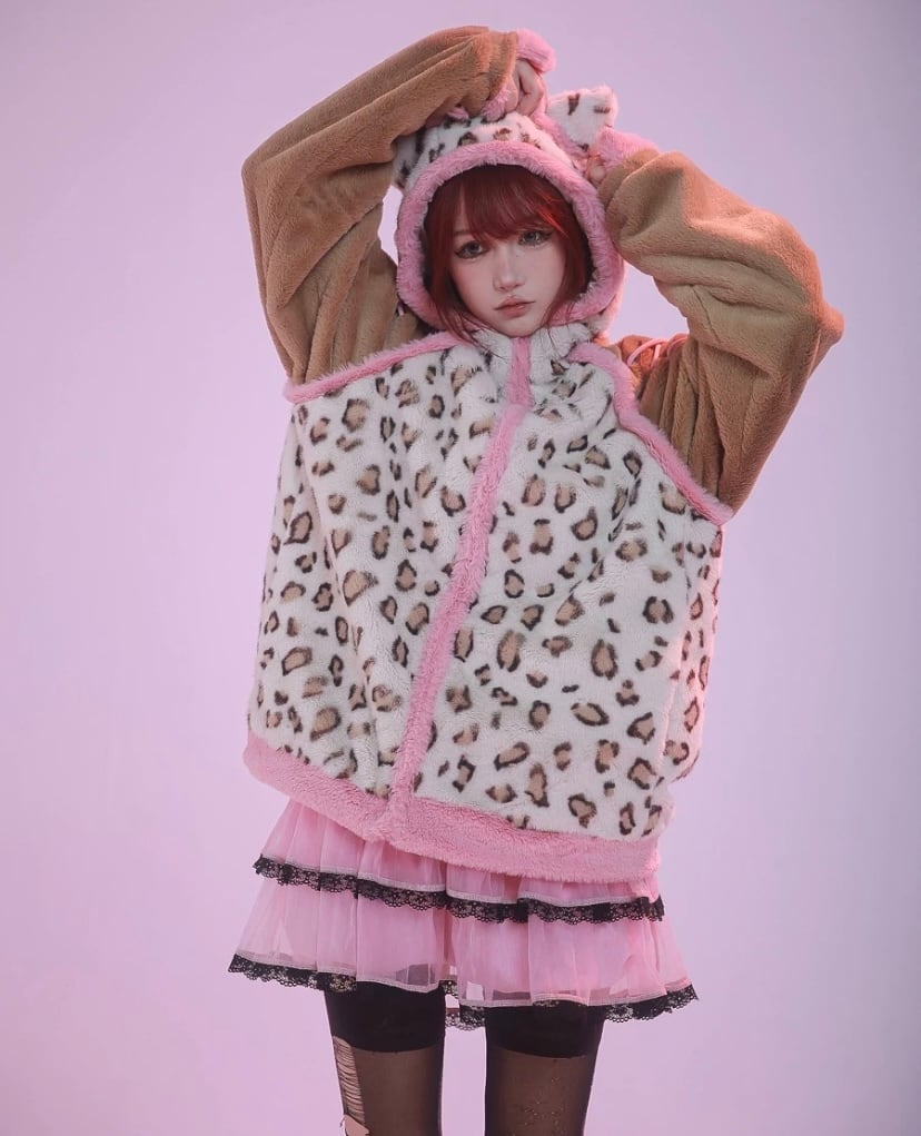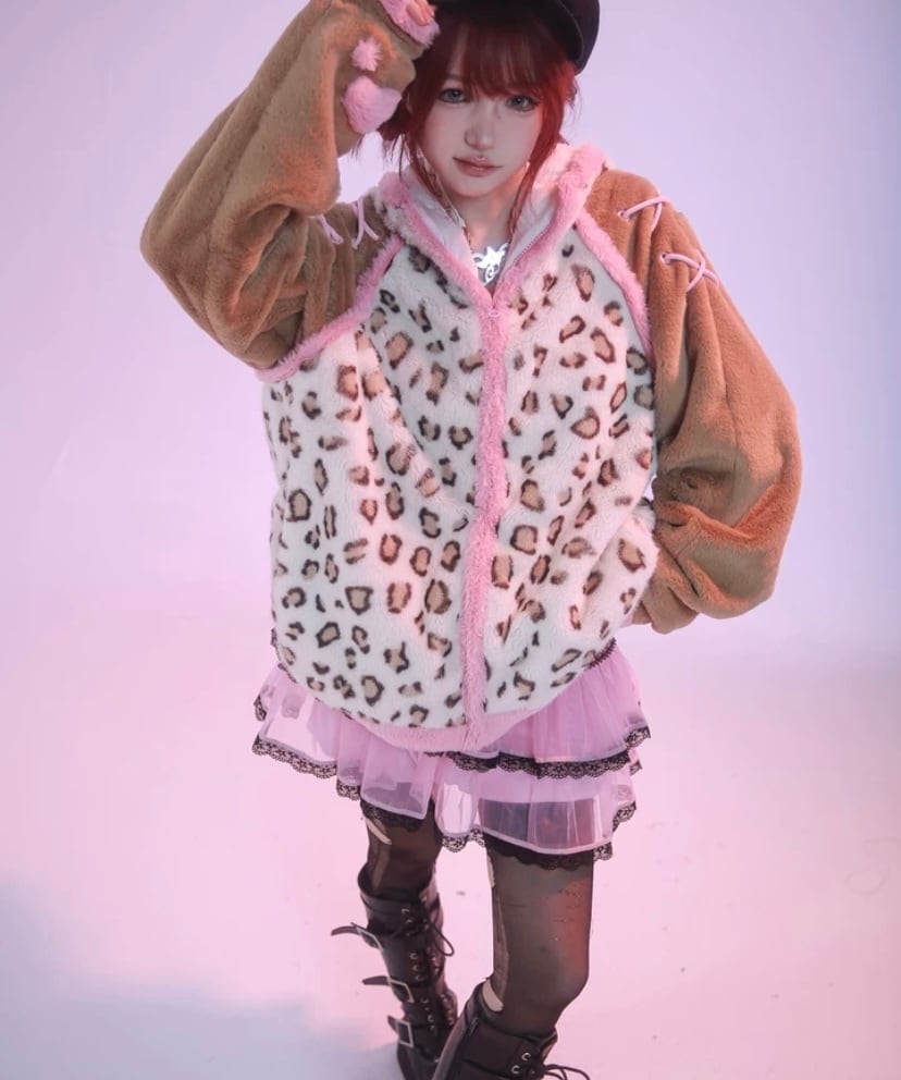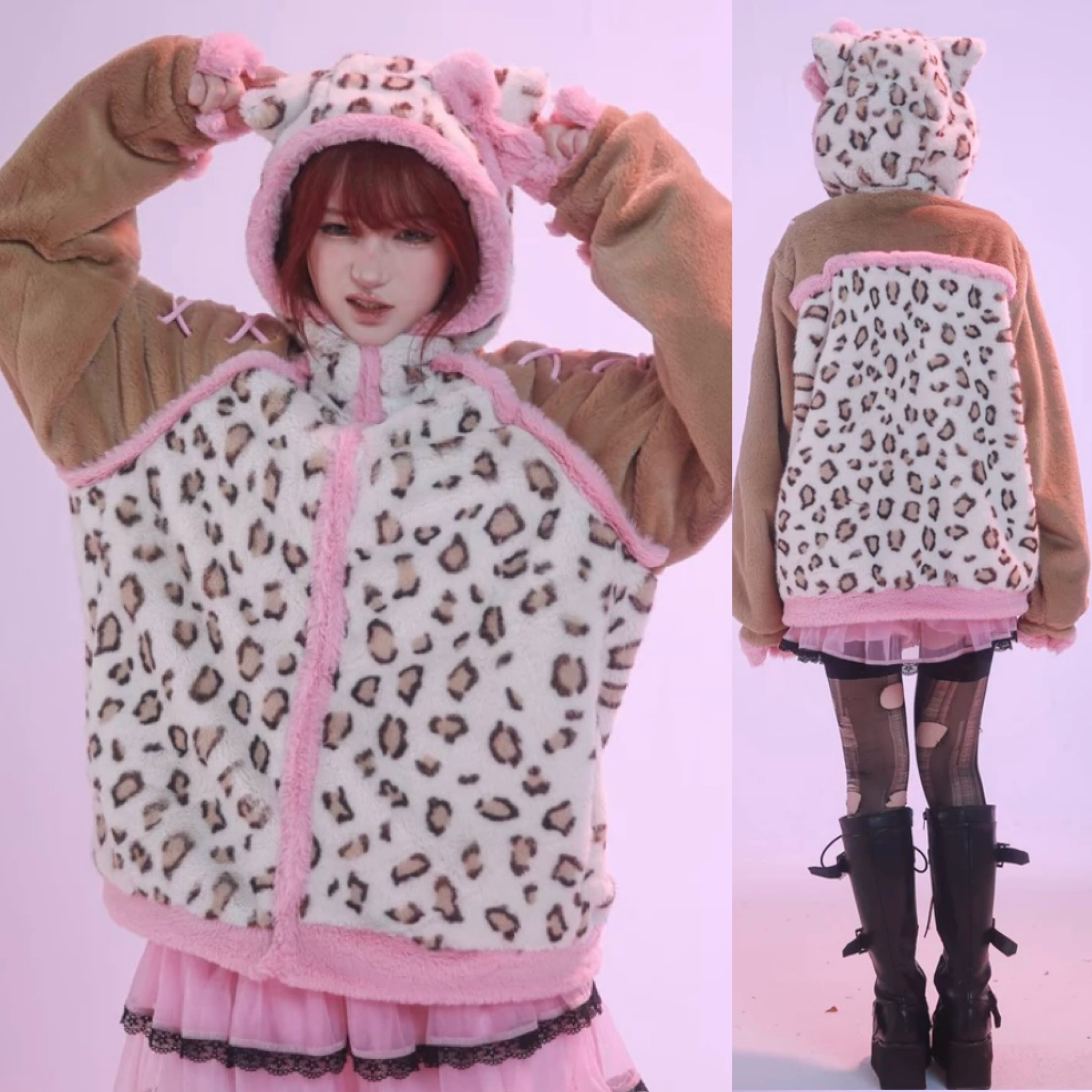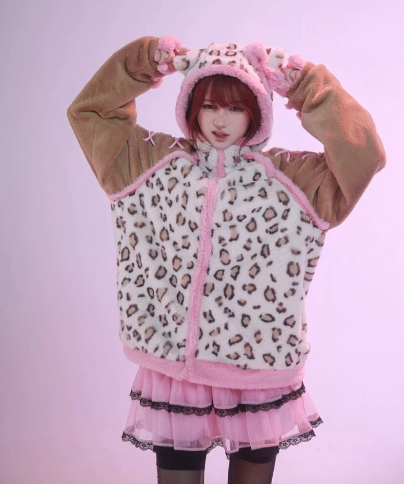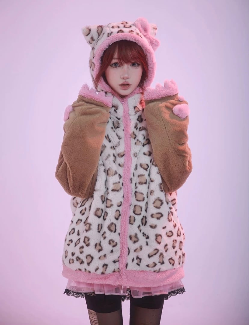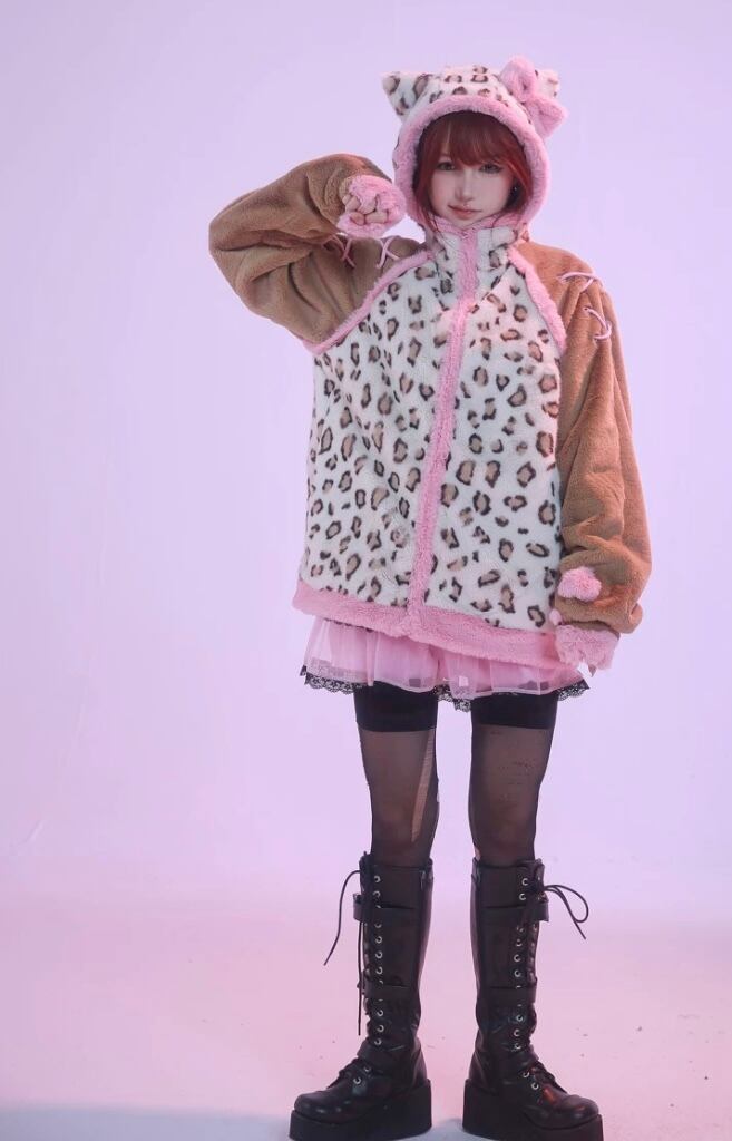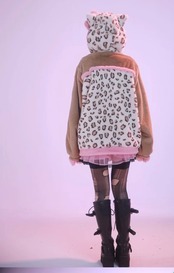 ピンク 茶色 レオパード ヒョウ柄 パーカー フリース アウター ジャケット カーディガン コート カーディガン 可愛い 茶色 ねこ