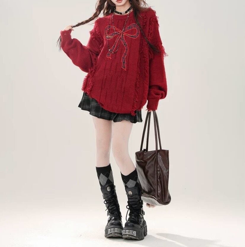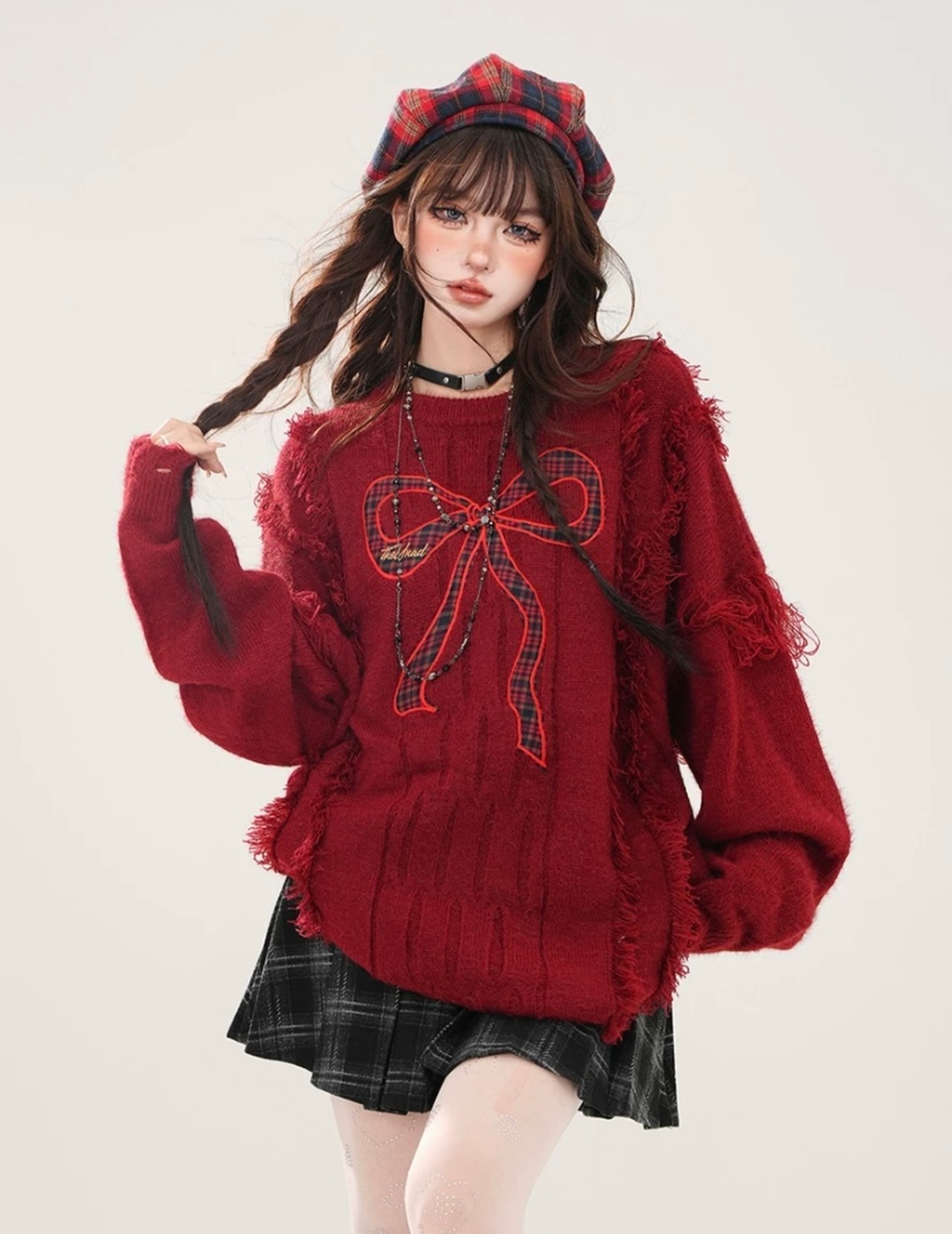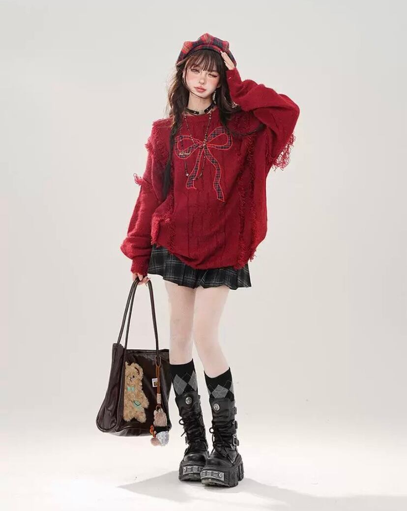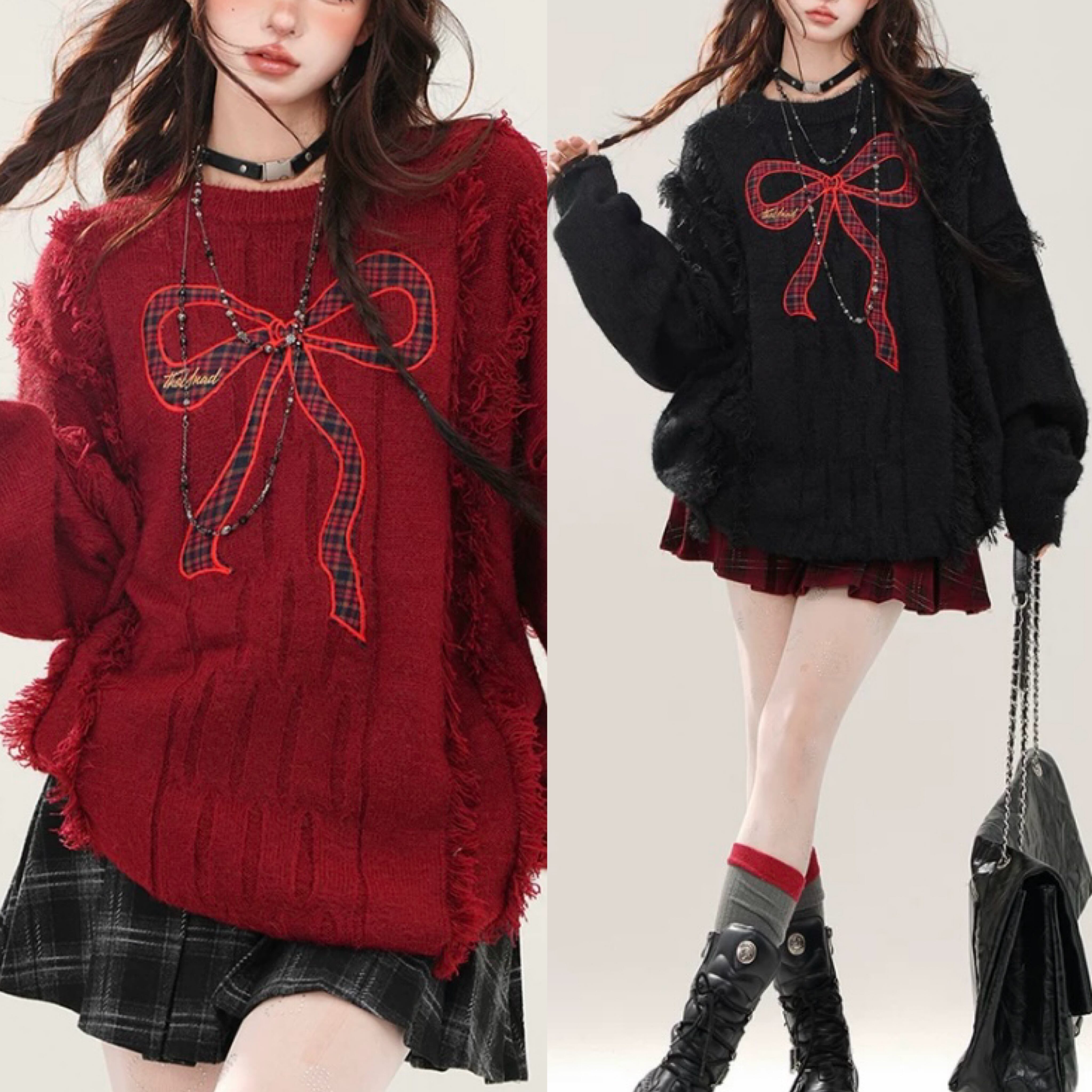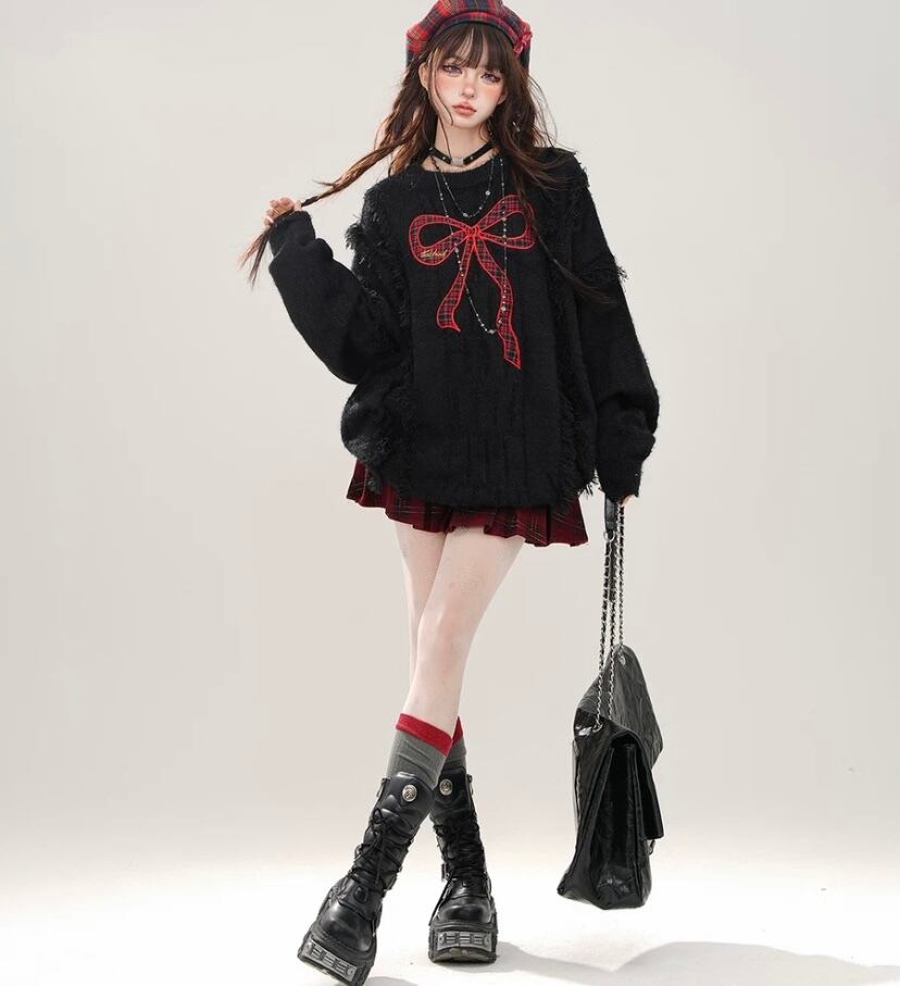 【XLまで❣️】シンプル ガーリー カーディガン セーター トップス 原宿 黒 赤 リボン