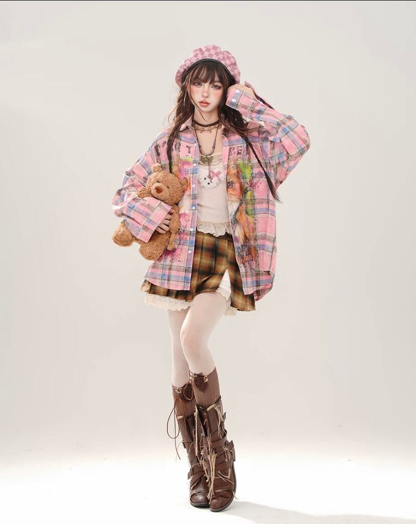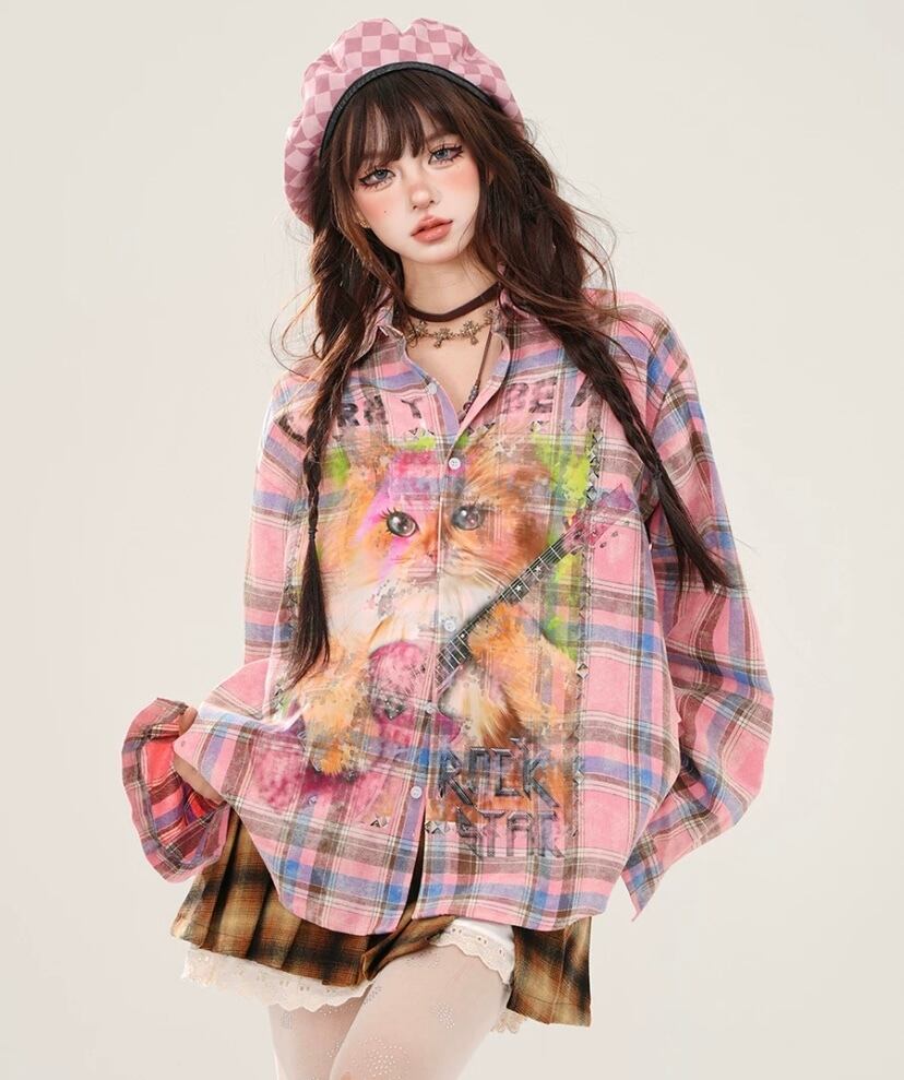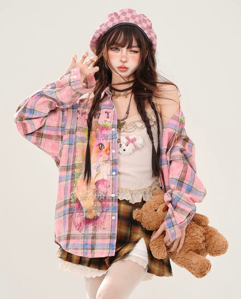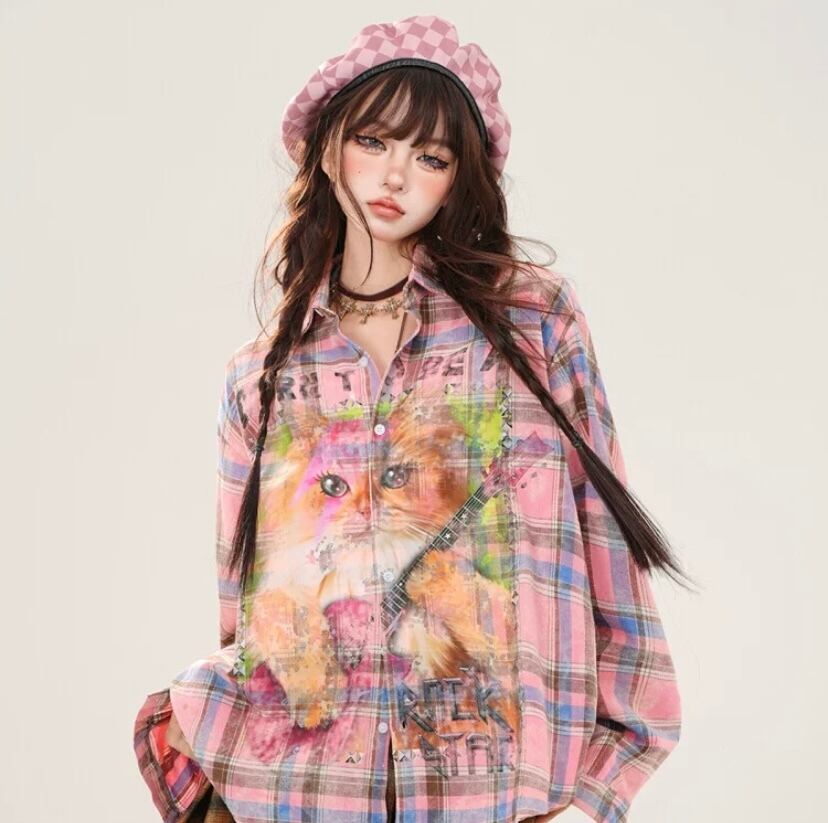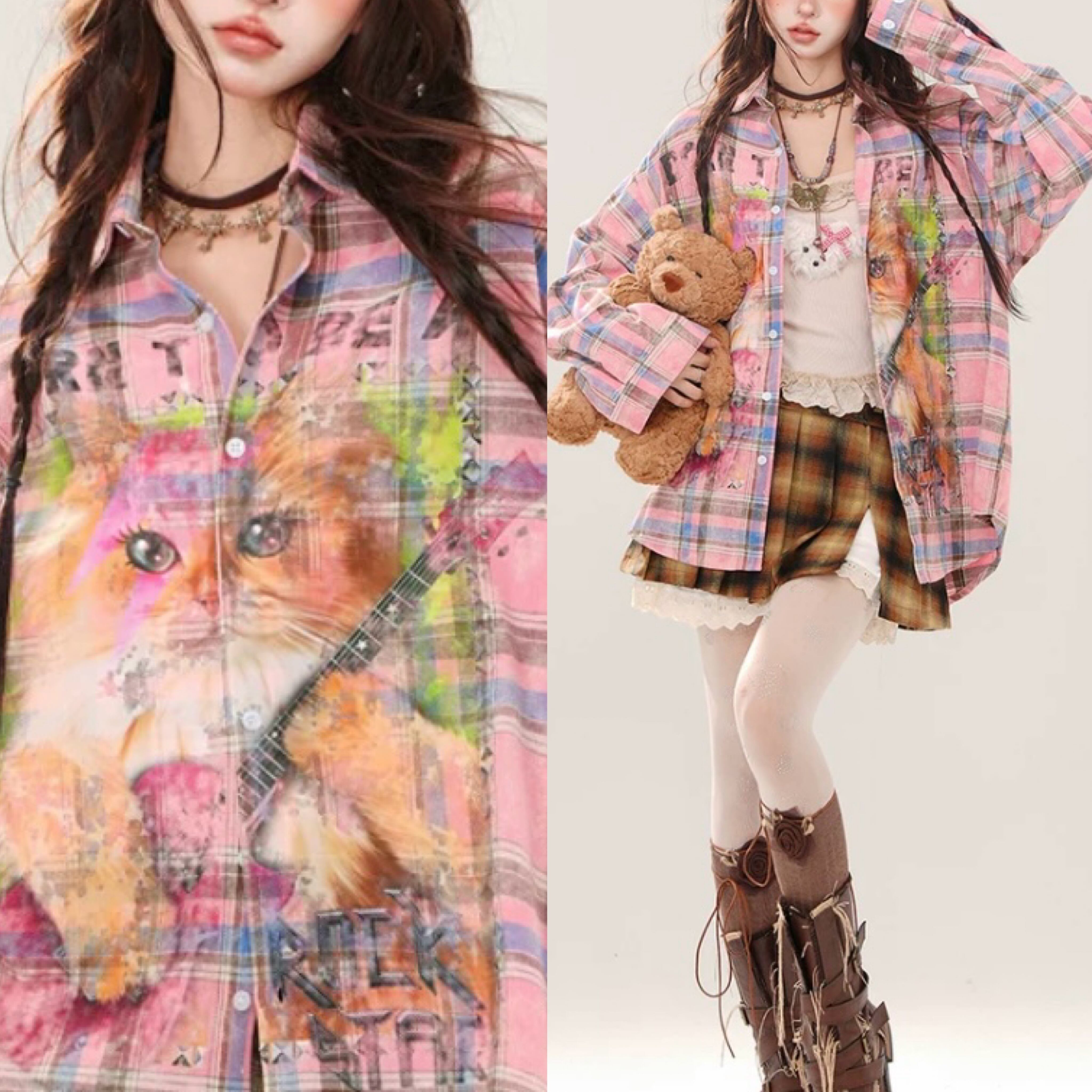 ピンク ねこ ガーリー シャツ ブラウス チェック 可愛い