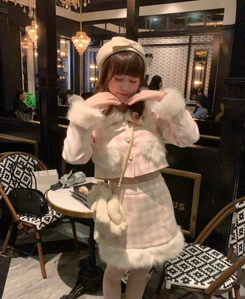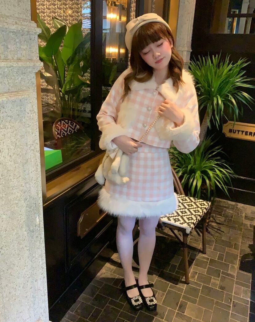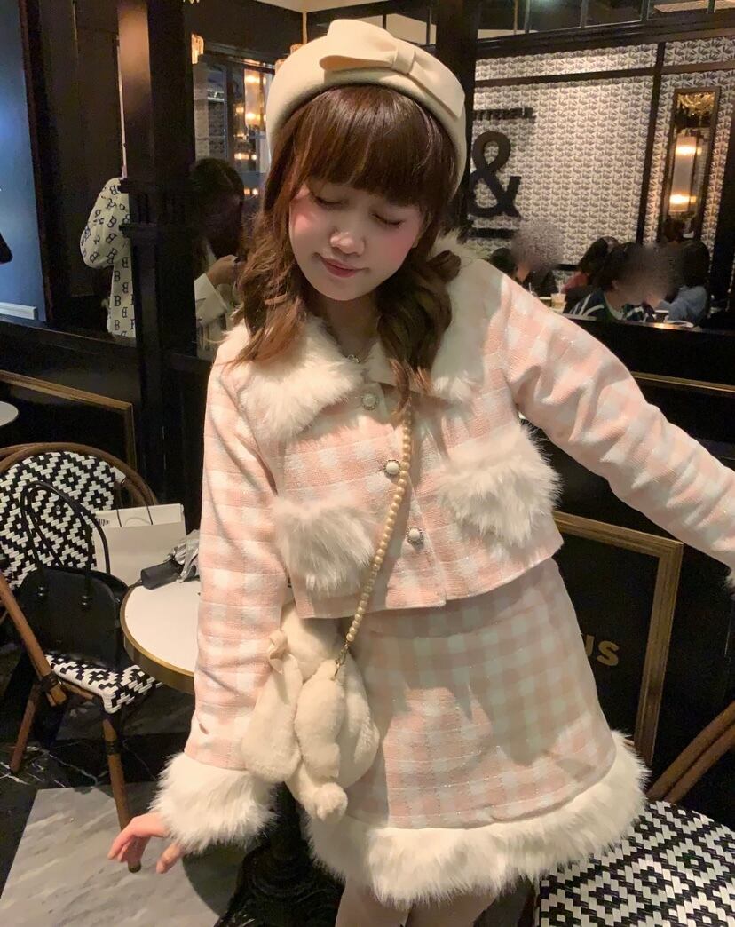 【セットアップ】ファー ジャケット ガーリー 可愛い ピンク チェック スカート スーツ リボン ファー