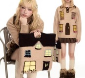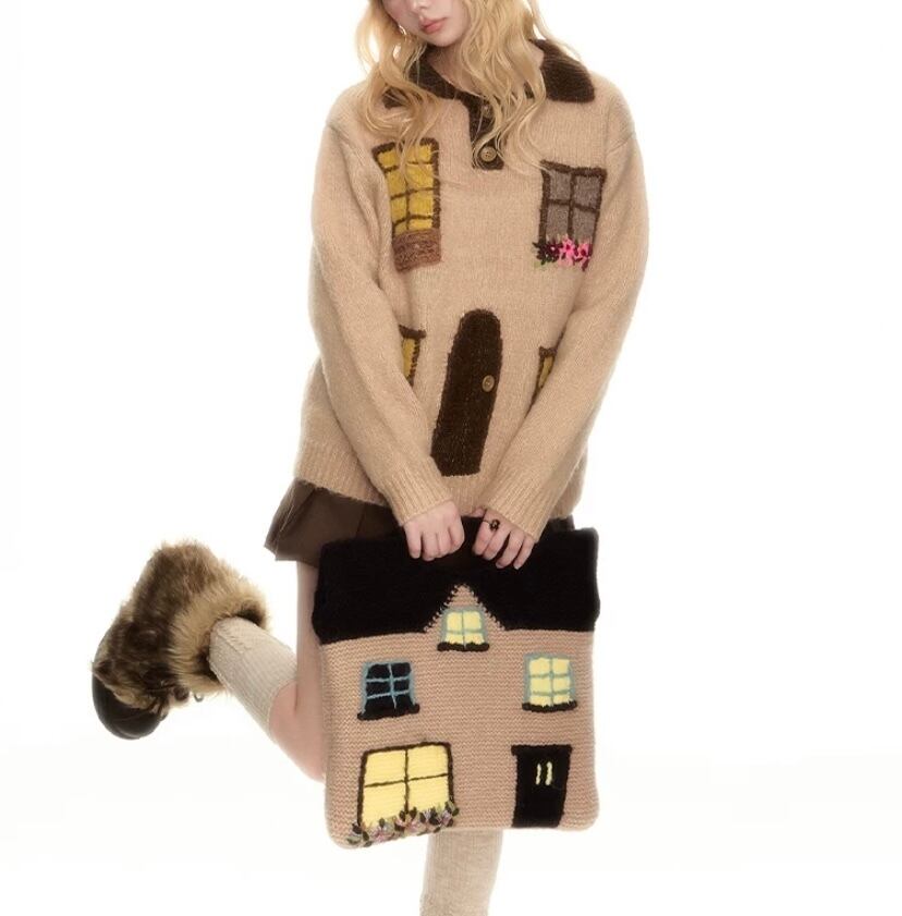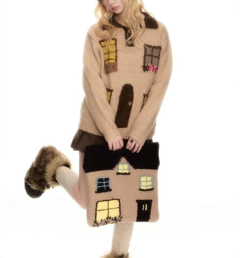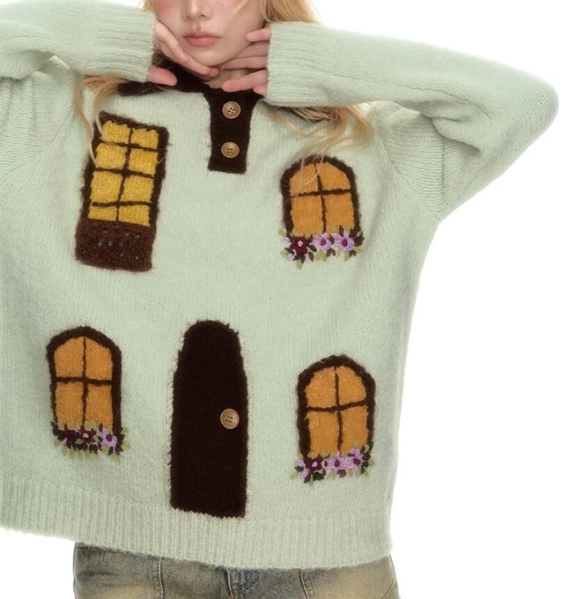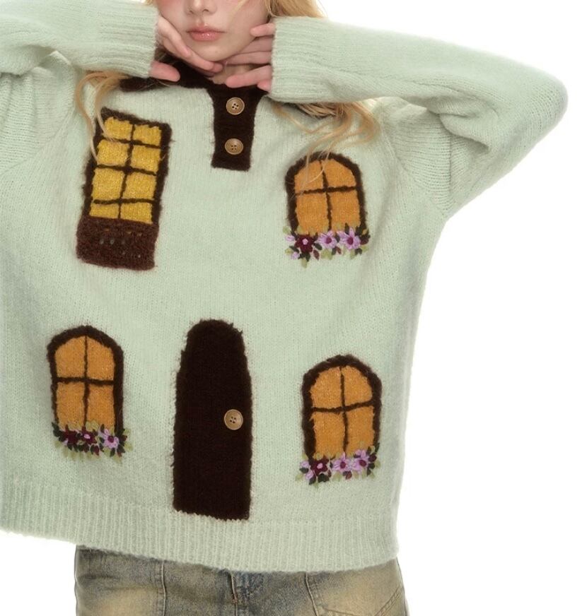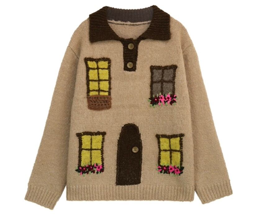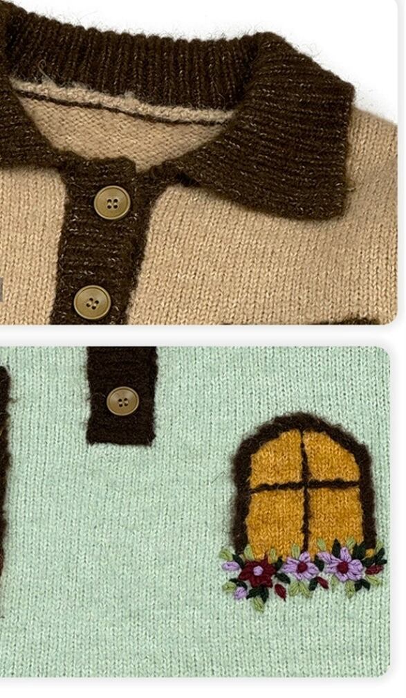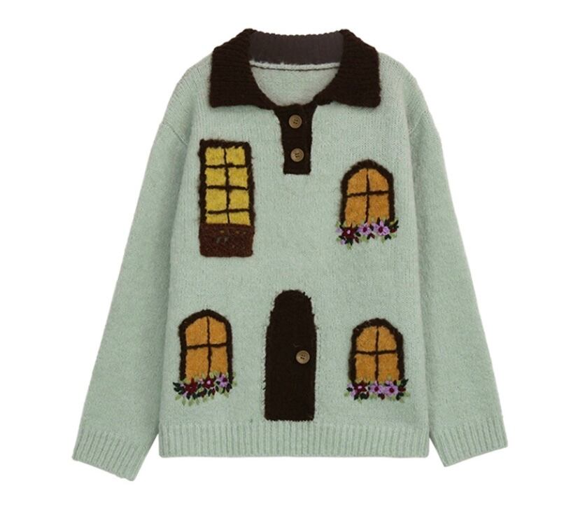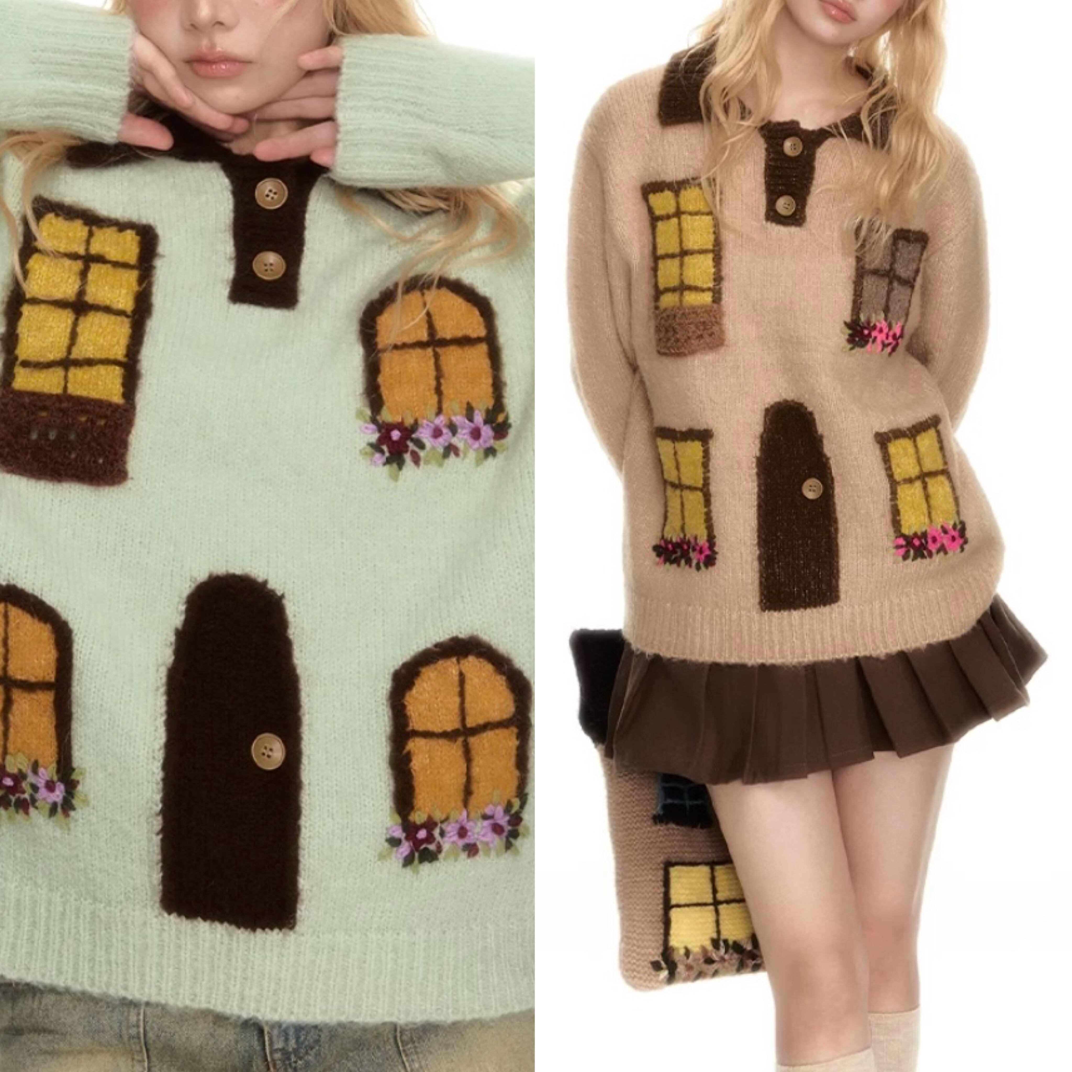 茶色 緑 ページ 家 窓 デザイン セーター カーディガン トップス