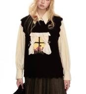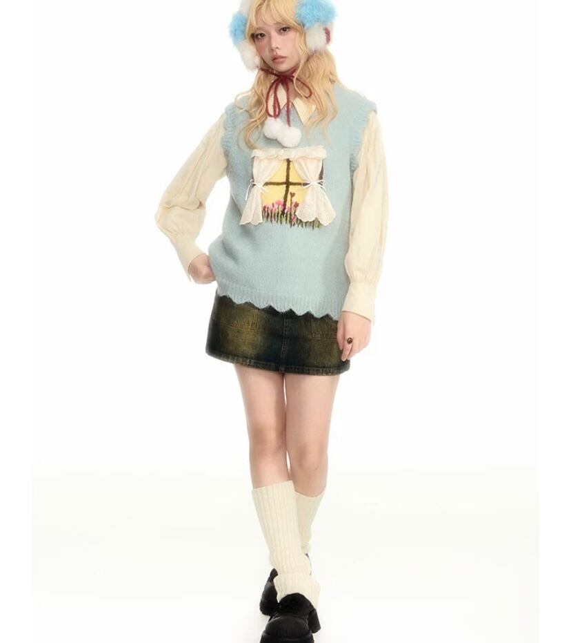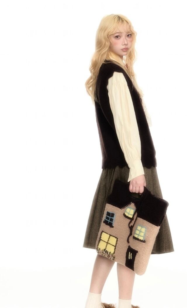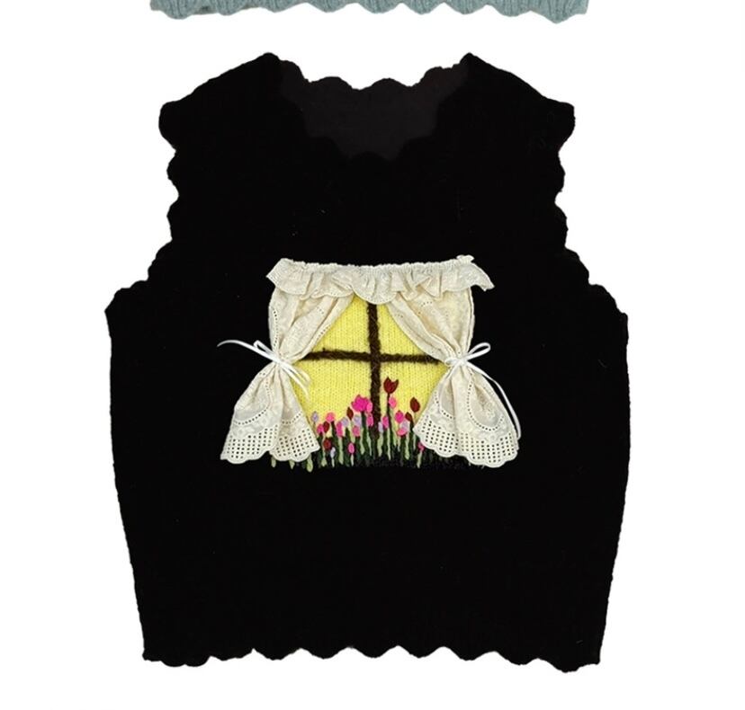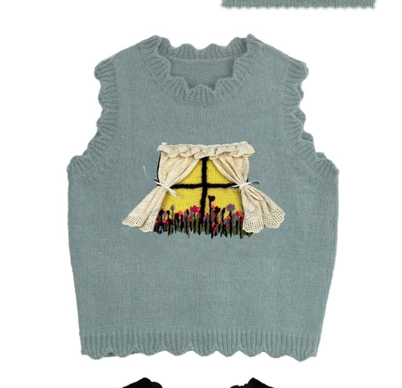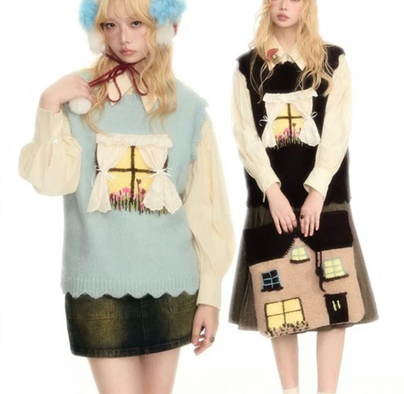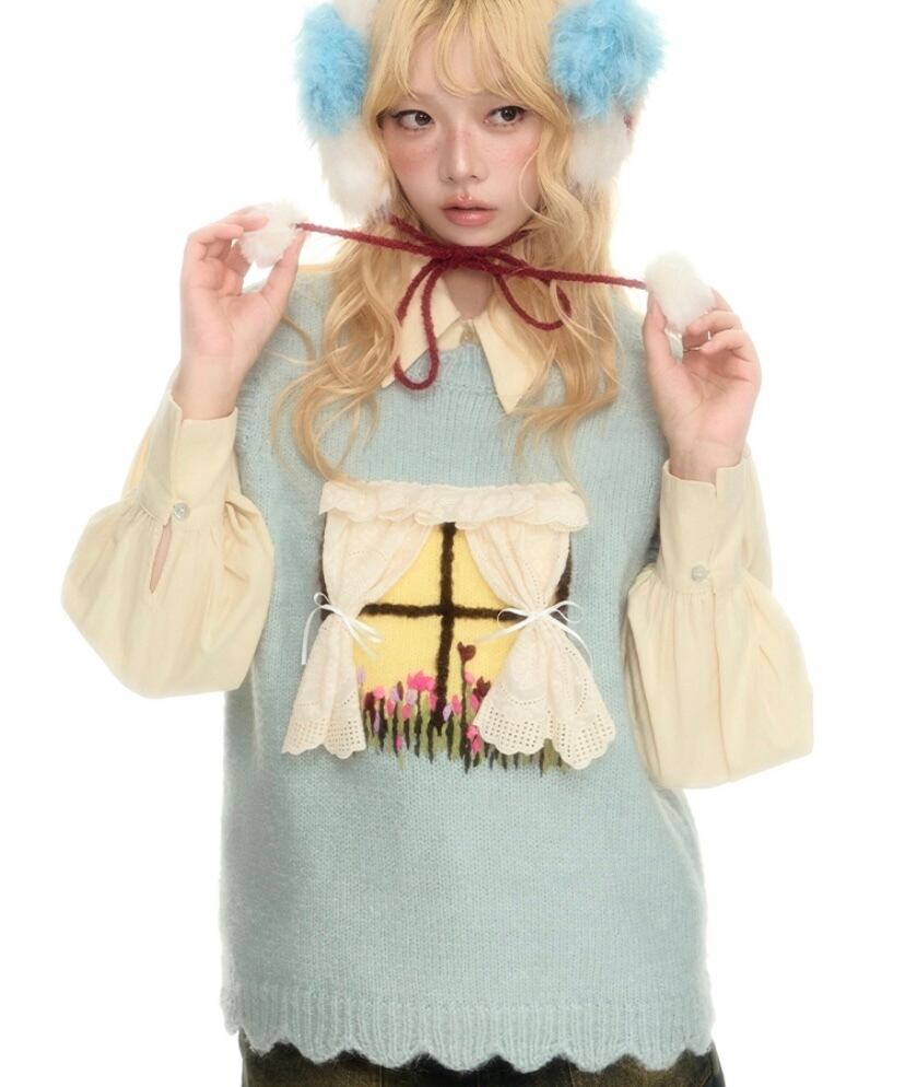 ガーリー 茶色 家 窓 セーター カーディガン 水色 茶色 黒 花柄