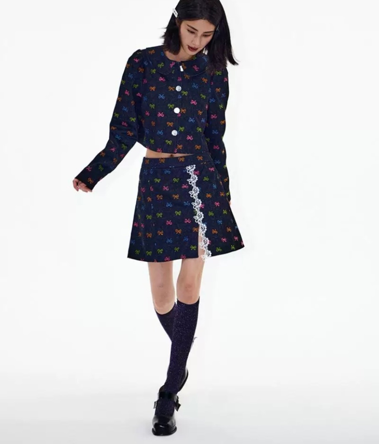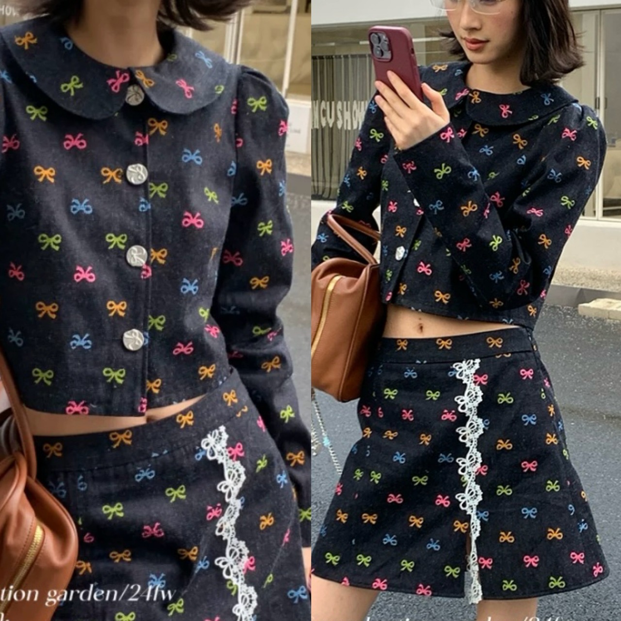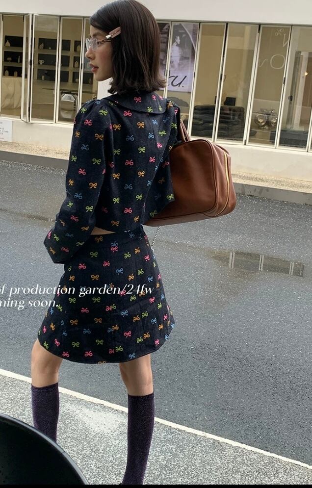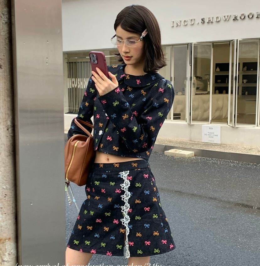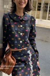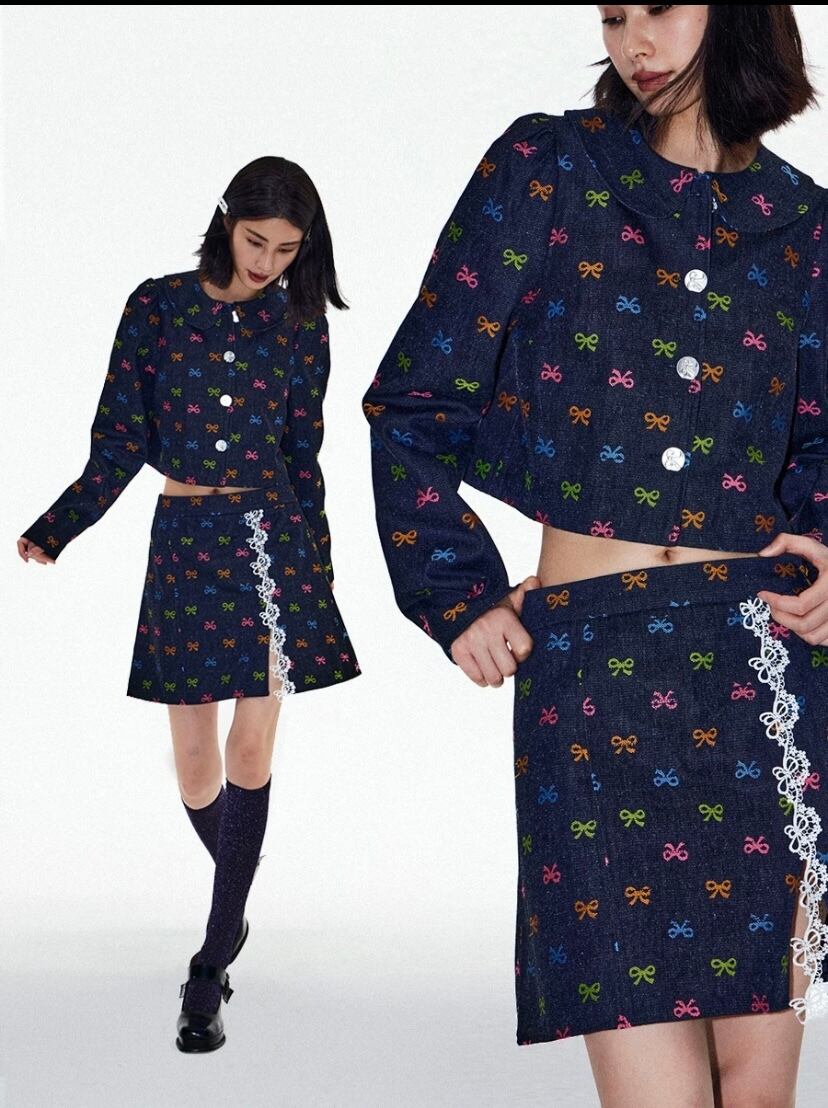 【セットアップ】デニム カラフル リボン ジャケット ミニスカート ボトムス コート